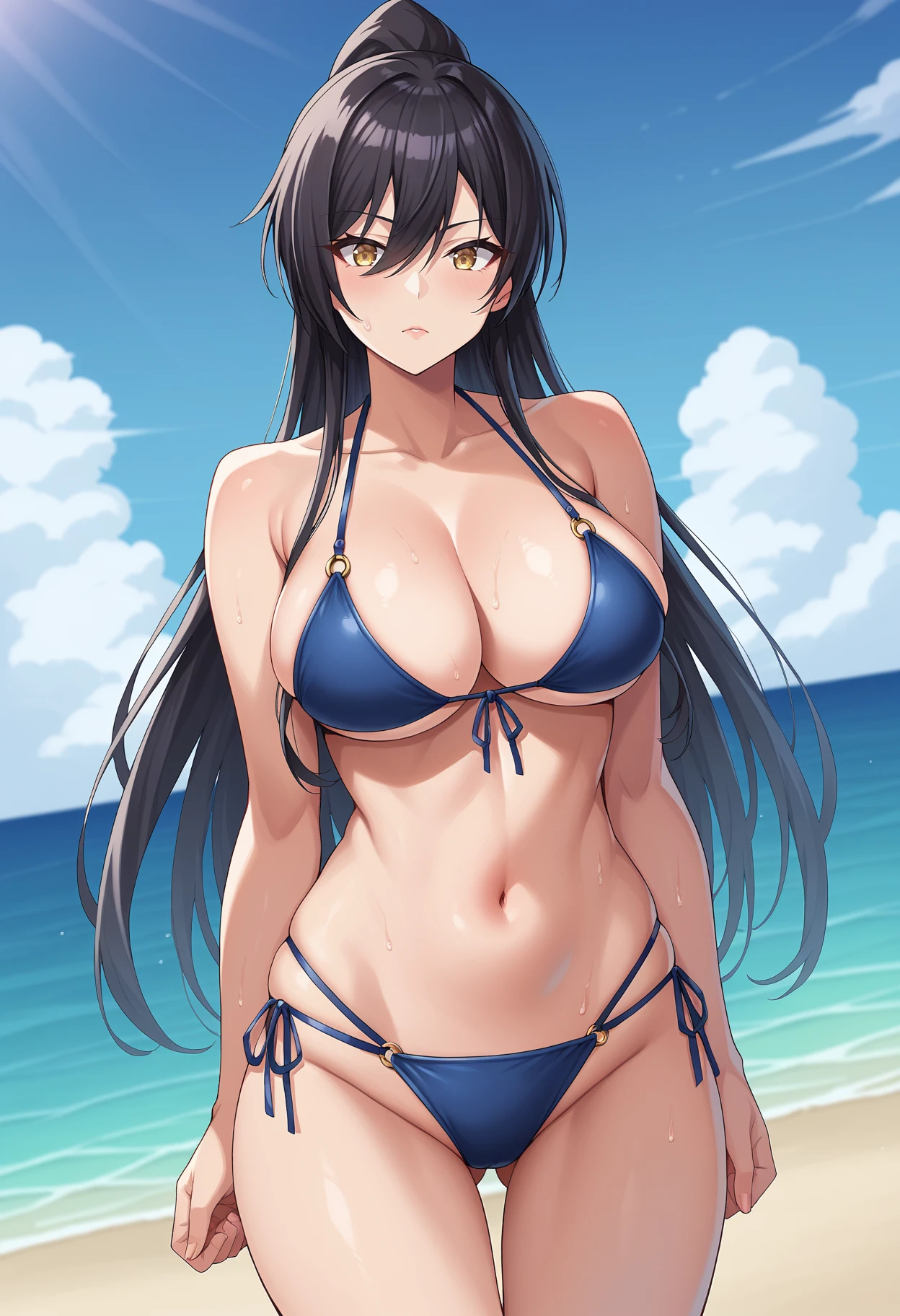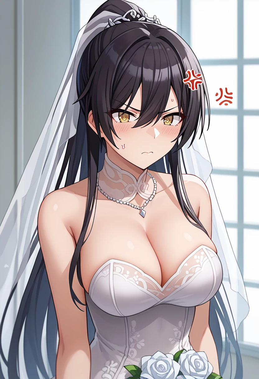 shirase sakuya, large breasts, black hair, long hair, high ponytail, yellow eyes,
