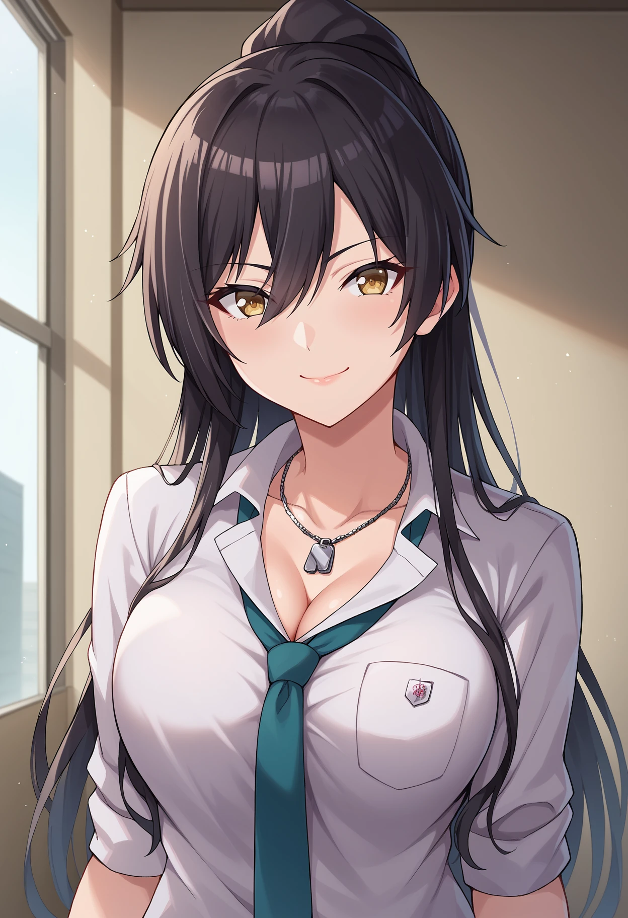 shirase sakuya, large breasts, black hair, long hair, high ponytail, yellow eyesDefault Outfit :