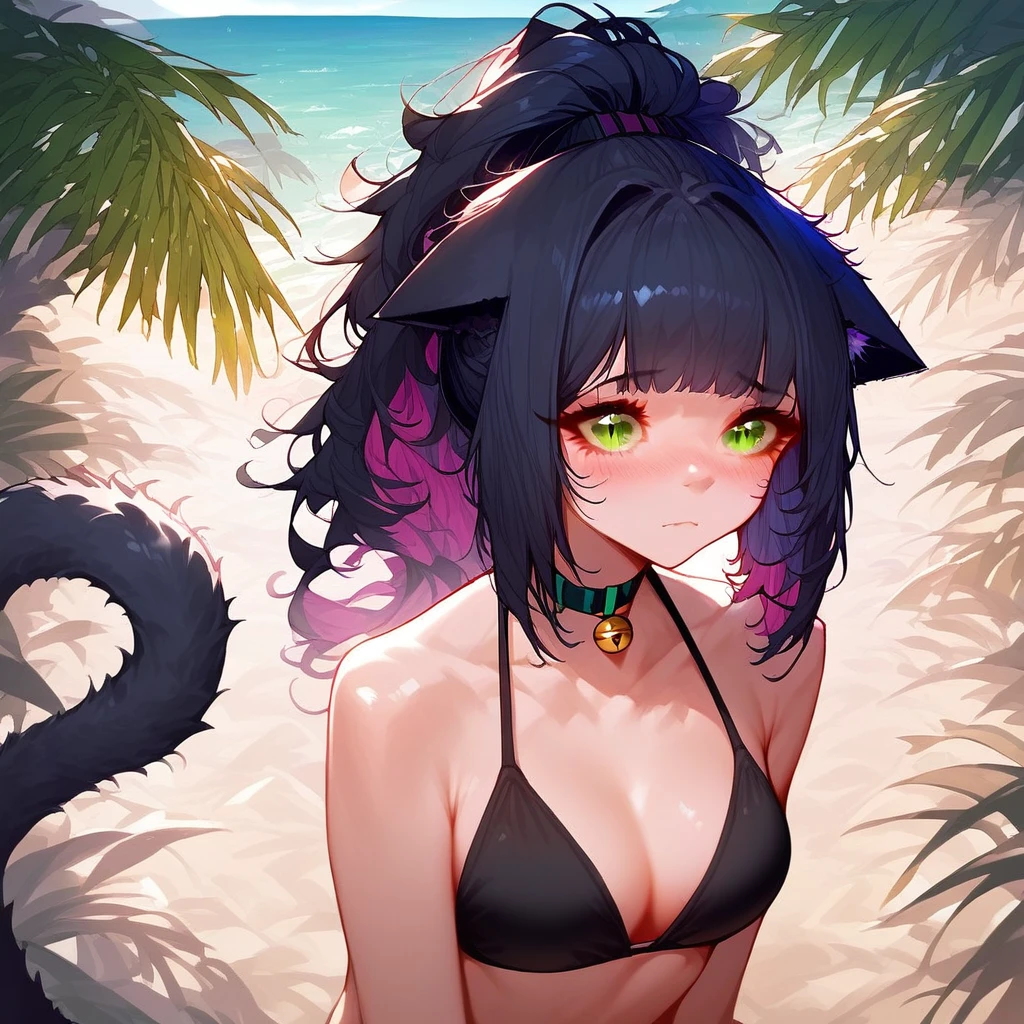 Jessica_Arknights, cat girl, ponytail, green eyes, long hair, choker, ponytail, flat cat ears, large cat tail, multicolored hair, black hair, dark purple inner hair, black jacket, belt, black shirt, black shorts, gloves, knee pads, black socks, black footwear