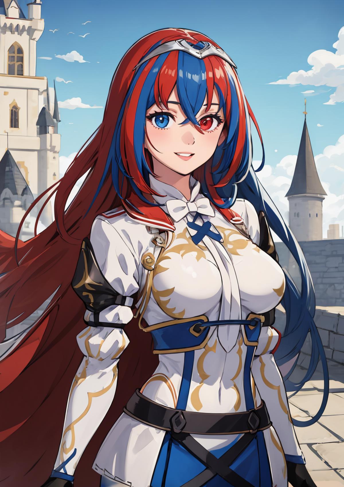 alear \(fire emblem\), heterochromia, crossed bangs, split-color hair, tiara, armor, gloves, jewelry, thighhighs, skirt, boots