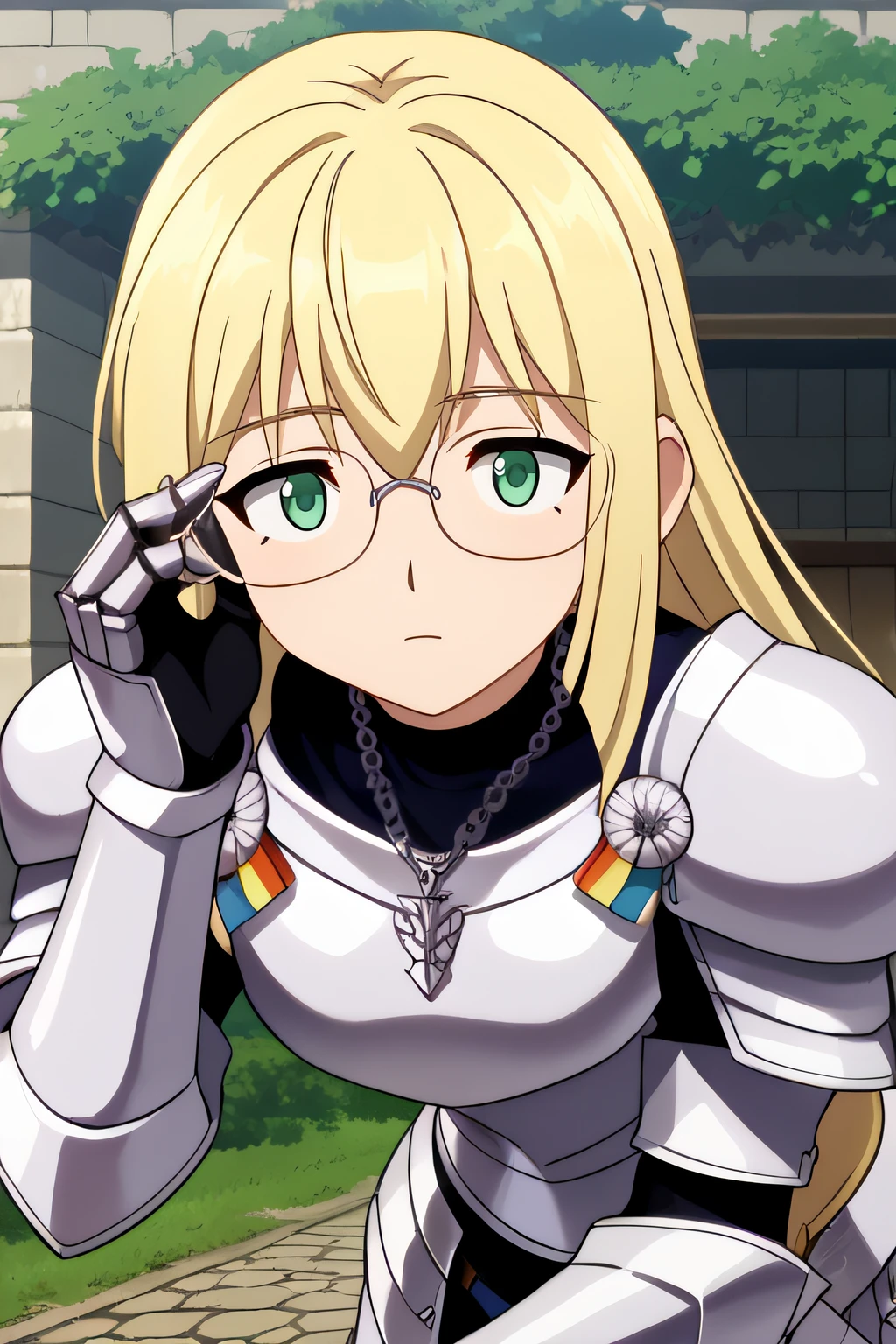 eanne, blonde hair, green eyes, glasses, necklace, armor, gauntlets, breastplate, knight, sheath, chainmail, armored boots, greaves
