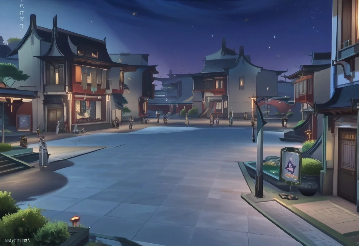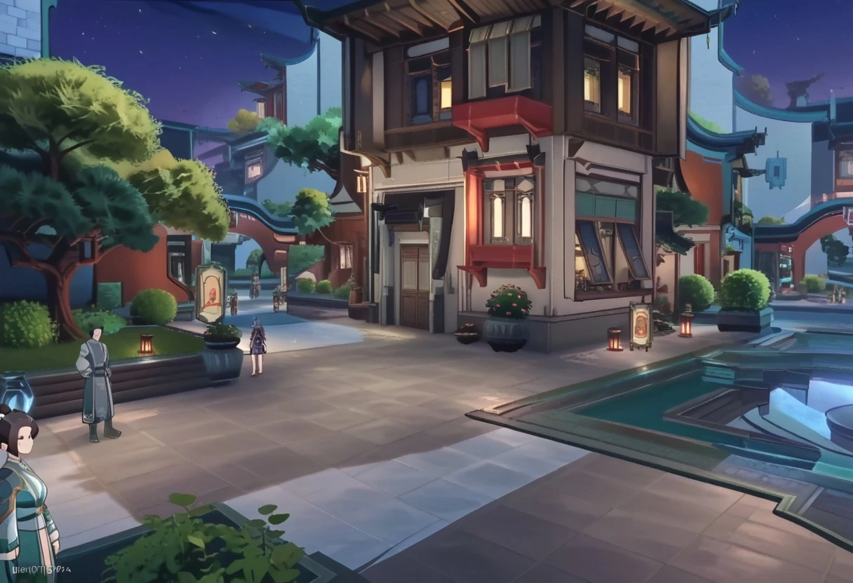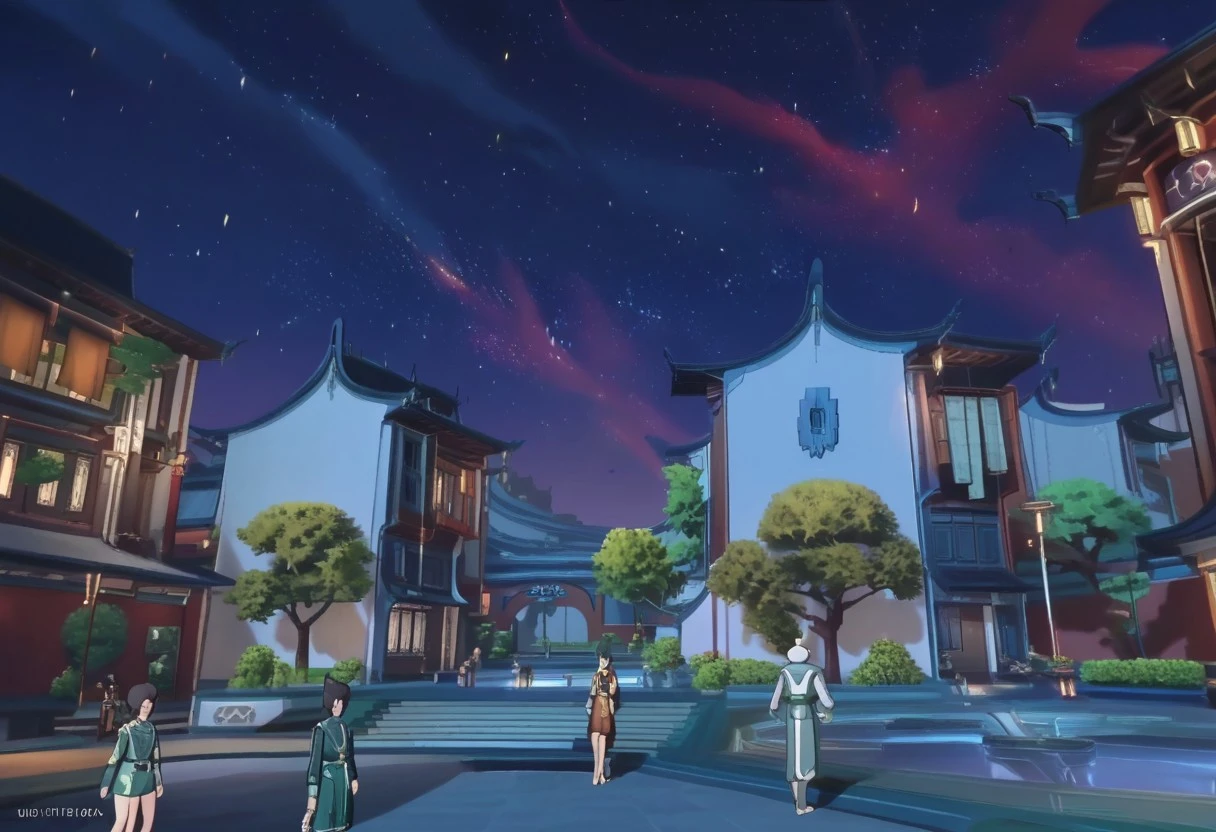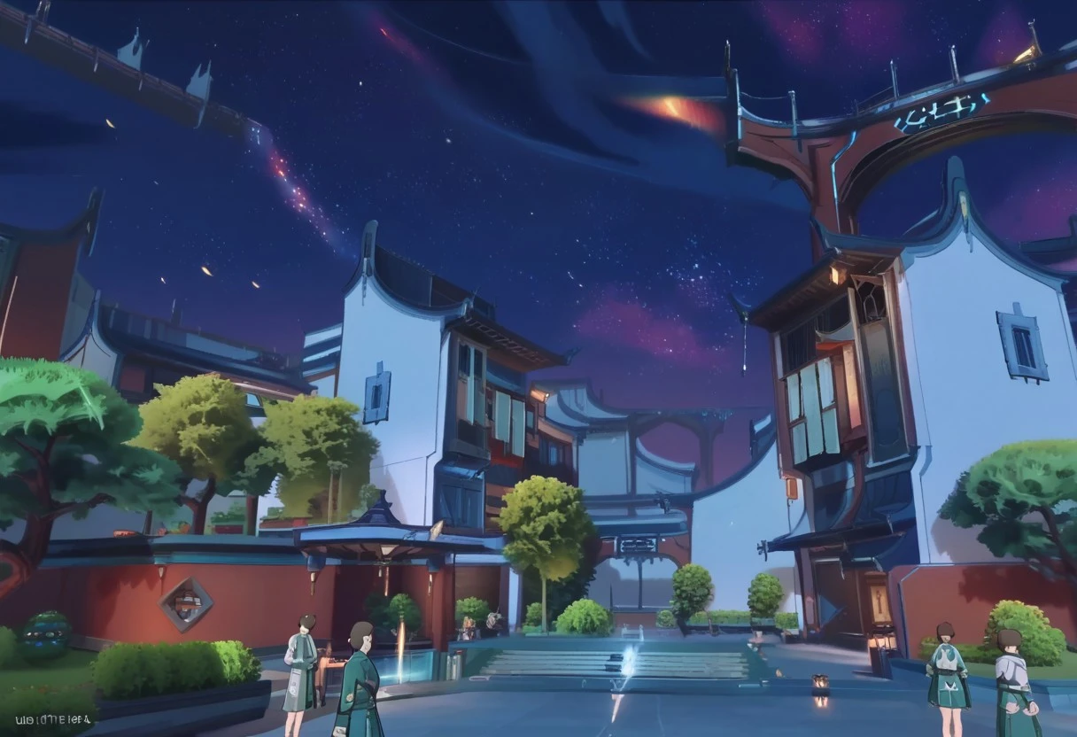 Exalting Sanctum, scenery, night, outdoors, archtecture, east asian archeitecture, tree, sky, building, people,