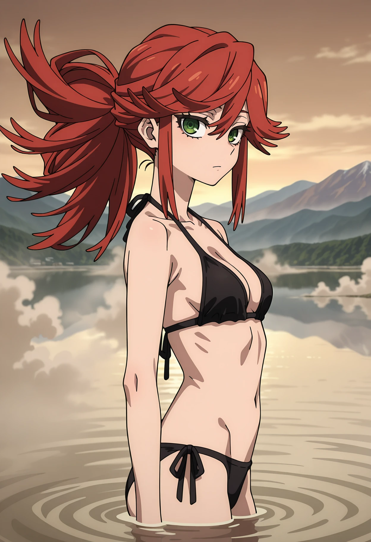 ponytail, spiked hair, long hair, red hair, green eyes