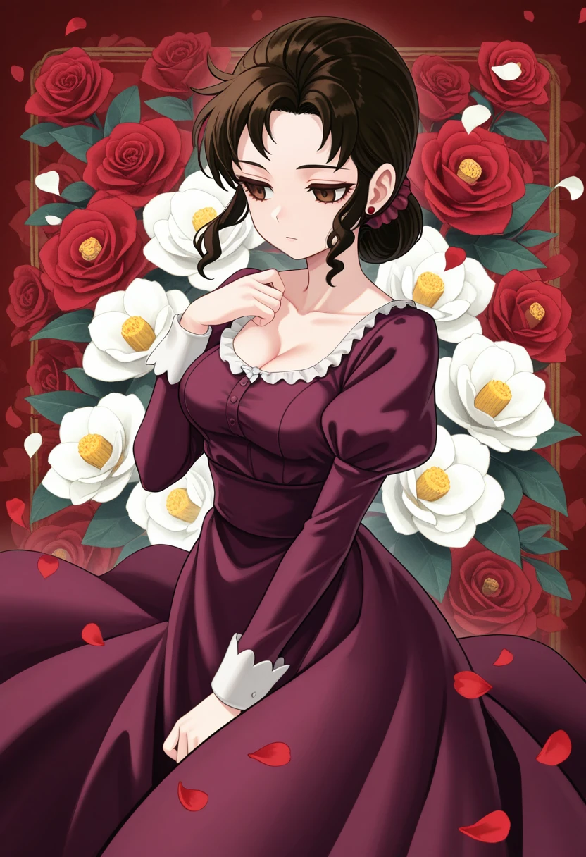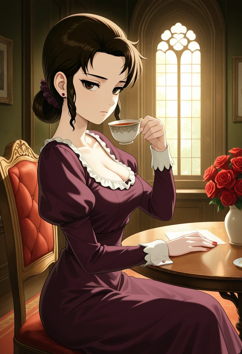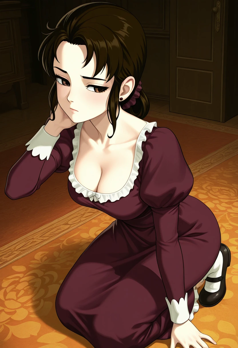 reiko_tsubakikouji, brown hair, brown eyes, single low hair bun, purple dress, juliet sleeves, scrunchie, puffy sleeves, cleavage, wavy sidelocks, mary janes