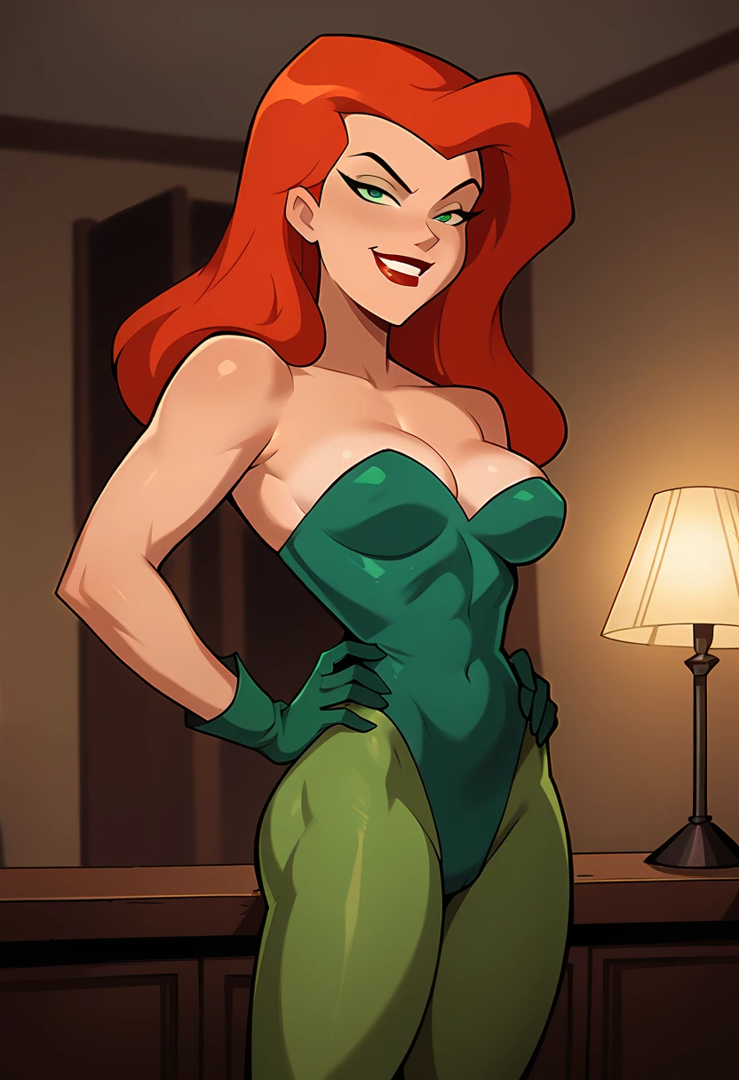 HSPoisonIvy, DC universe, Batman Animated Style, red hair, long hair, cleavage, medium breasts, wide hips, red lips, seductive, humanskin, green leotard, high heels, elbow gloves,