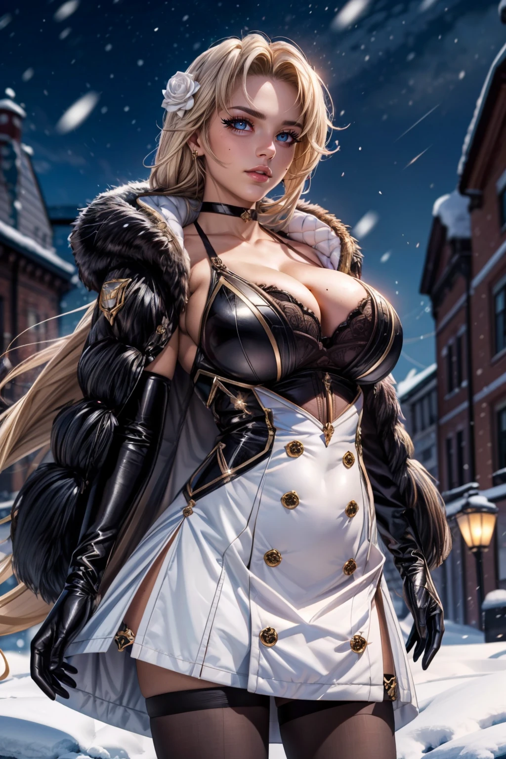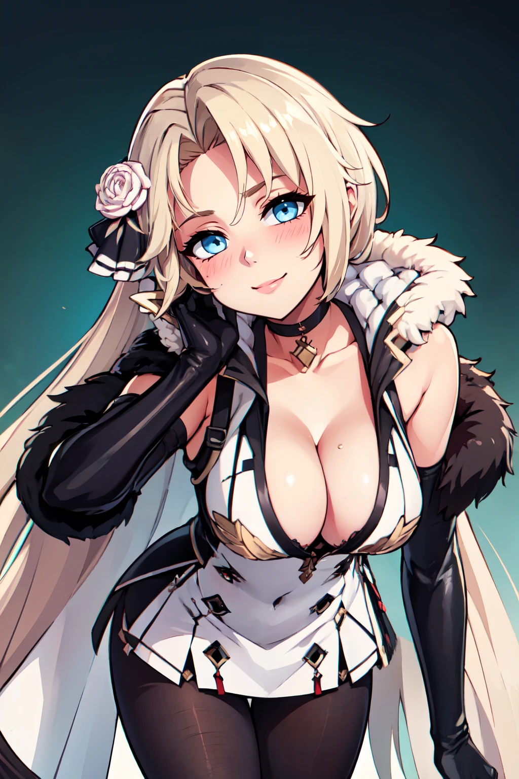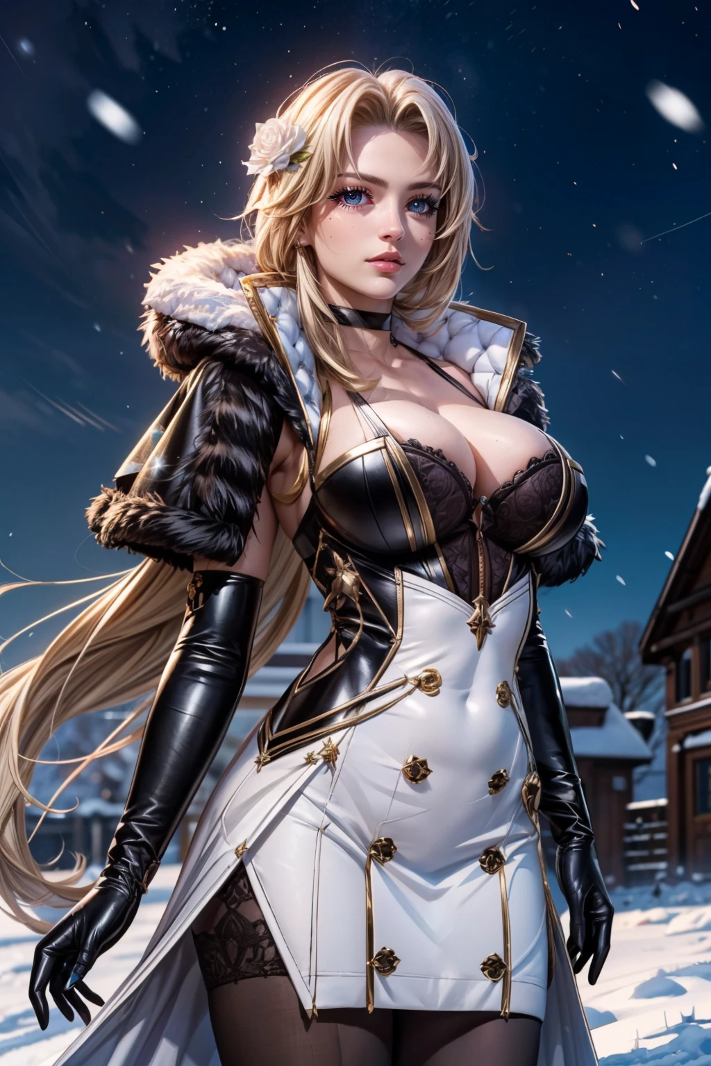 zzKronshtadt, blue eyes, long hair, blonde hair, very long hair, bangs, parted bangs, cleavage, white dress, black gloves, elbow gloves, black choker, black pantyhose, hair flower, fur-trimmed coat, white coat, white flower, collarbone,