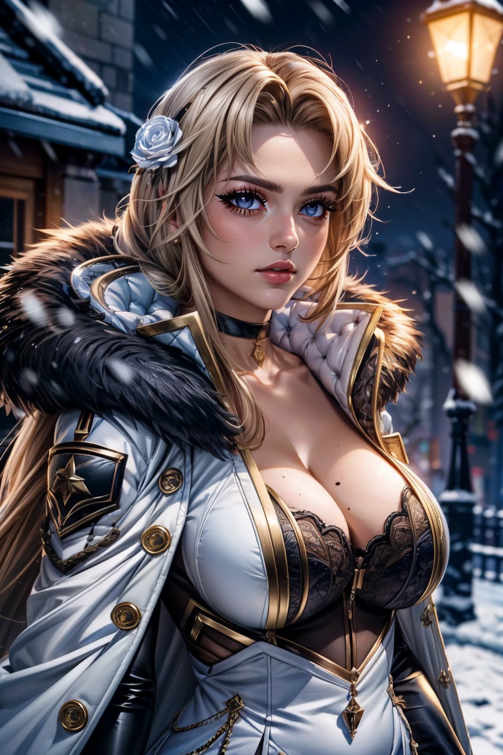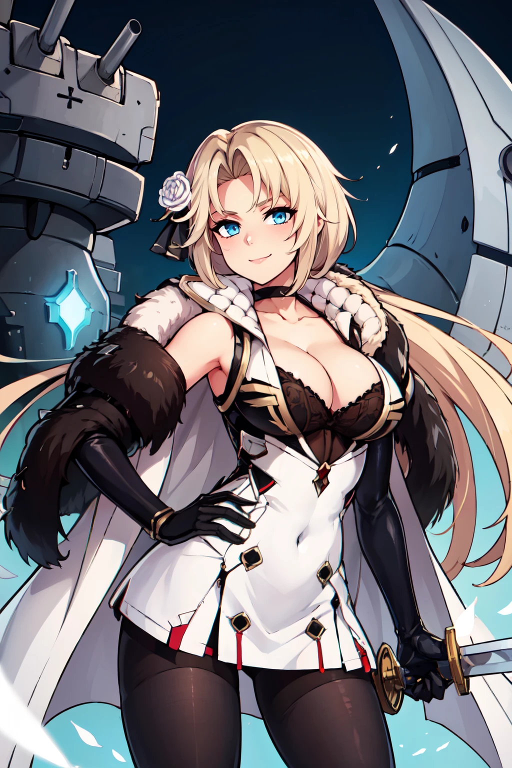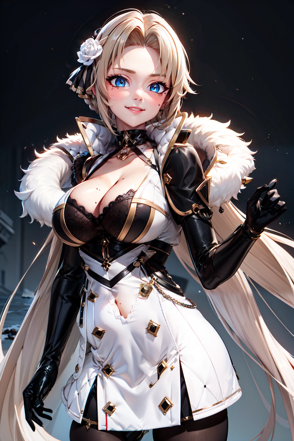 zzKronshtadt, blue eyes, long hair, blonde hair, very long hair, bangs, parted bangs, cleavage, white dress, black gloves, elbow gloves, black choker, black pantyhose, hair flower, fur-trimmed coat, white coat, white flower, collarbone,