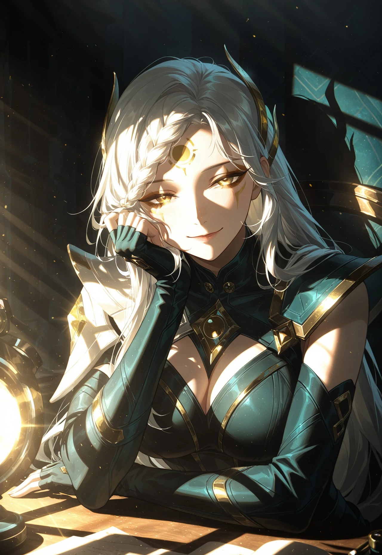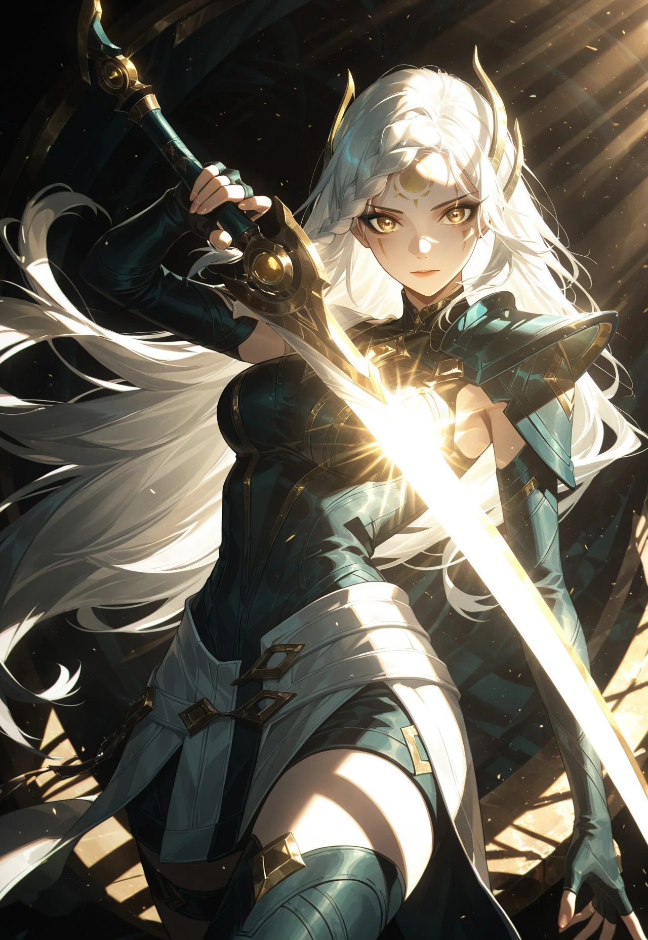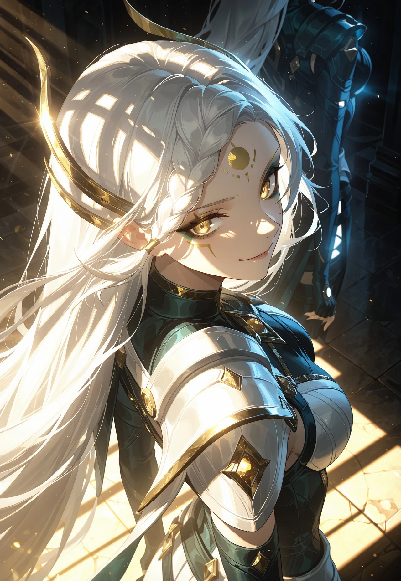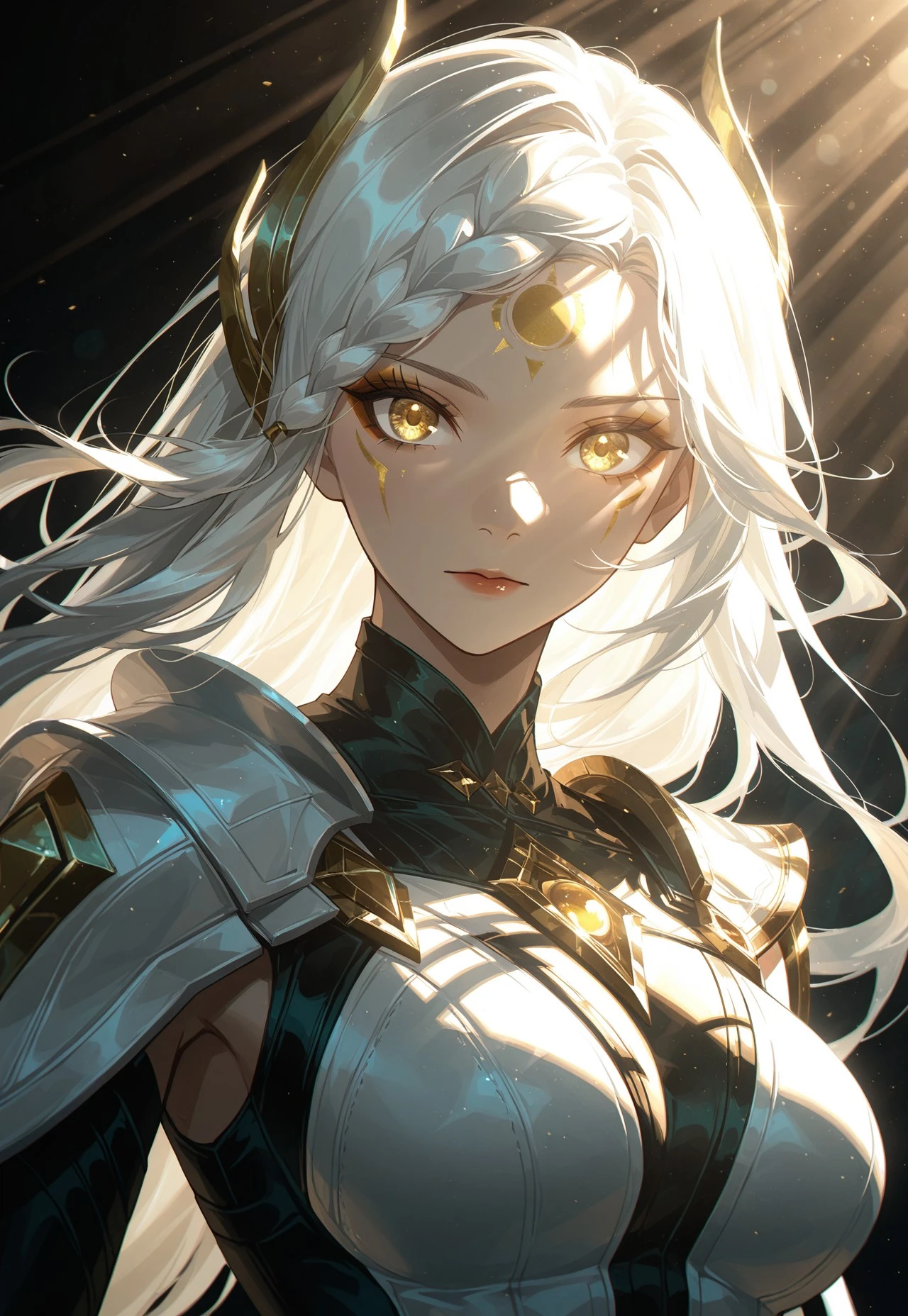 STdiana, long hair, white hair, braided bangs, hair ornaments, golden eyes, eye makeup, face marks, sentinel outfits, shoulder armor, detached sleeves, fingerless gloves, high boots, asymmetrical stockings,