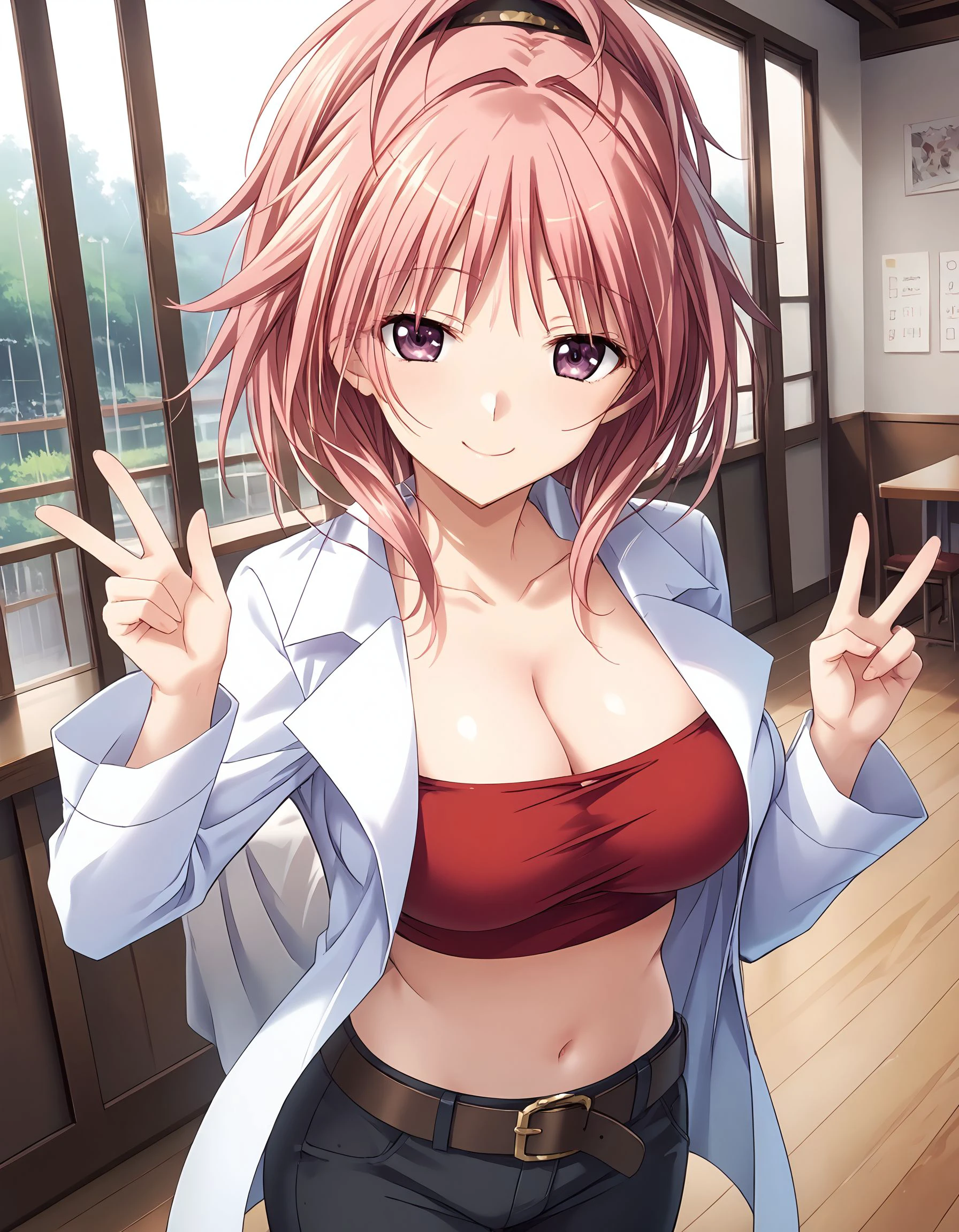 kimiko, pink hair, hair up, hair band, black band, purple eyes, large breasts, mature female,
