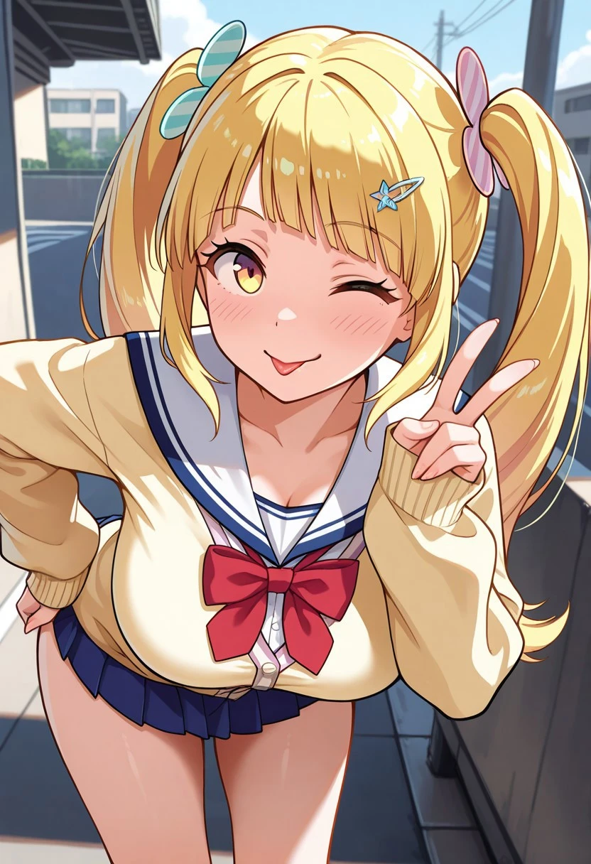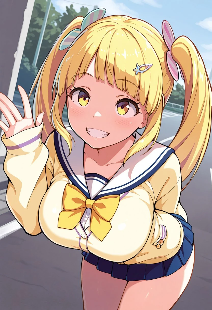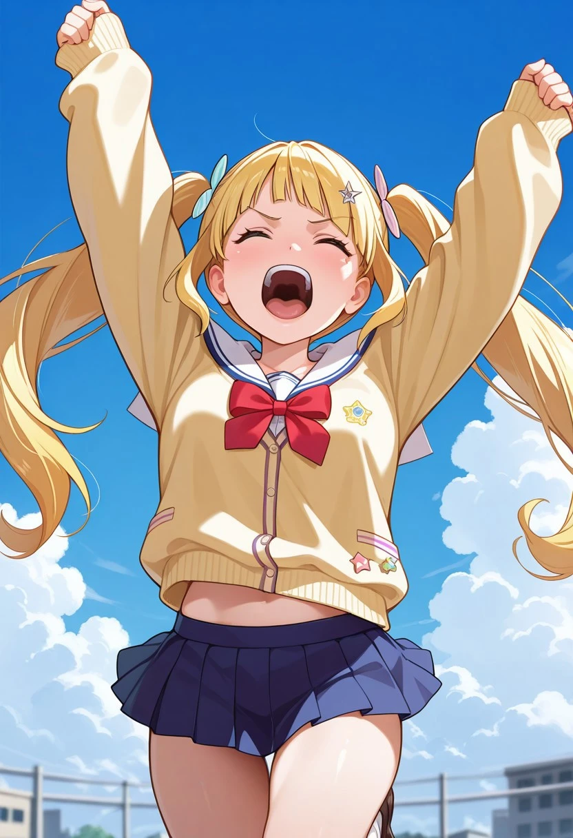 school uniform, yellow cardigan, sleeves past wrists, sailor collar, blue skirt, microskirt