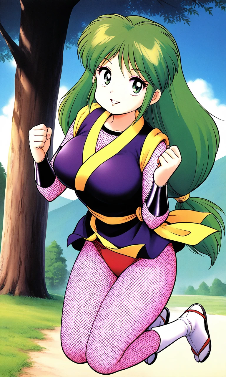 Yae(bonbon), 1girl, solo, green hair, bangs, green eyes, large breasts, short hair, ponytail,