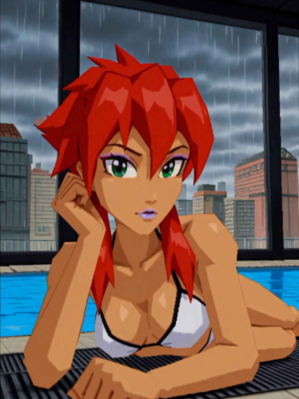 helper tags: dark-skinned female, red hair, short hair, long locks, green eyes, makeup, lavender lips