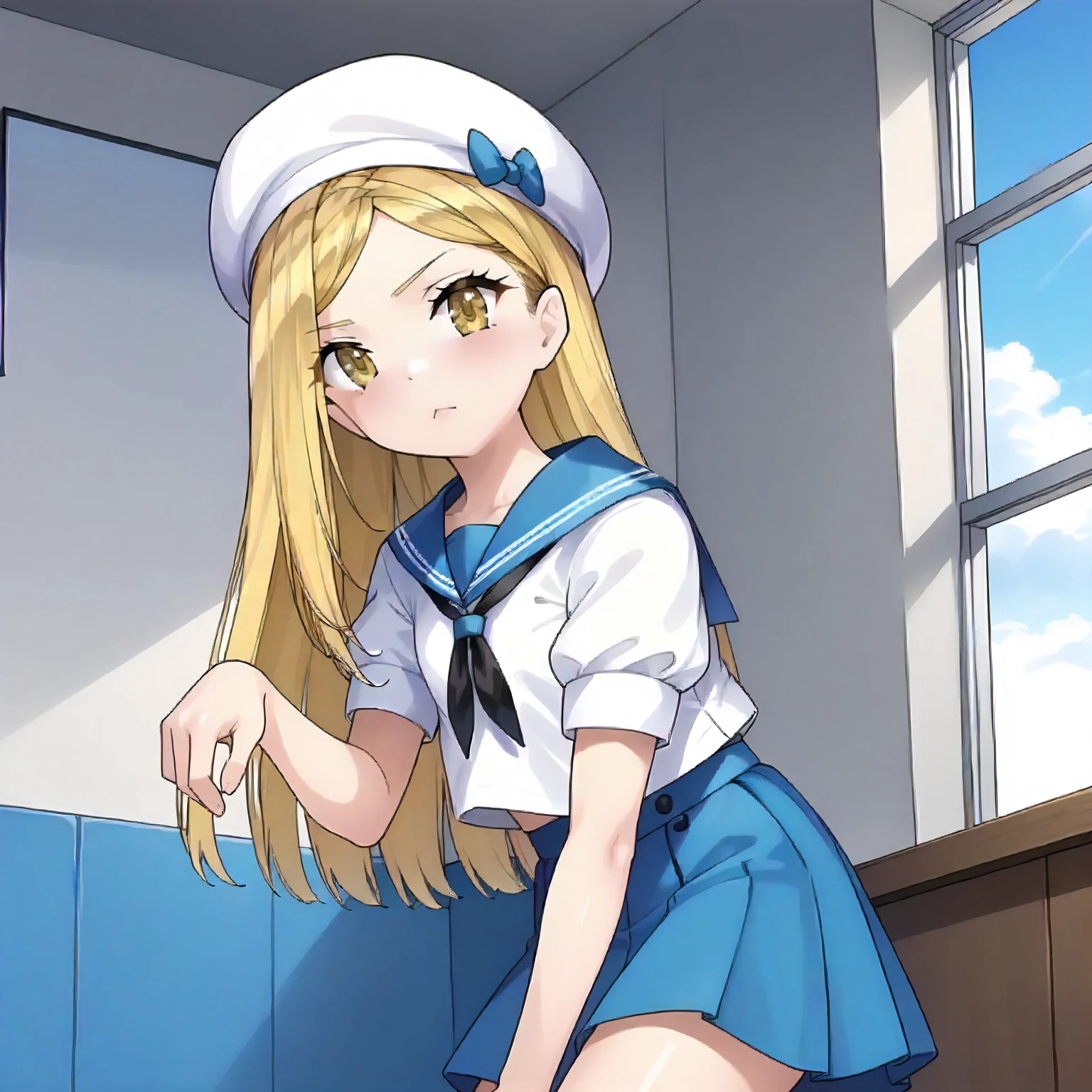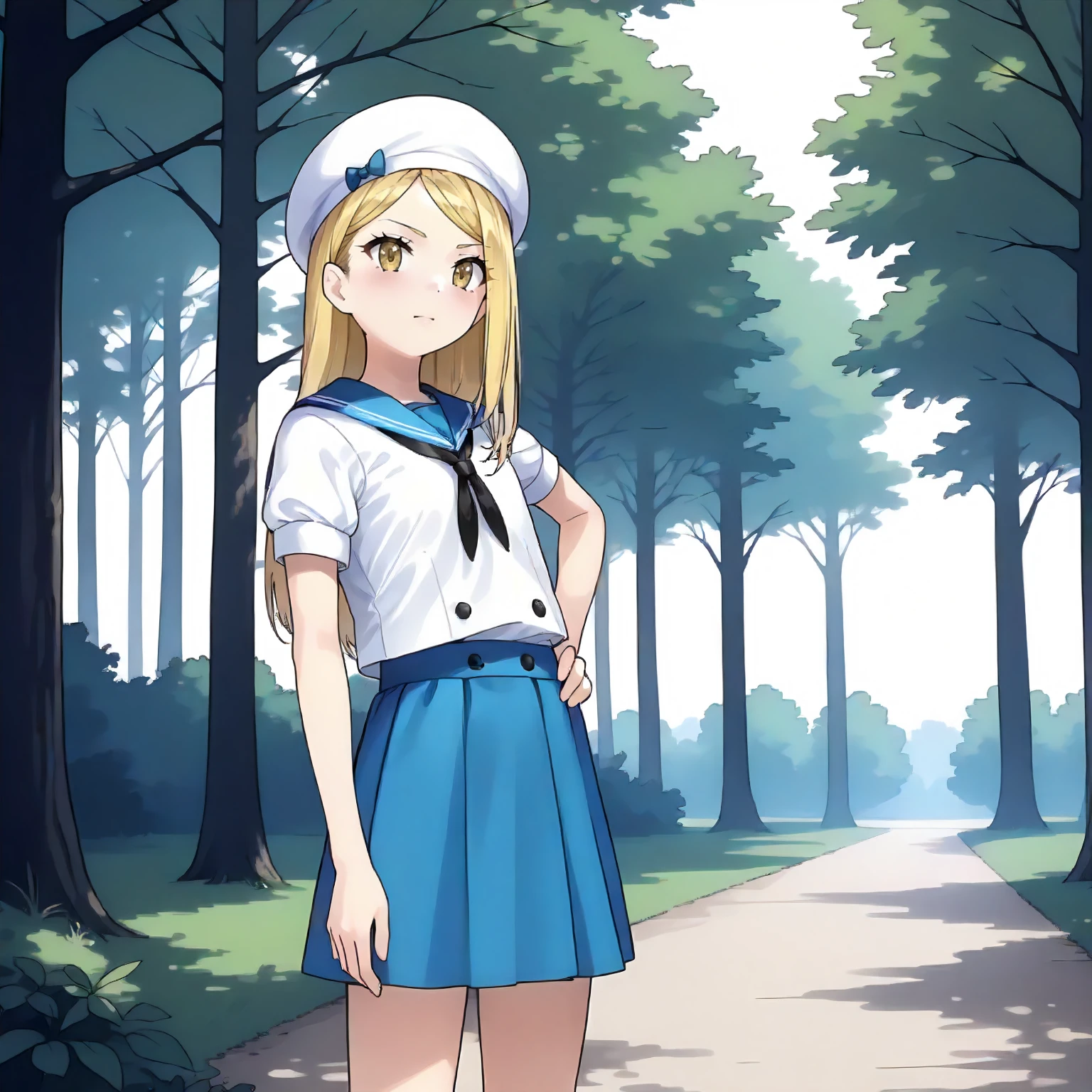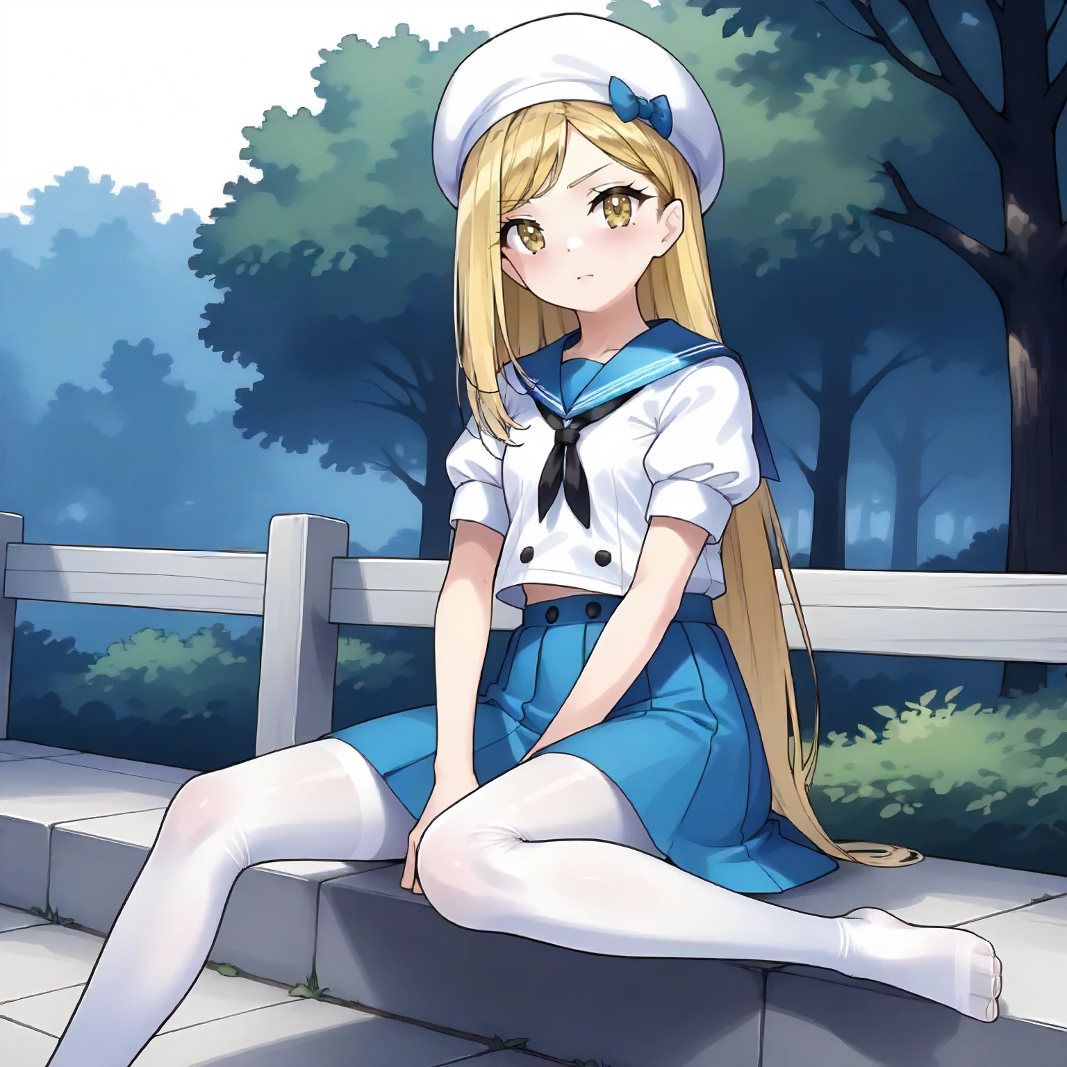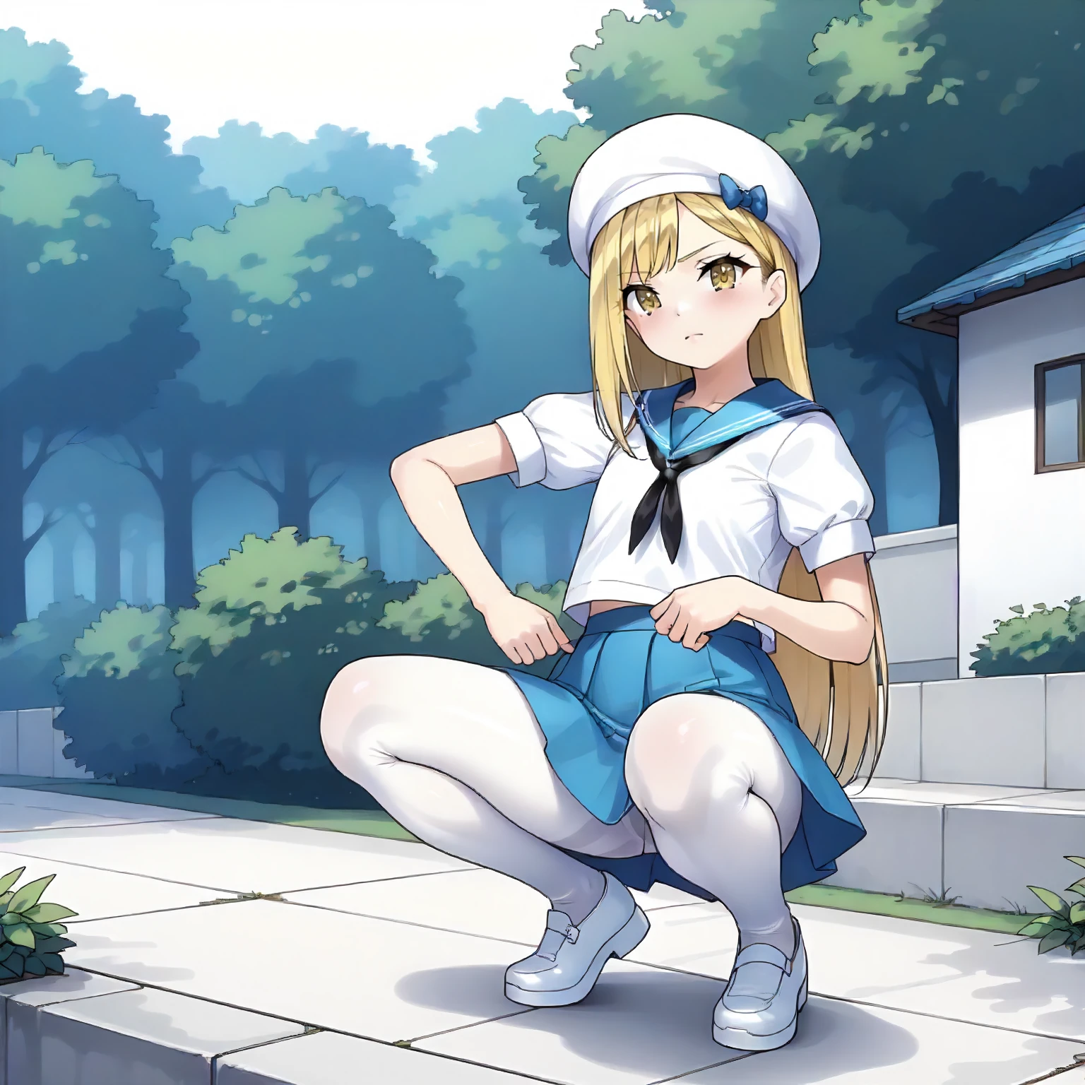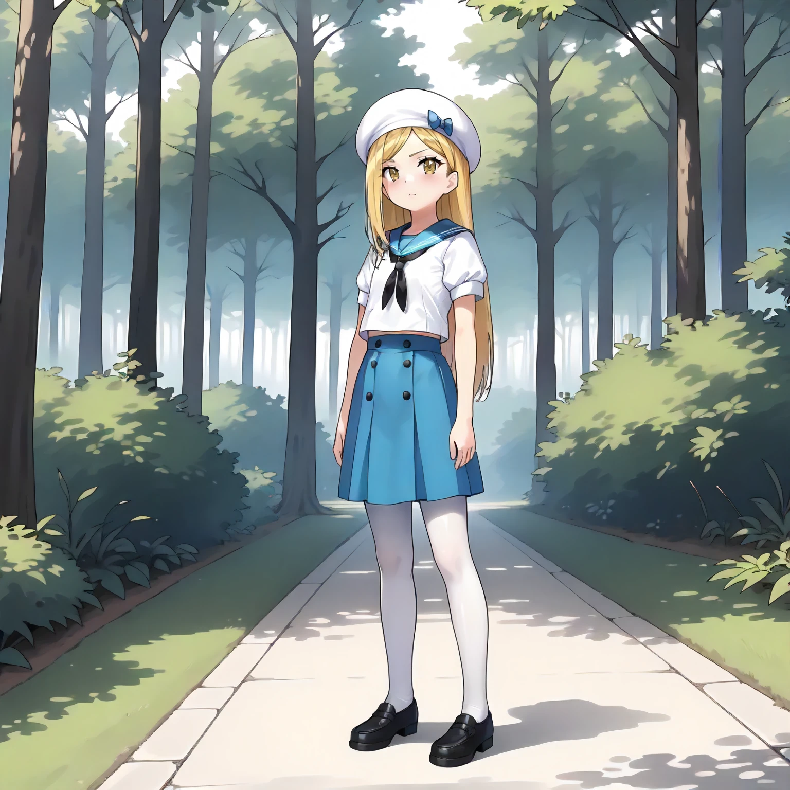 white beret, sailor_collar,short_sleeves, blue suspender,blue skirt, white_pantyhose,