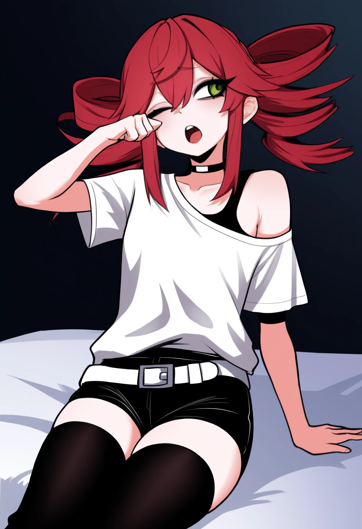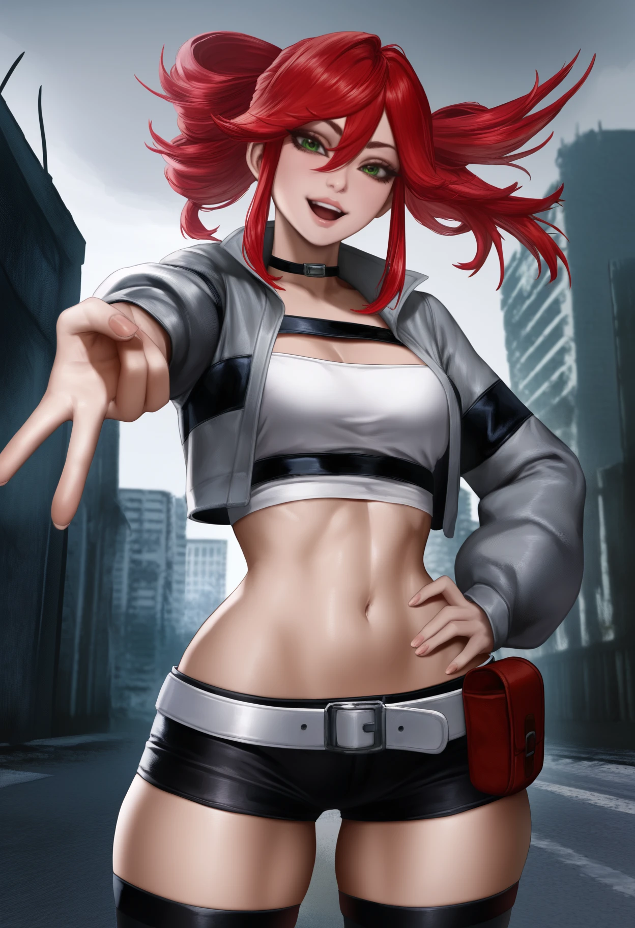 Default Outfit: choker, grey jacket, cropped jacket, , long sleeves, white bandeau, , black shorts, short shorts, white belt, belt pouch, black thighhighs, midriff, navel