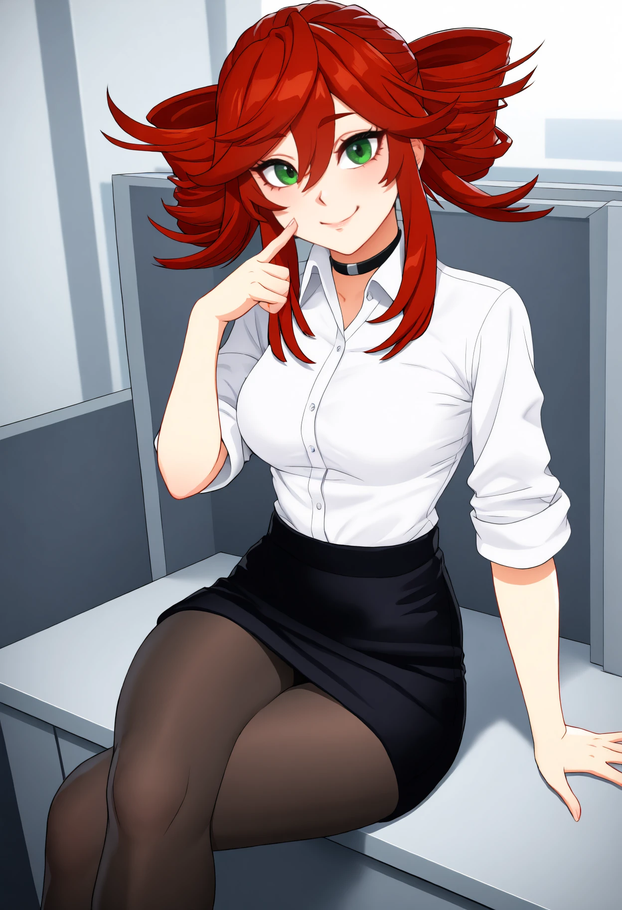 Appearance: long hair, red hair, hair between eyes, drill hair, twintails, green eyes