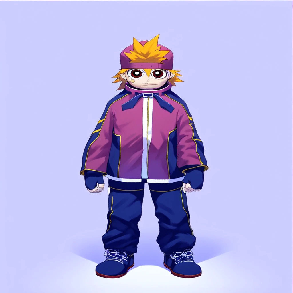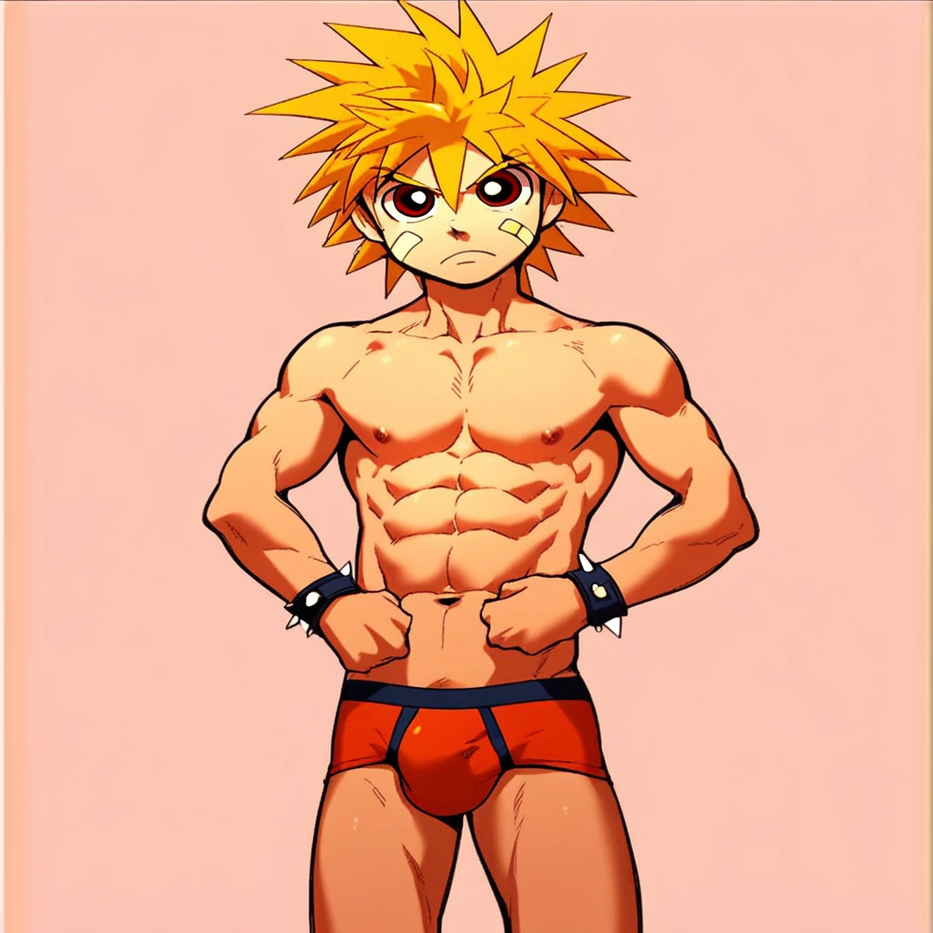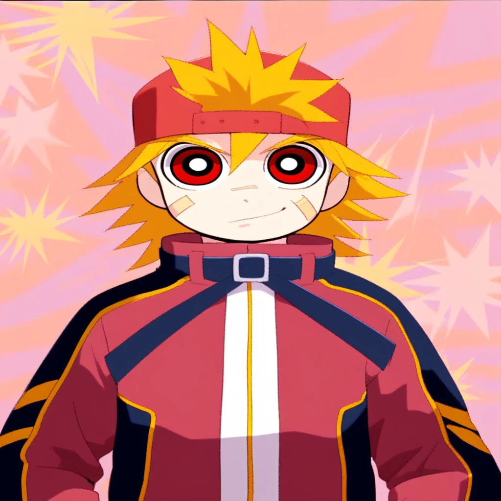 Br1ck, solo, 1boy, male focus, blonde hair, red eyes, spiked hair, bandaid, bandaid on face, hat,