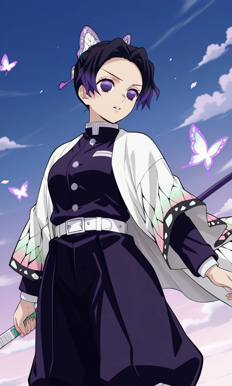 kochou shinobu ,1girl,solo.short hair, forehead, multicolored hair, black hair, purple hair, purple eyes, butterfly hair ornament, white haori,black jacket, wide sleeves, buttons, white belt, puffy pants, black pants