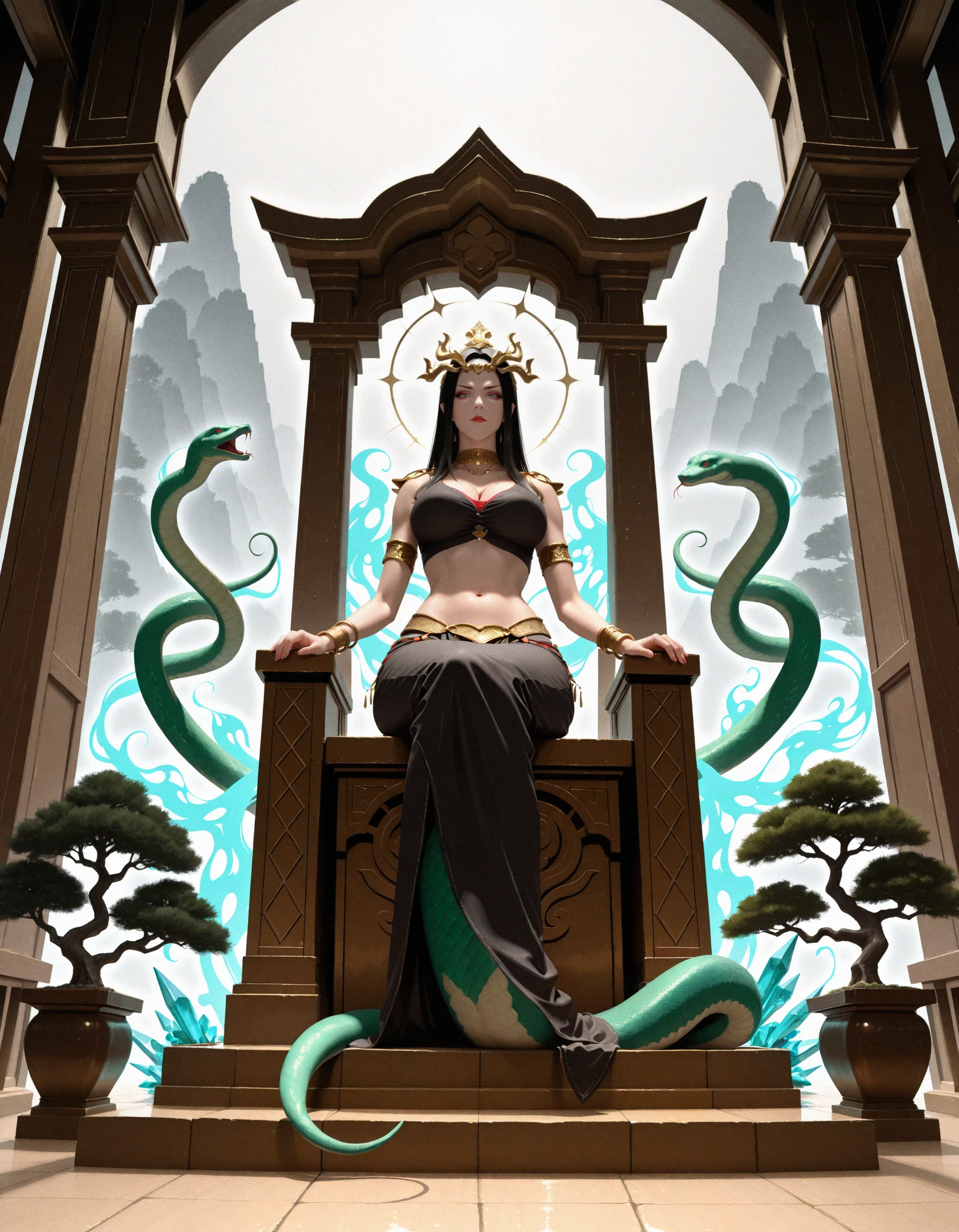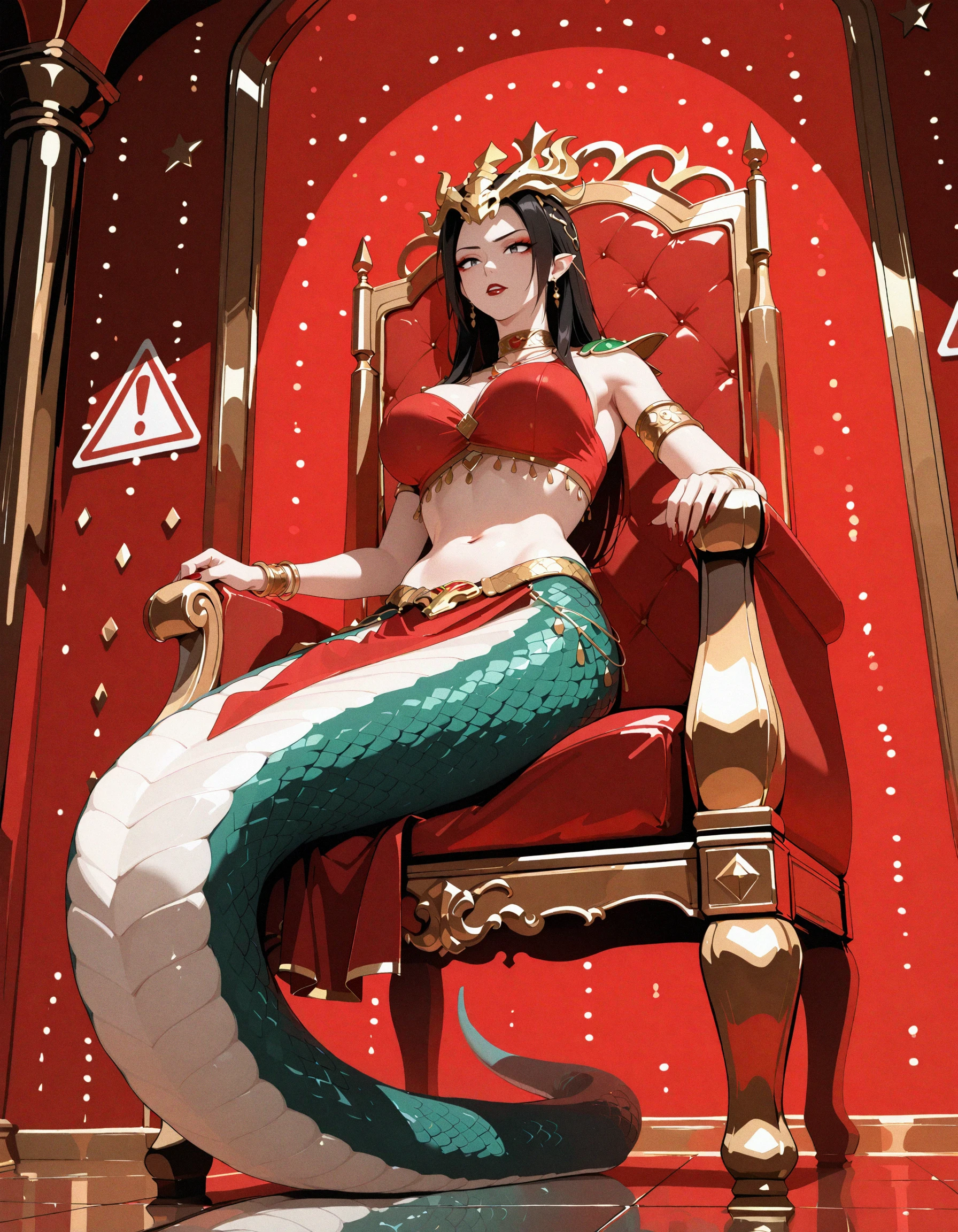 cai lin medusa, queen medusa, snake form, snake tail, naga, snake tribe outfit, belly dancer outfit, crop top, ???? midriff, crown, long black hair, 1girl, solo, snake, jewelry, midriff, navel, throne, ???????, lamia, full body,