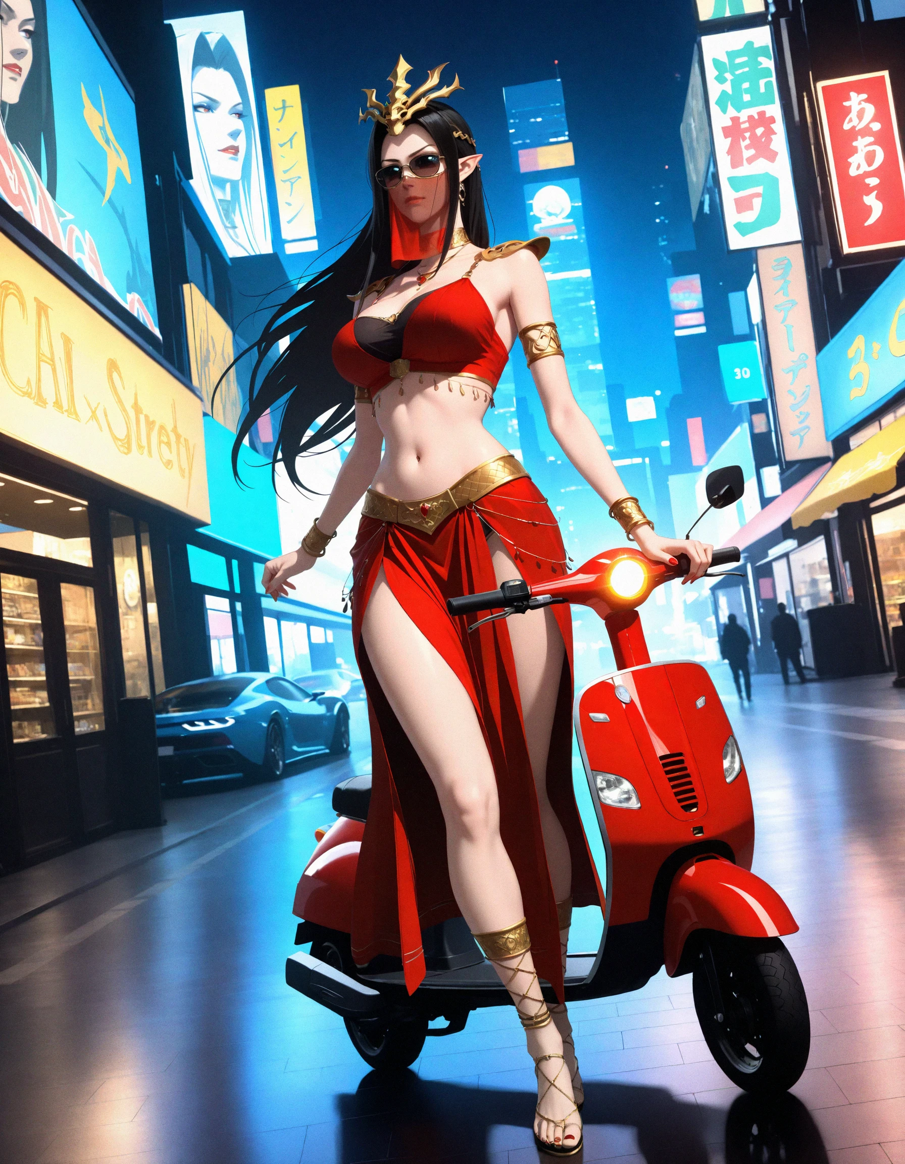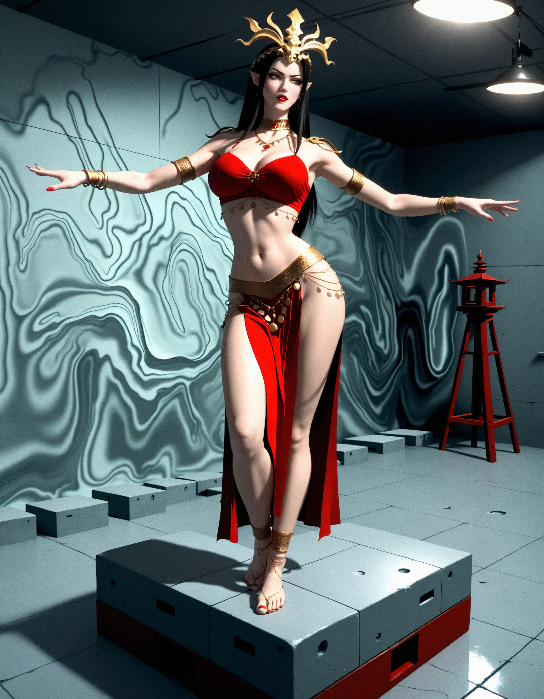 cai lin medusa, snake tribe outfit, belly dancer outfit, red crop top, ???? midriff, crown, long black hair, 1girl, solo, jewelry, navel, ???????, full body, dynamic angle, pointy ears, red skirt,
