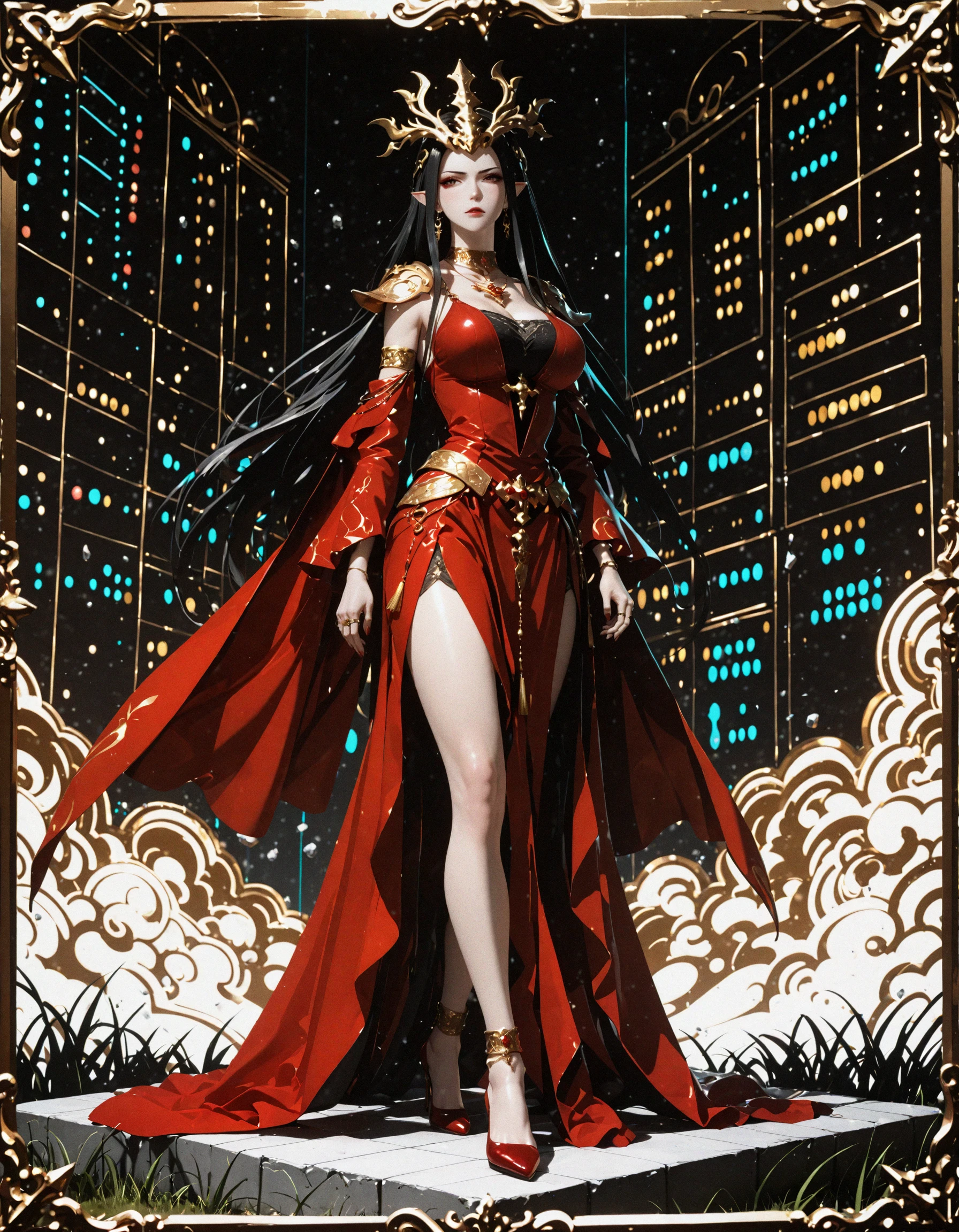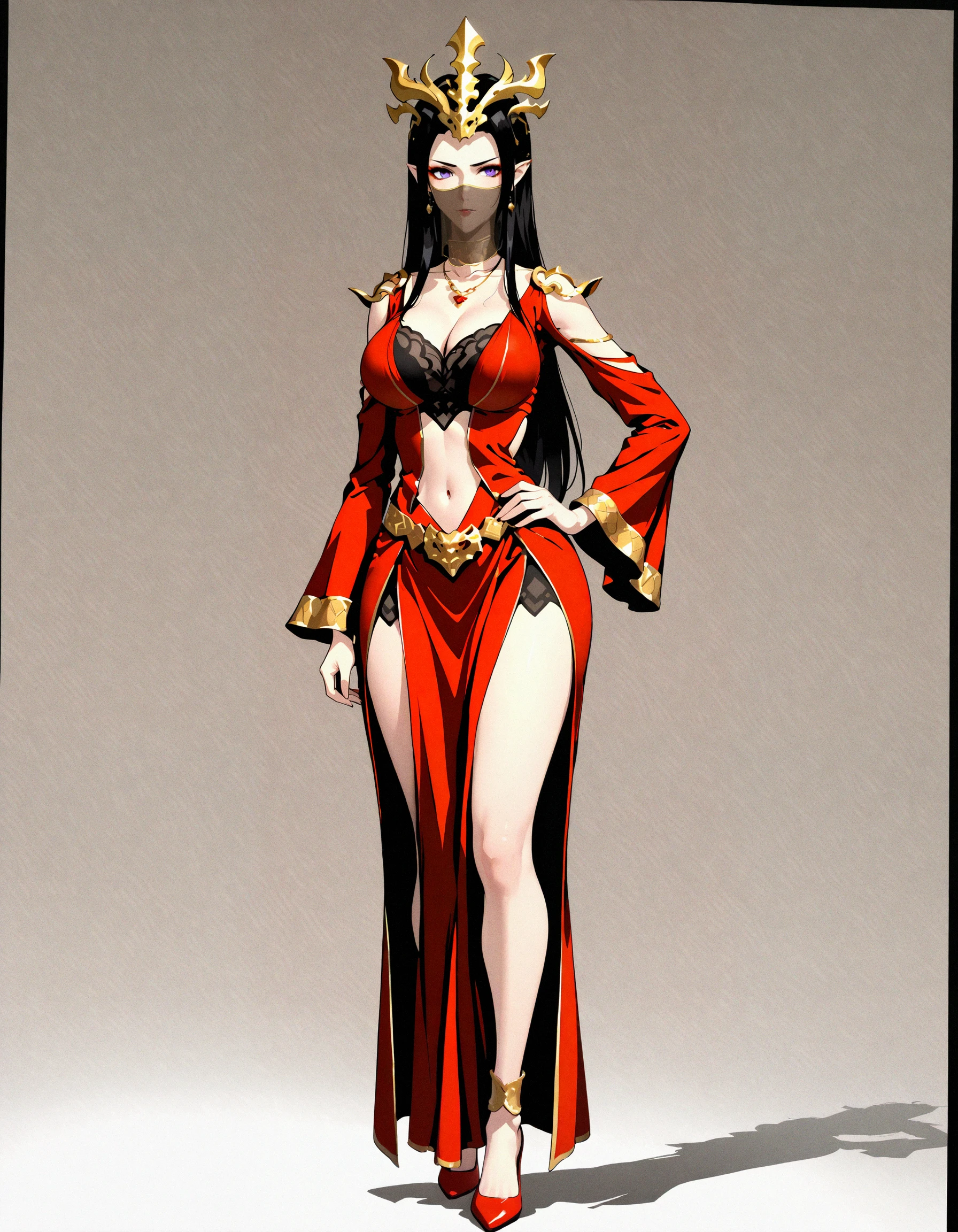 cai lin medusa, queen medusa, red battle dress, ornate clothing, bell sleeves, crown, jewelry, gold trim, long black hair, purple eyes, pointy ears, 1girl, solo, black hair, ???????, clothing cutout, navel, dress, long hair, hand on hip, navel cutout, necklace, earrings, cleavage, red dress, parted bangs, full body,