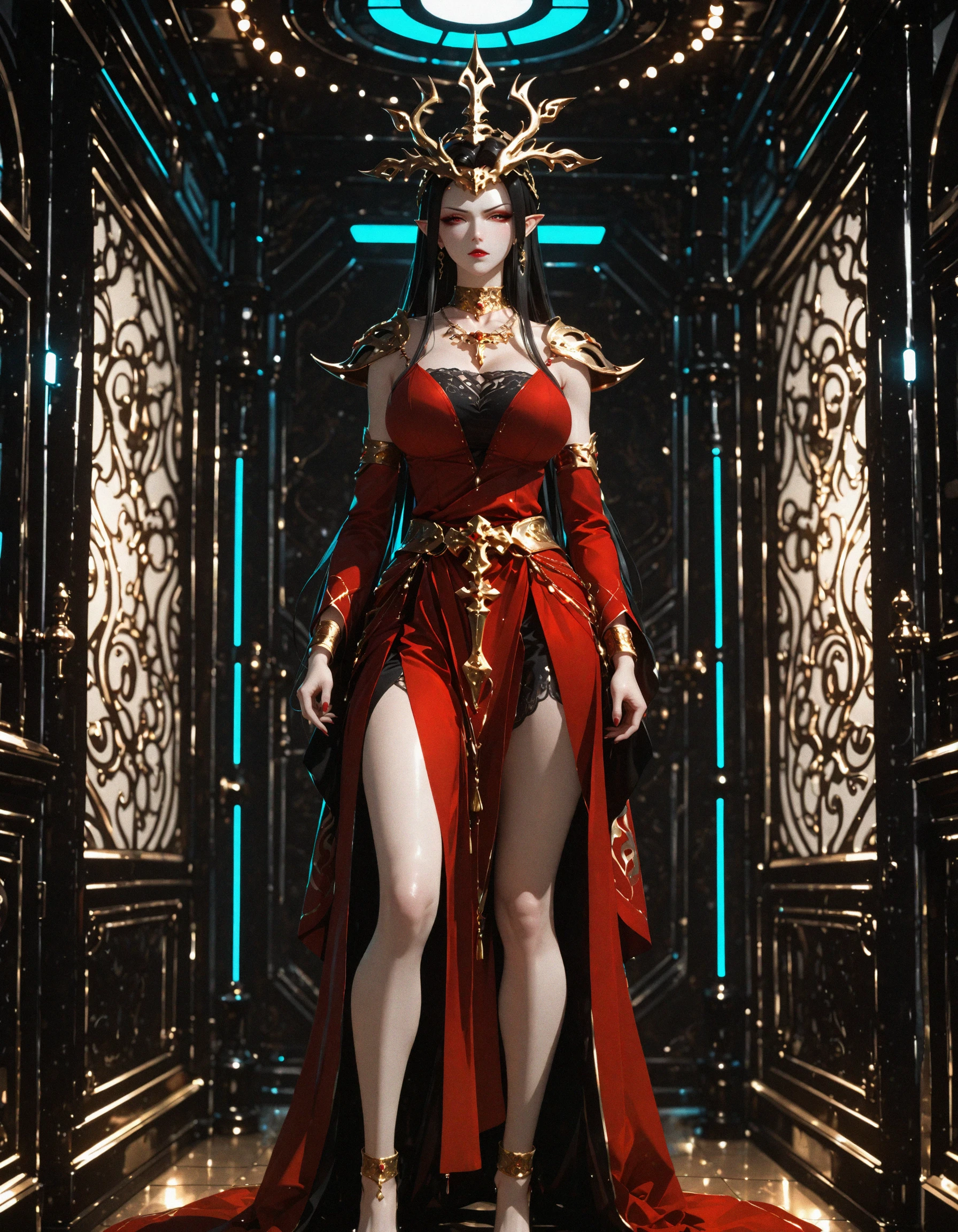 cai lin medusa, queen medusa, ceremonial gown, CGI, 3D render, crown, ornate jewelry, thigh-high slit, red dress, 1girl, dress, solo, ???? legs, black hair, full body, long hair, hair ornament, jewelry, pointy ears, phoenix motif, ornate headdress, intricate patterns, gold accessory, gold accents, pauldrons, xianxia style, gold filigree crown, arm cape, anklet, snake earrings,
