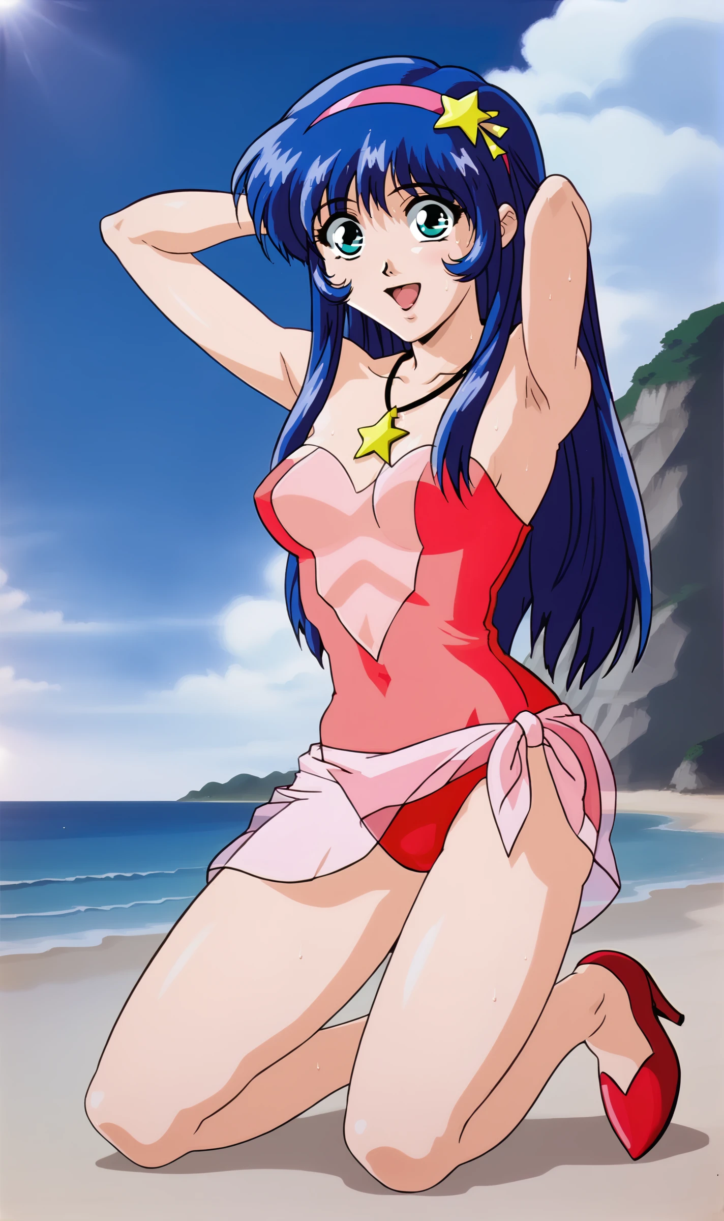 Outfit 2-'pink hairband, star necklace, pink strapless swimsuit, pink sarong, see-through, red heels,'