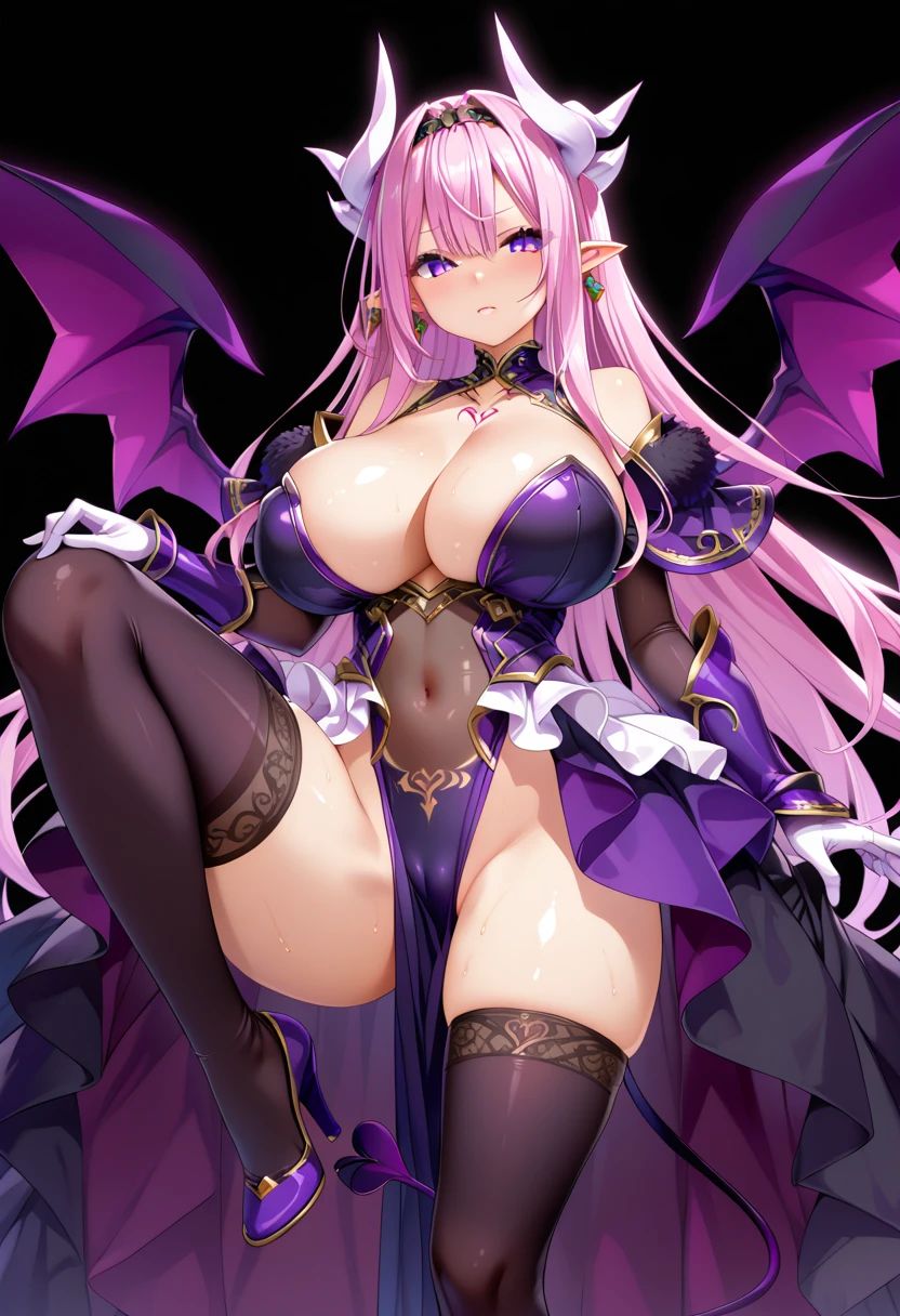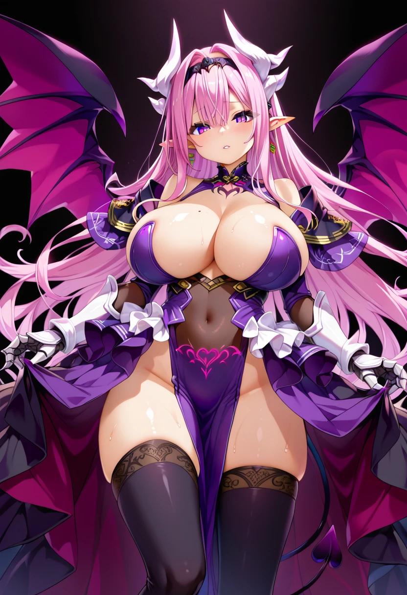 <lora:luxiel-01:0.9>, 1girl, luxiel, demon girl, white demon horns, demon wings, dress, horns, pink hair, very long hair, hairband, hair intakes, pointy ears, purple eyes, purple hair, hairband, cleavage tattoo, neck tattoo, slit pupils, demon tail, black thighhighs, thighhighs, pelvic curtain, thong, gloves, gauntlets, (purple highheel:0.9), tail, covered pubic tattoo, covered_navel,