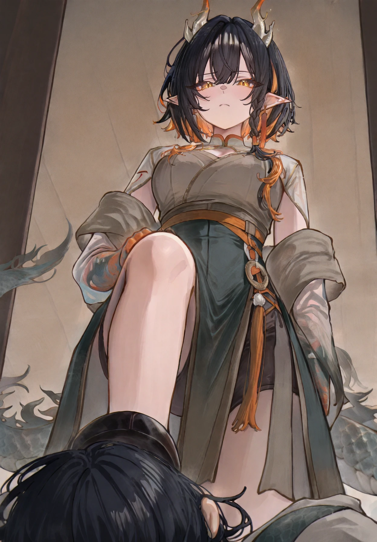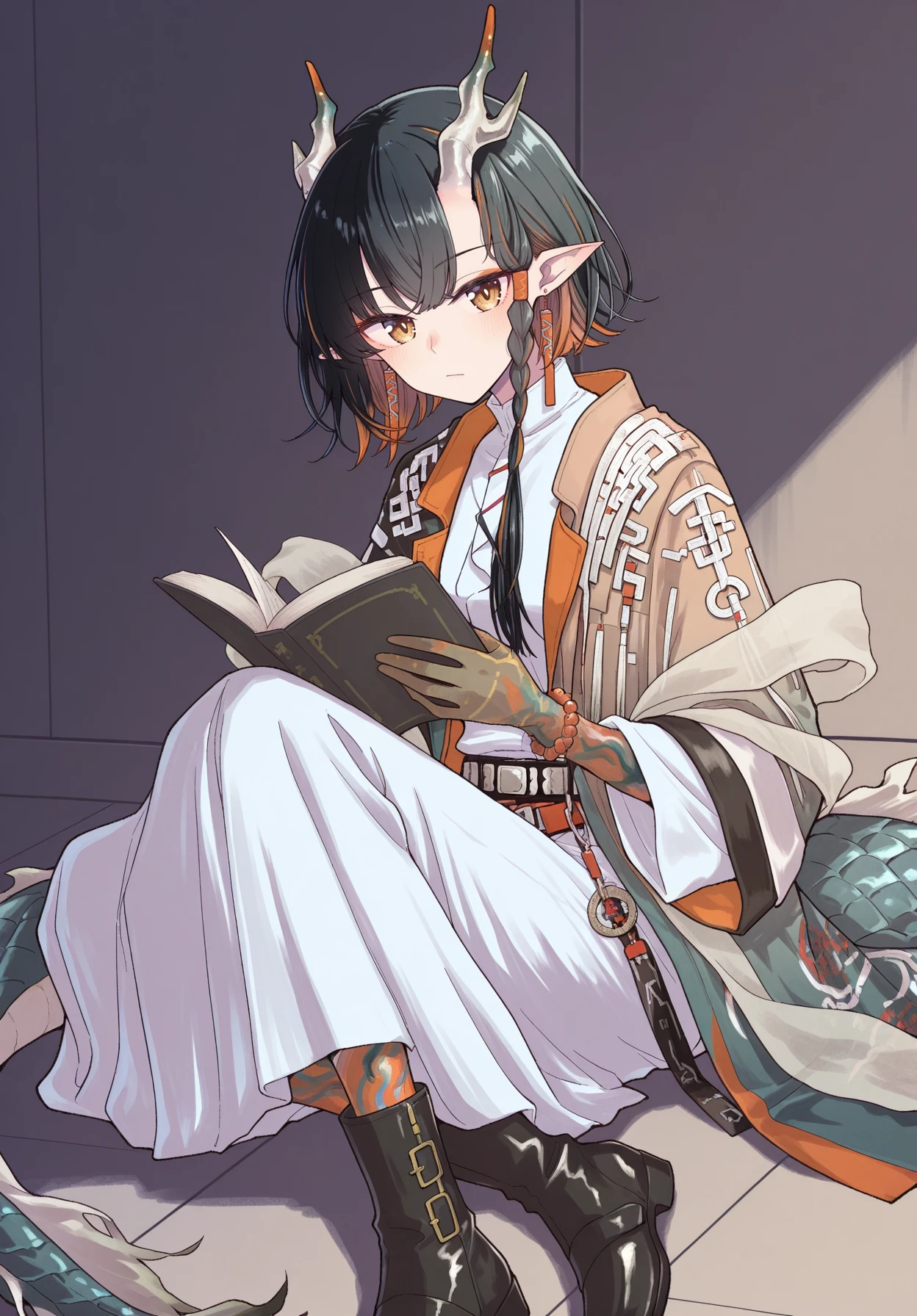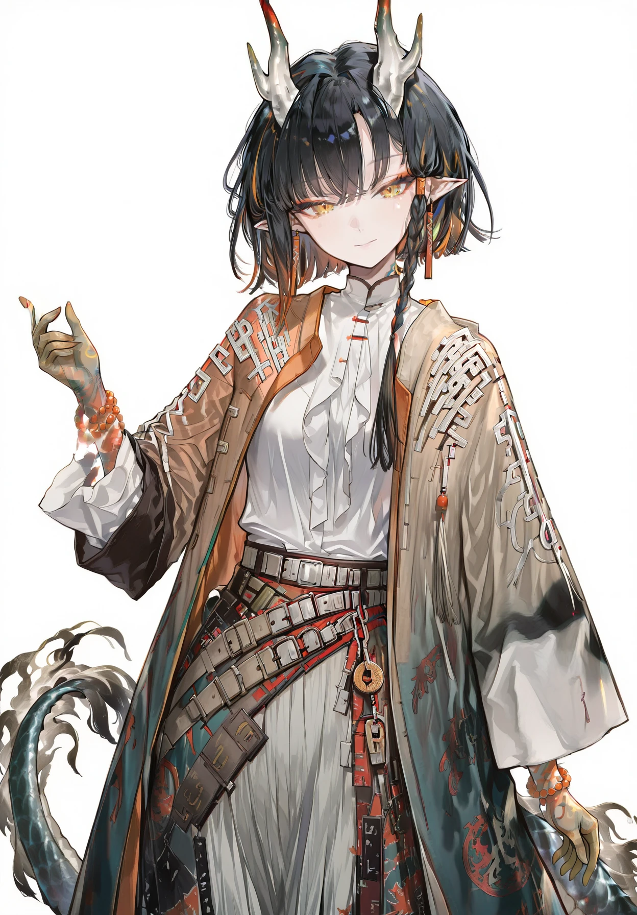 jie_(arknights),1girl,solo,dragon horns,black hair,streaked hair,orange hair,short hair,braided sidelock,single hair tube,yellow eyes,pointy ears,colored extremities,tassel earrings,multicolored coat,print coat,open coat,white shirt,bead bracelet,belt,jewelry,dragon tail,white skirt,long skirt,print skirt,black ankle boots,