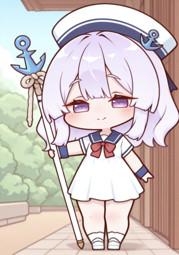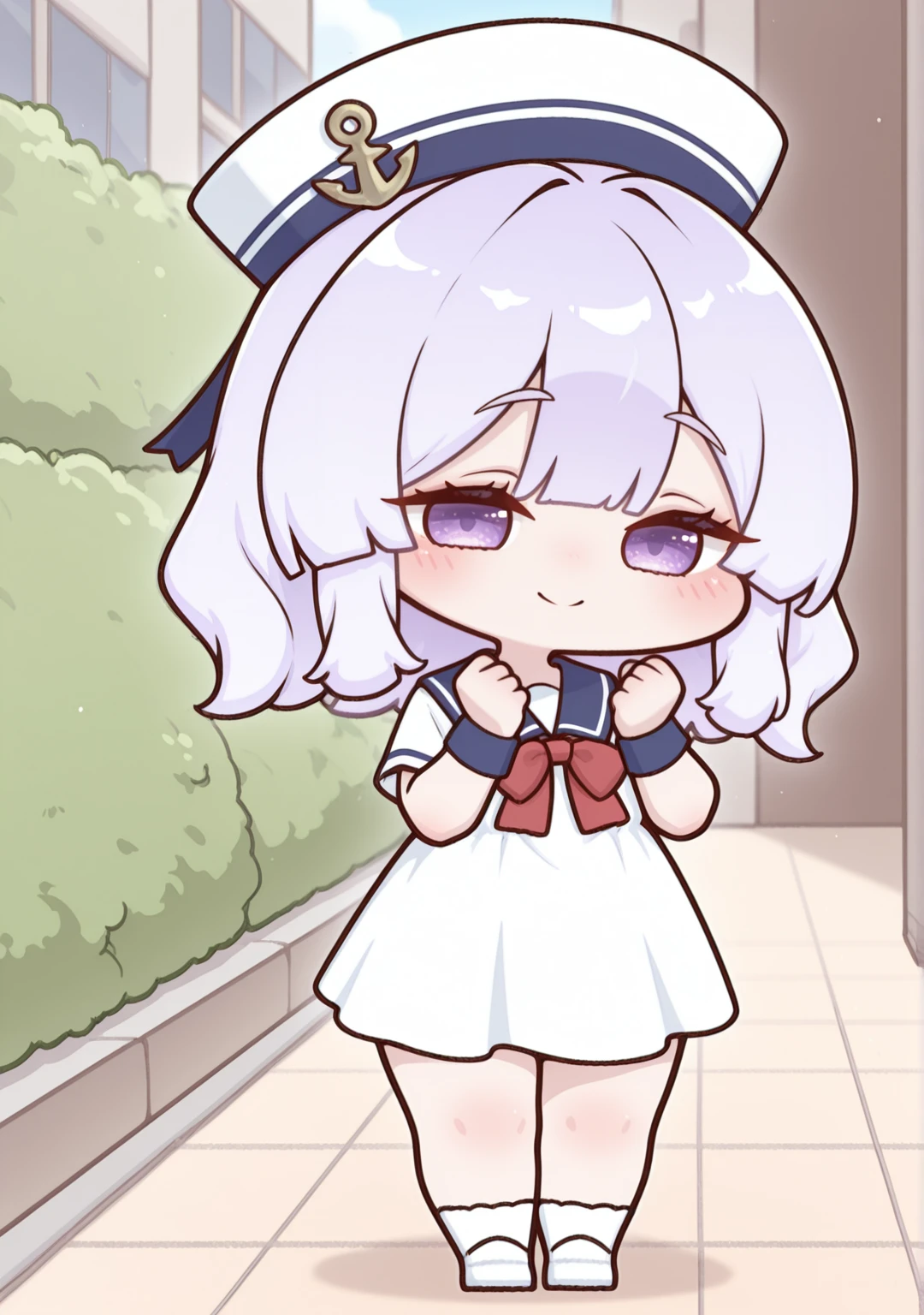 navy:yomi-nvy,medium hair,anchor,red bowtie,blue wristband,dress,sailor collar,sailor dress,sailor hat,white dress,white headwear,