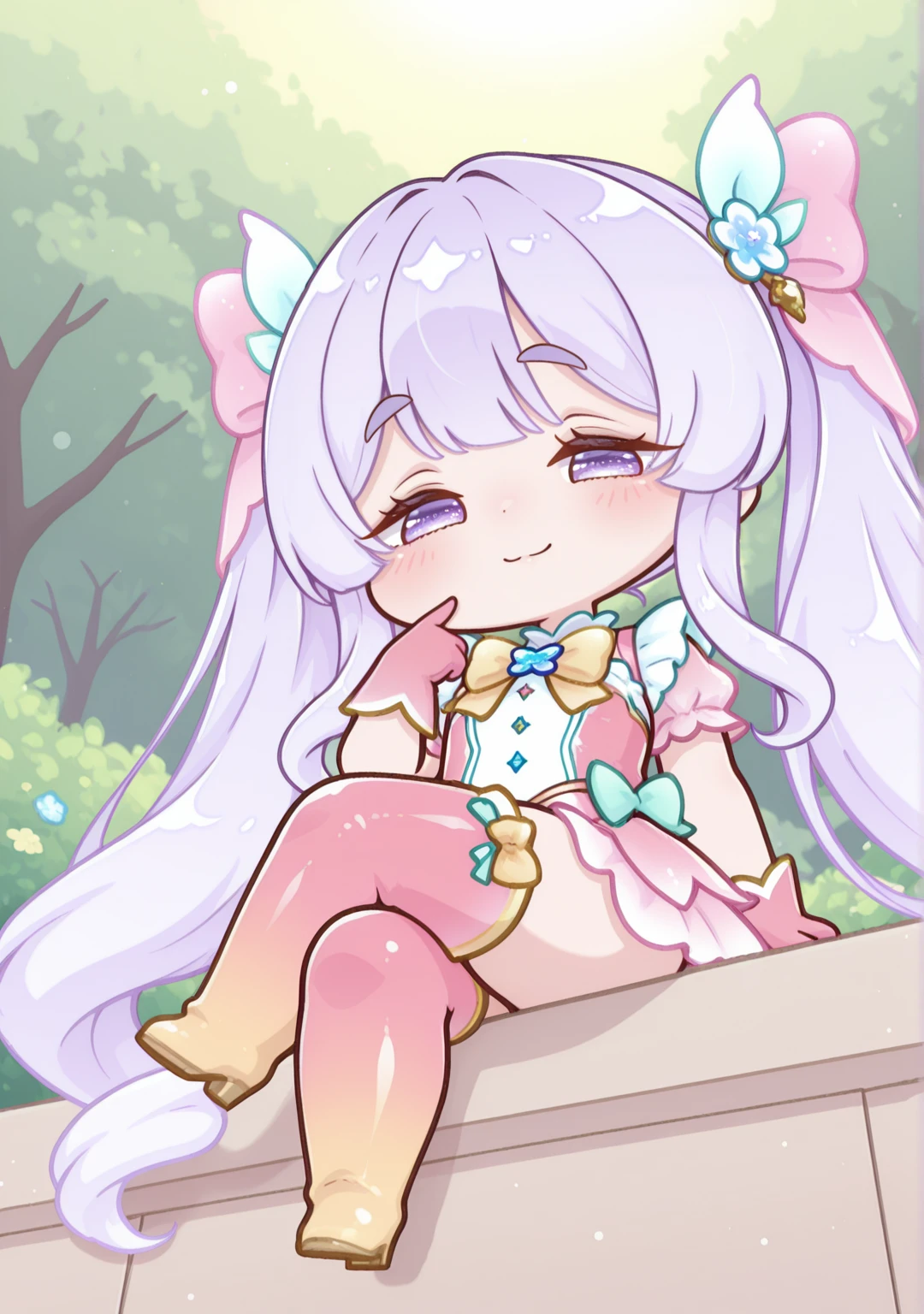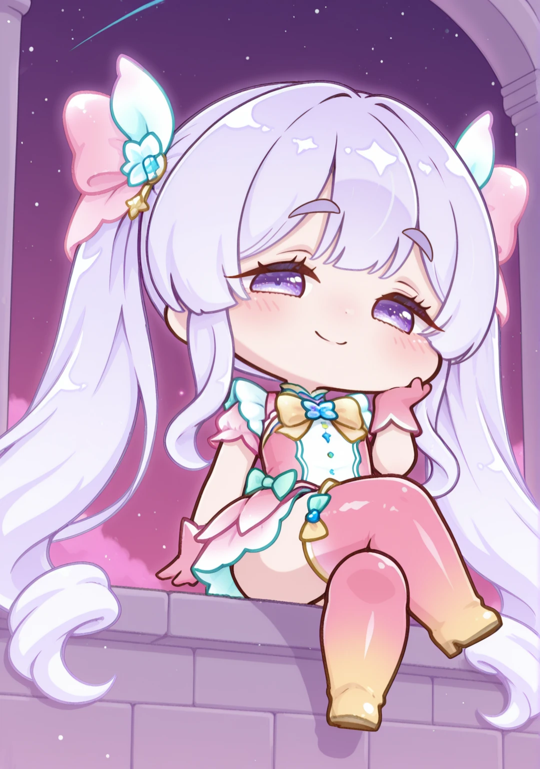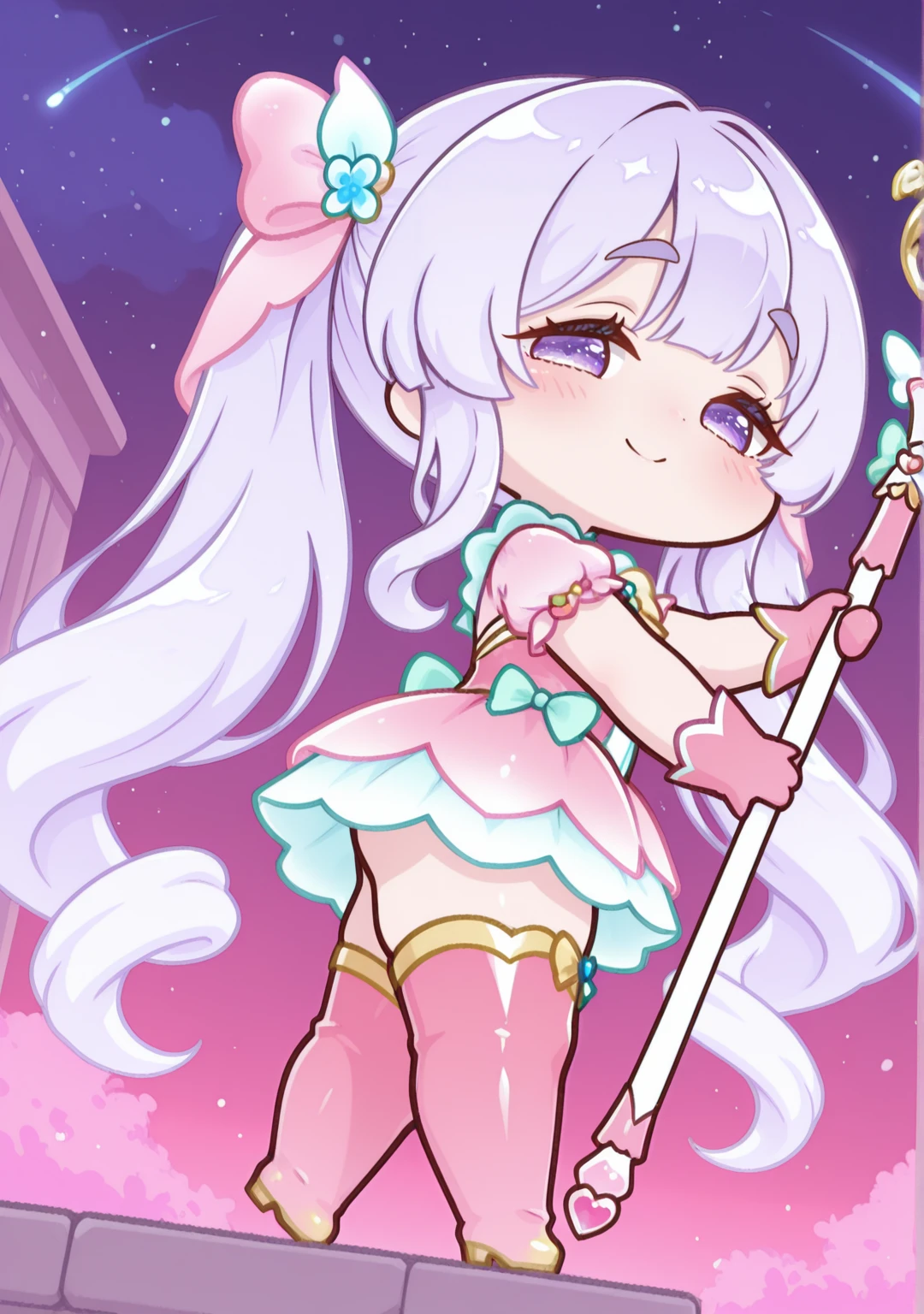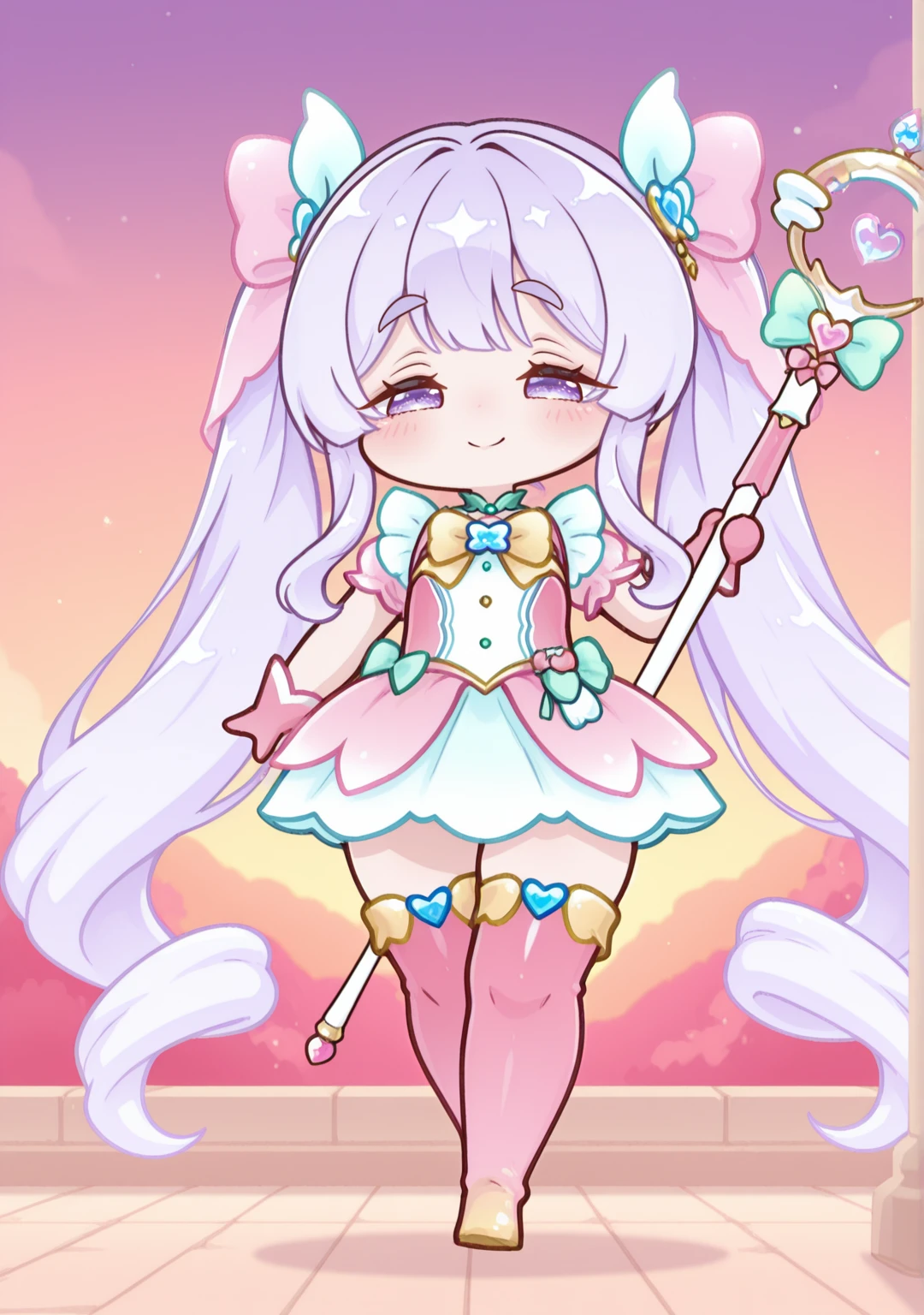 magical:yomi-mag,dress,gloves,hair bow,hair ornament,long hair,magical girl,pink bow,pink dress,pink footwear,pink gloves,pink sleeves,pink thighhighs,short sleeves,thick eyebrows,thigh boots,twintails,very long hair,yellow bow,yellow footwear,