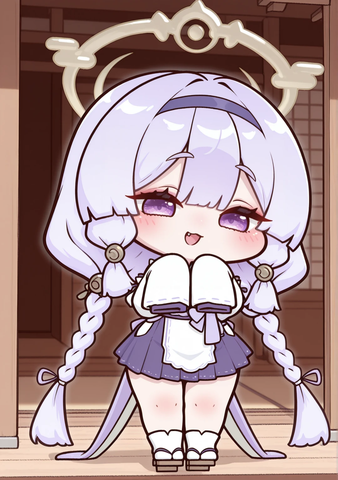 default:yomi-def,blue hairband,braid,detached sleeves,fang,geta,hair tubes,hairband,japanese clothes,kimono,long hair,low twin braids,low twintails,pleated skirt,purple hairband,sleeves past fingers,sleeves past wrists,tabi,very long hair,white socks,