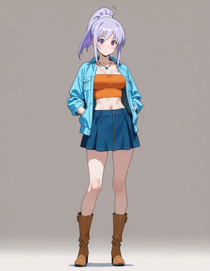 mai_mimi,(aged_up:1.5),purple_eyes,purple_hair,ponytail,necklace,orange_tube_top,blue_jacket,midriff,blue_short_skirt,boots