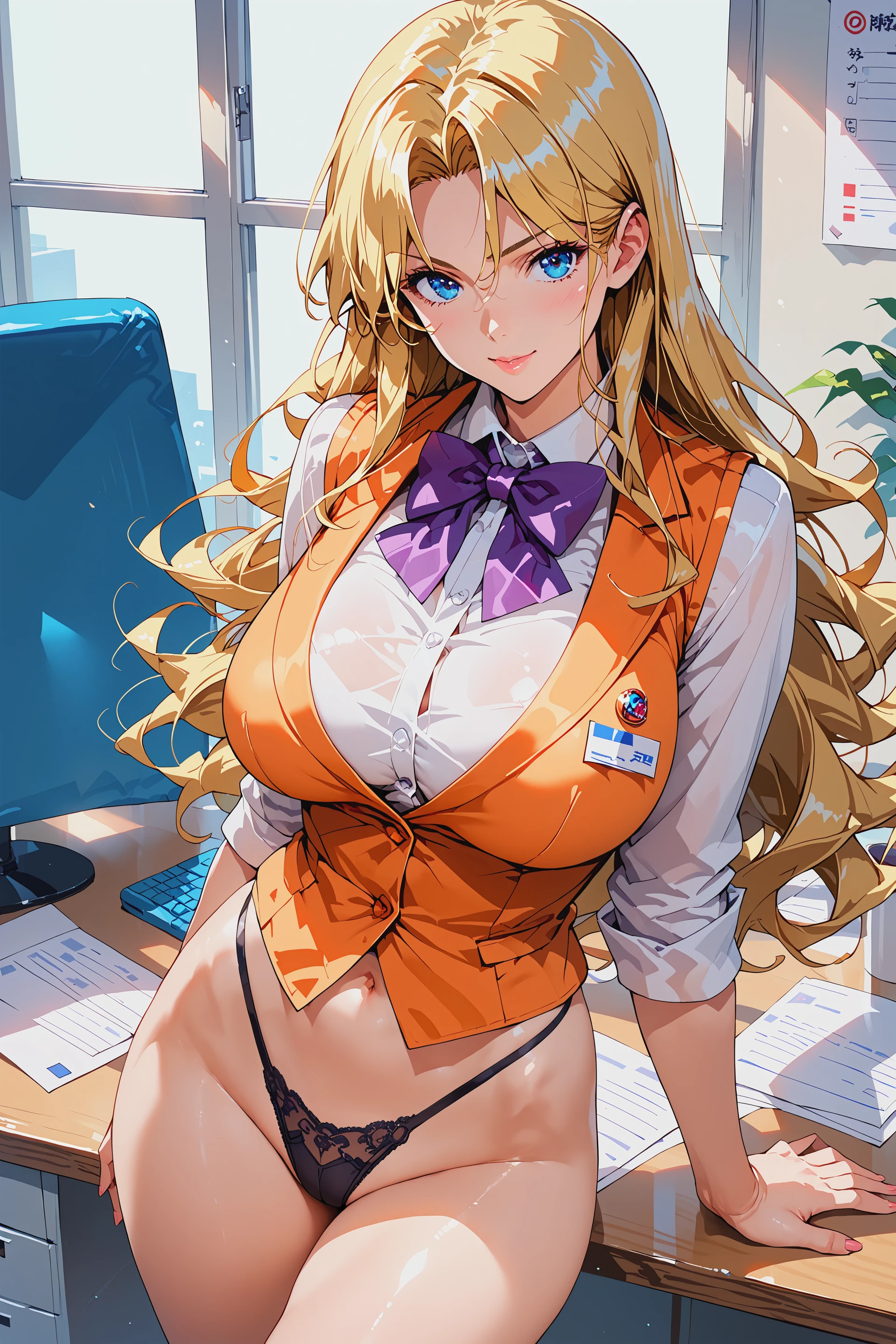blonde hair, long hair, blue eyes, large breasts, orange vest, orange skirt, white shirt, purple bowtie, pantyhose