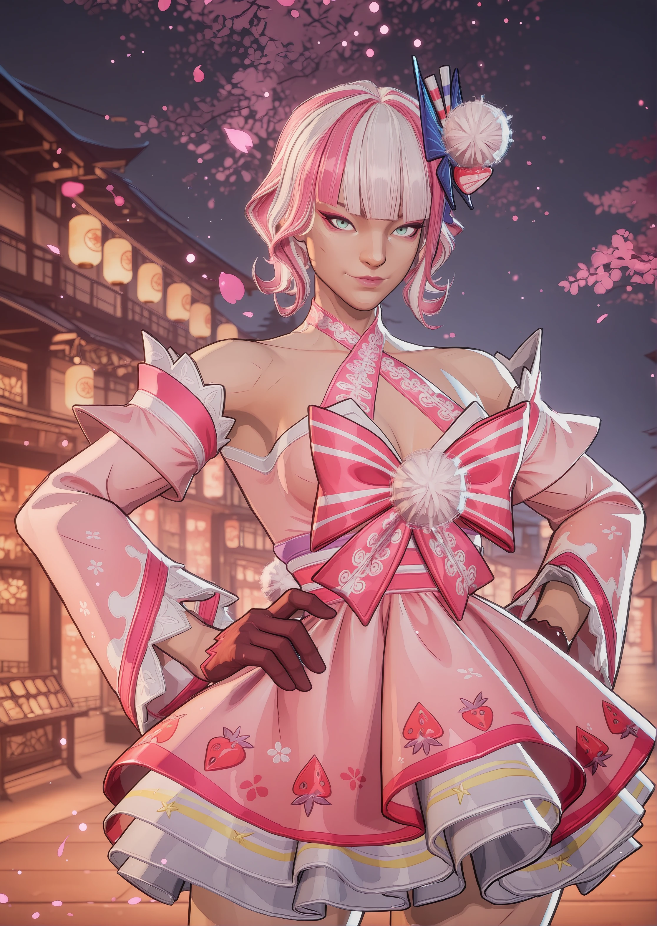 Breezy Butterfly outfit : one-piece swimsuit, front-tie top, halterneck, translucent clothing, see-through clothes, long hair, purple hair, pink streaks, ponytail, hair ribbon, blue eyes, facial mark, black lips, bracelet, thigh strap,anklet,summer
