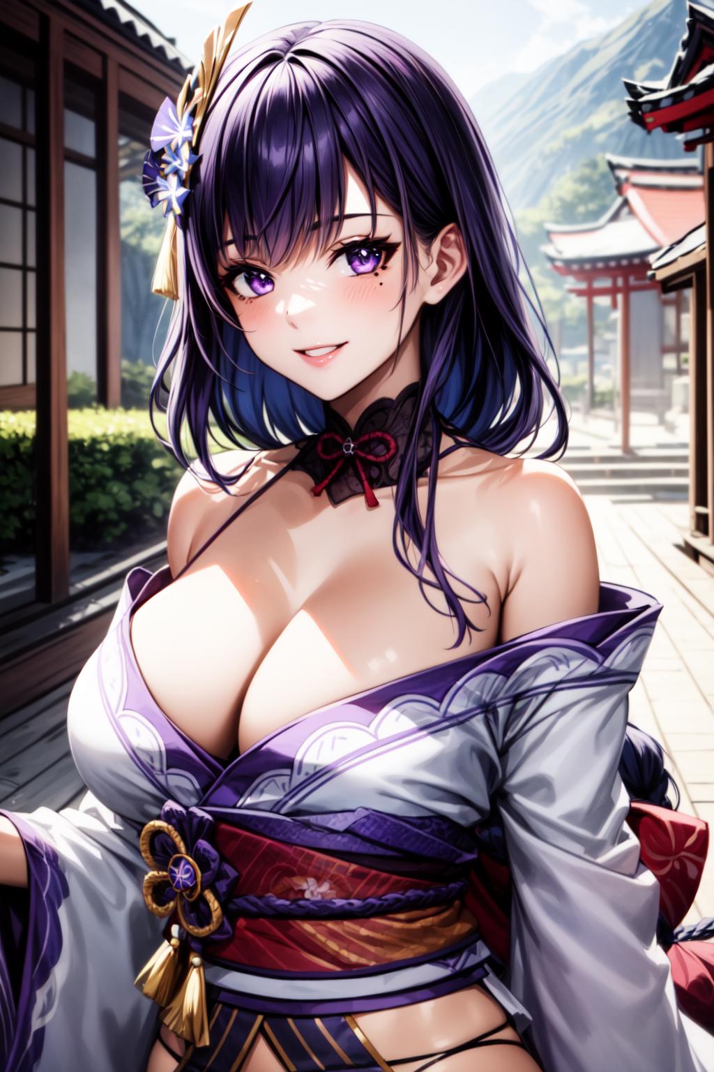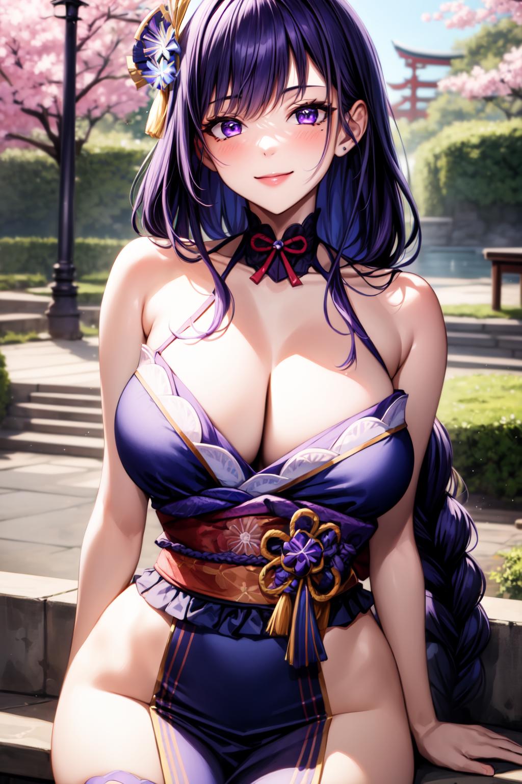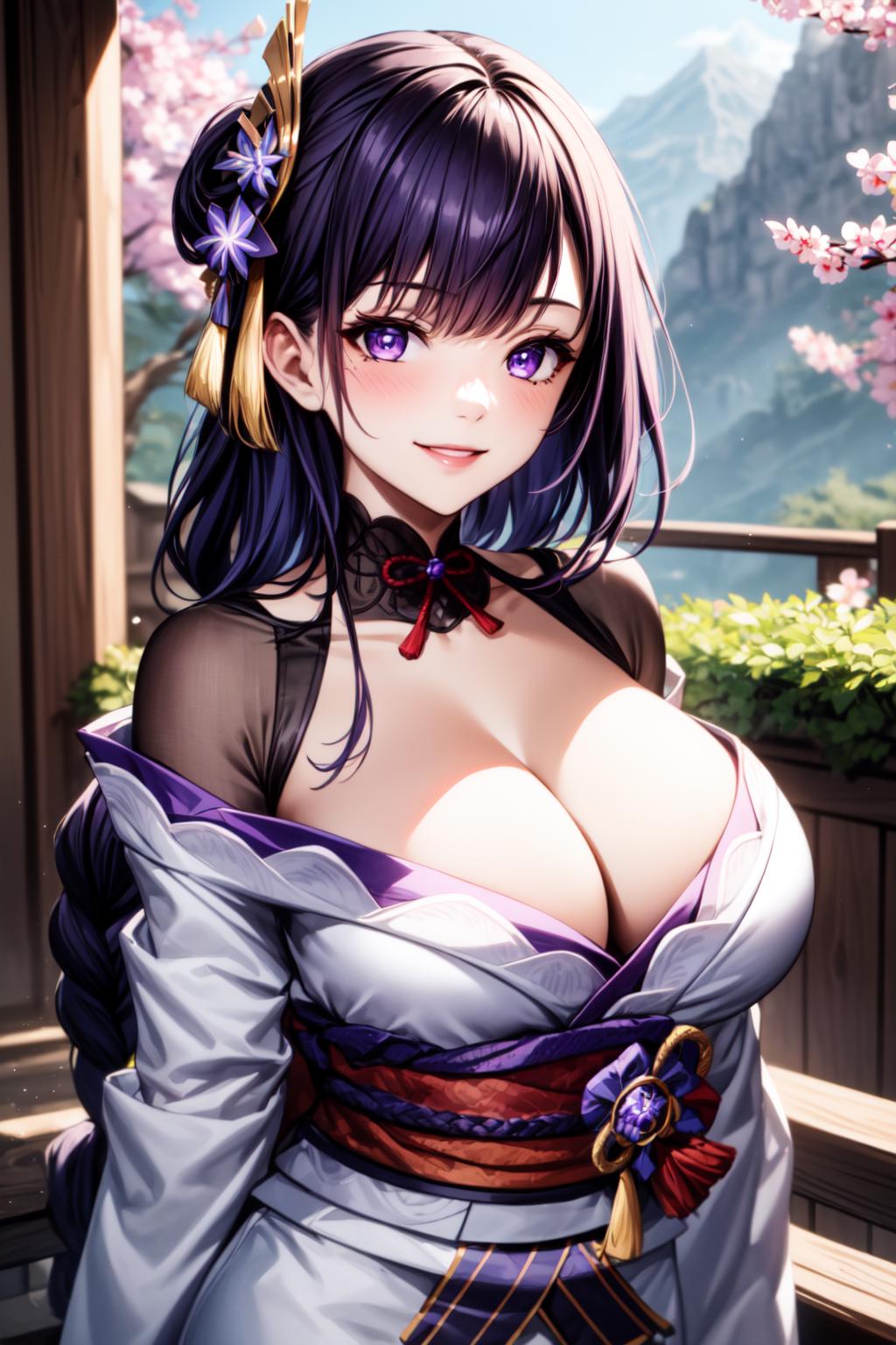 RaidenGenshin_NDV, 1girl, purple hair, mole under eye, large breasts, very long hair, purple eyes, japenese clothes, kimono, braid, cleavage, thighhighs, hair flowerBest weight: 0.6-0.8