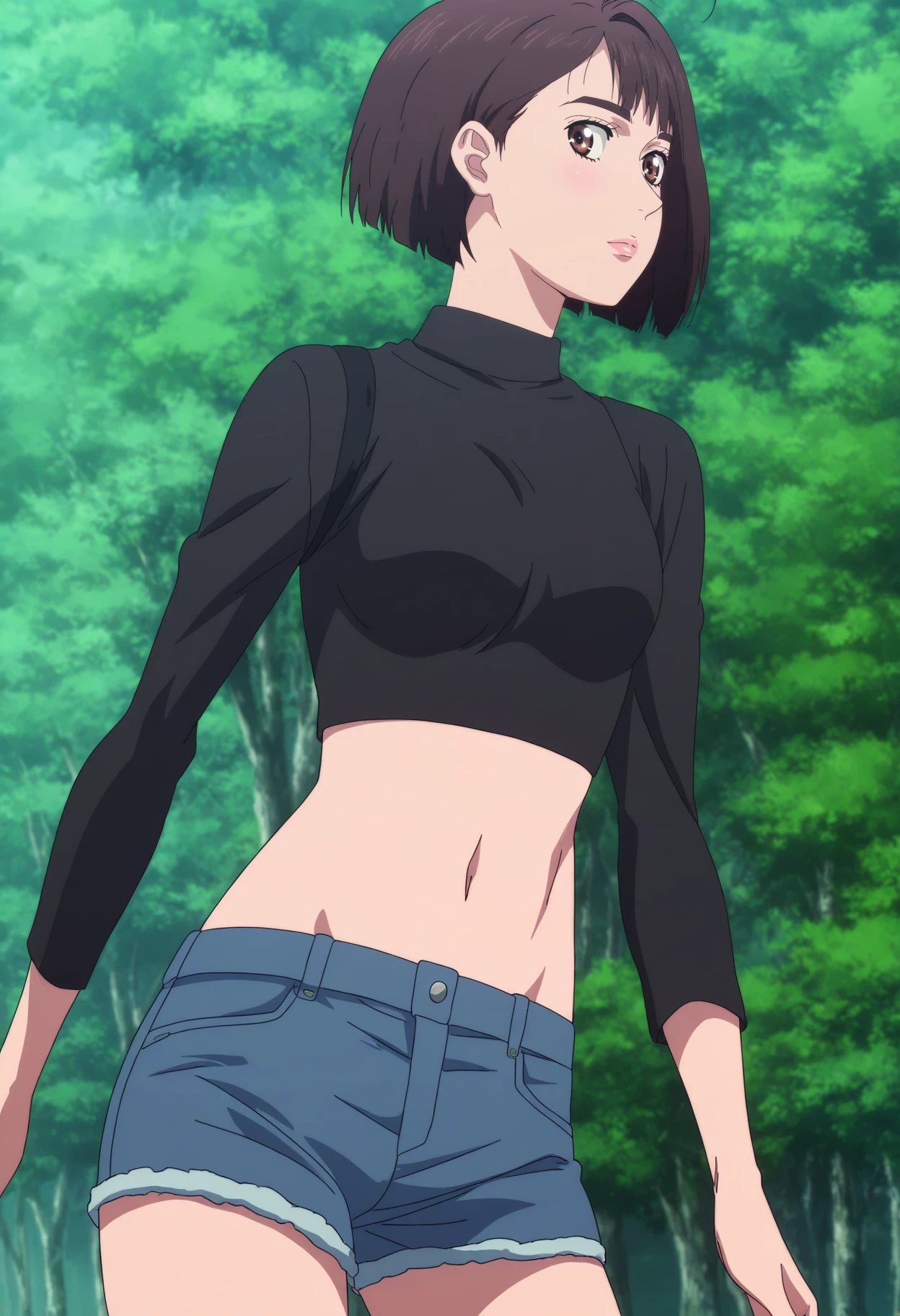 outfit2,black shirt,midriff,navel,short shorts,denim shorts,