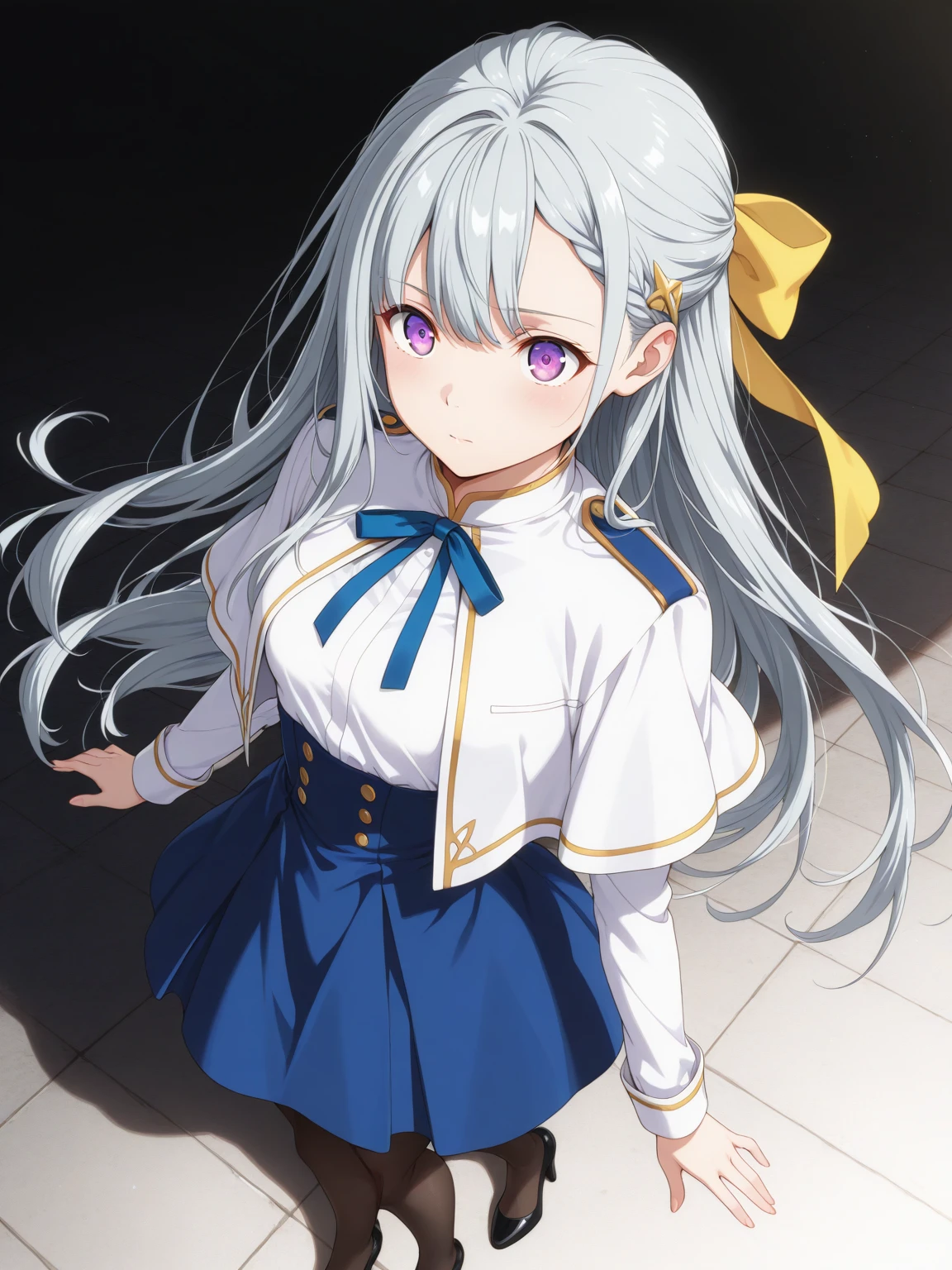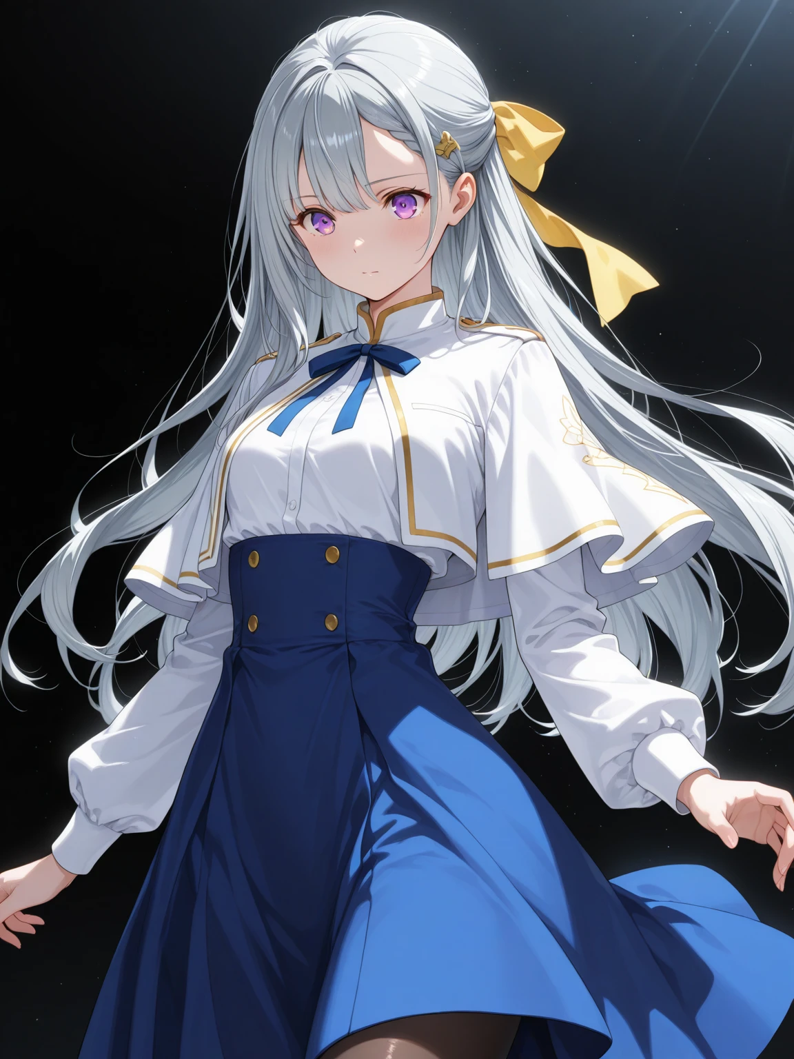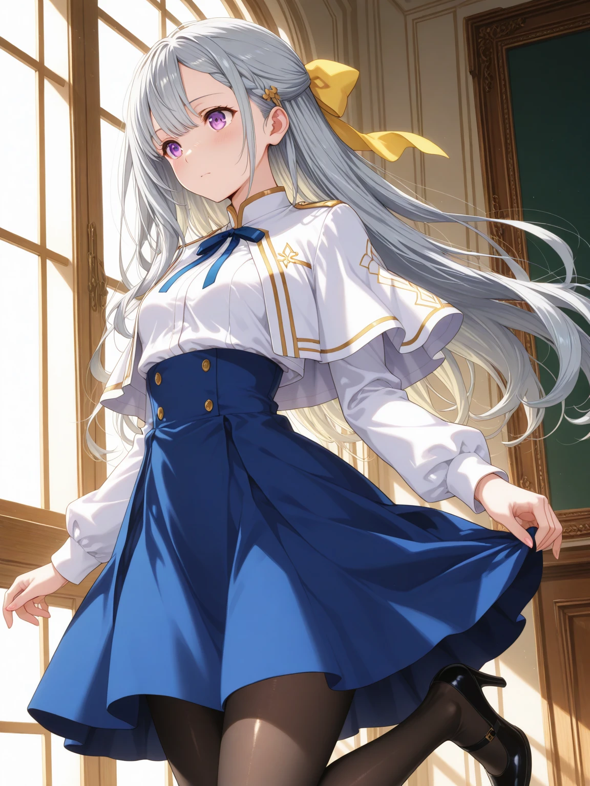 Uniform: (EuphylliaWhite, purple eyes, gray hair, long hair, hair pulled back, yellow hair bow), school uniform, white capelet, white jacket, long sleeves, blue neck ribbon, white shirt, high-waist skirt, blue skirt, pantyhose, high heels,