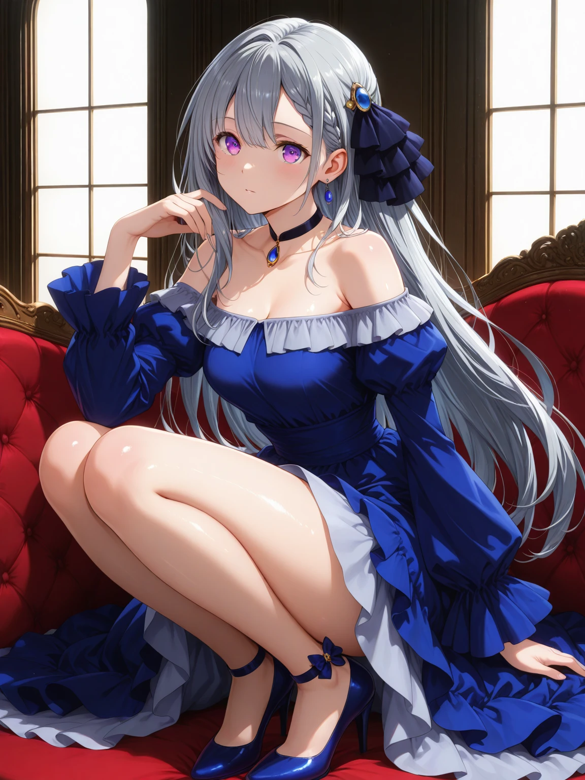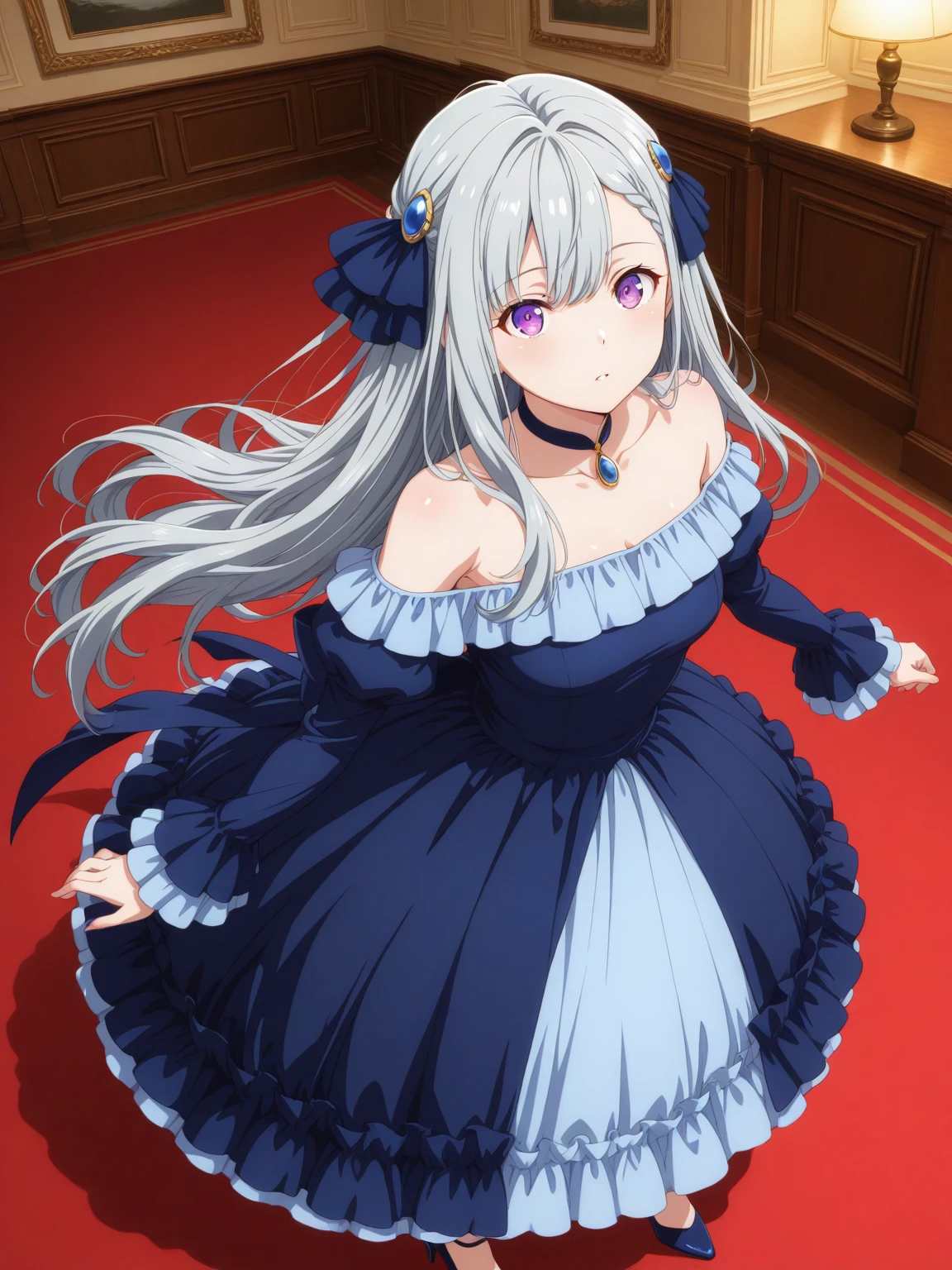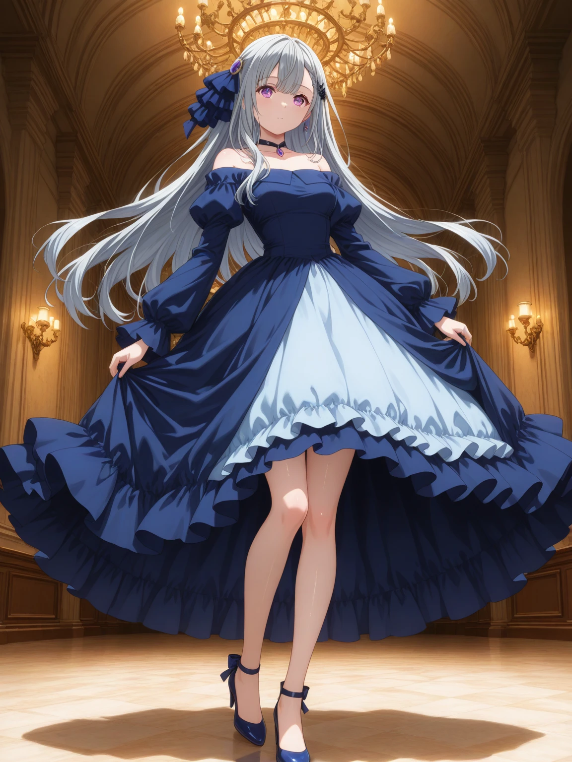 Dress: (EuphylliaBlue, purple eyes, gray hair, long hair, hair ornament), off-shoulder dress, two-tone dress, dark blue dress, light blue dress, long sleeves, choker, high heels,