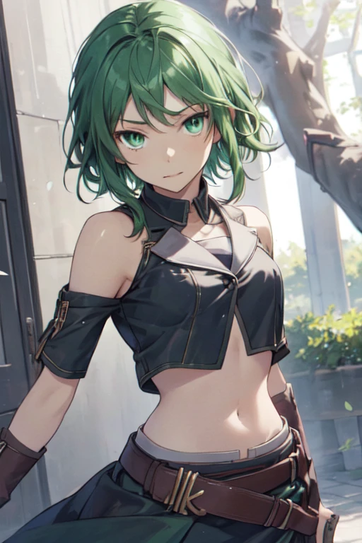 NemesisSudou, 1girl, solo, short hair, skirt, navel, green eyes, green hair, midriff, belt, crop top,