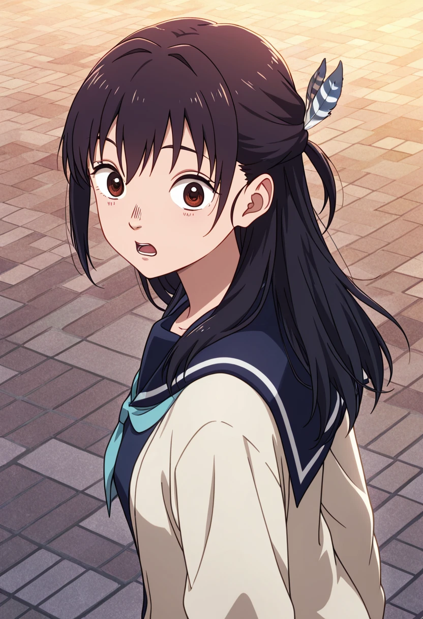 long hair, black hair, brown eyes
