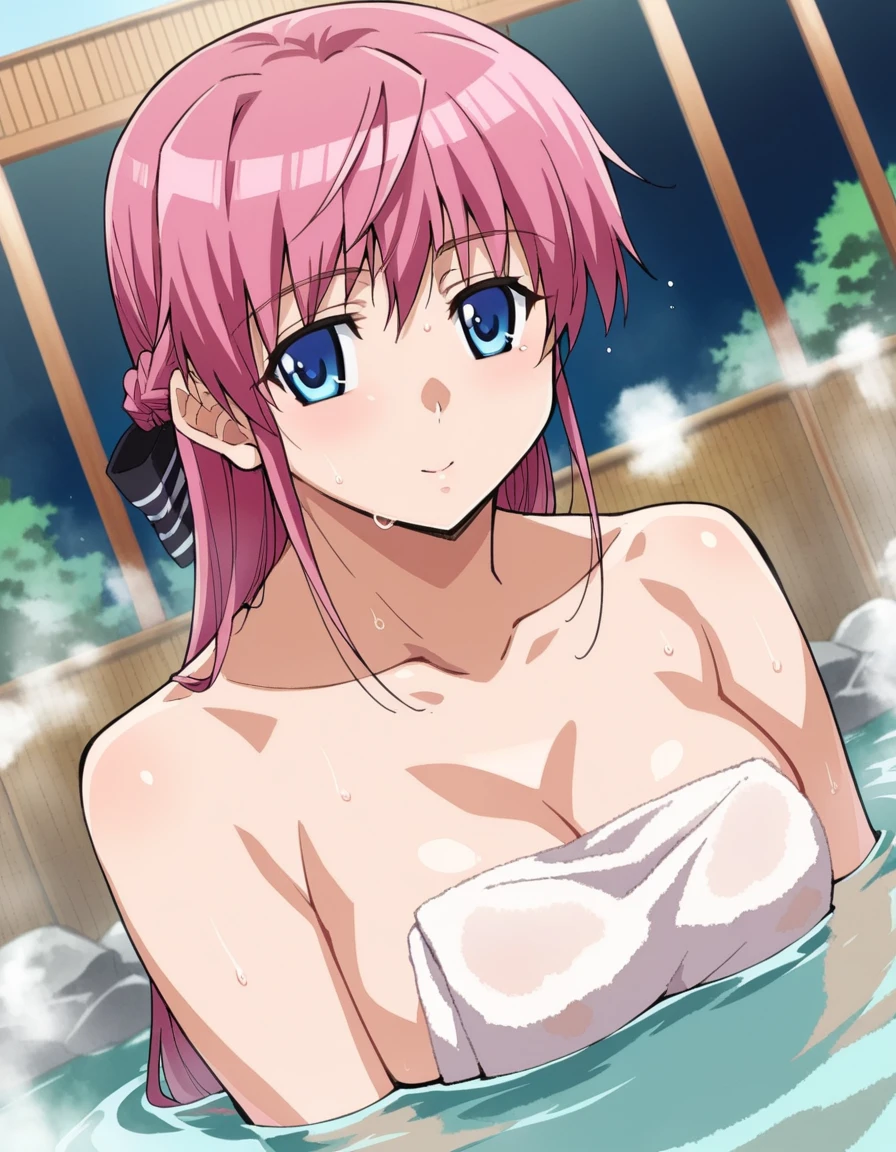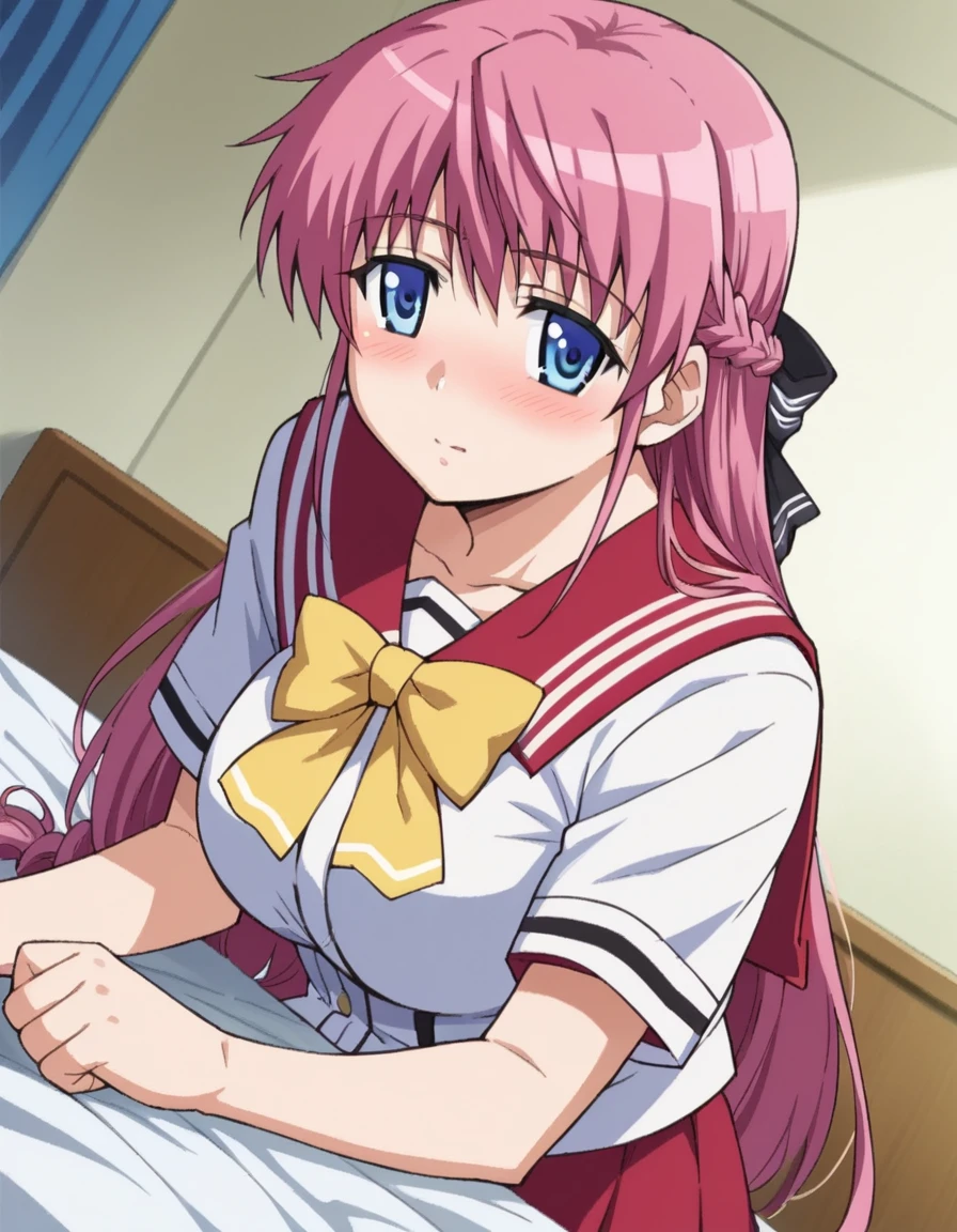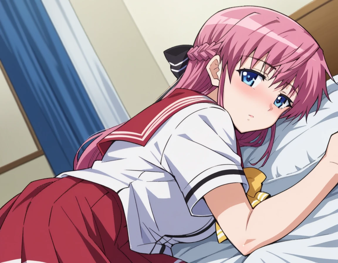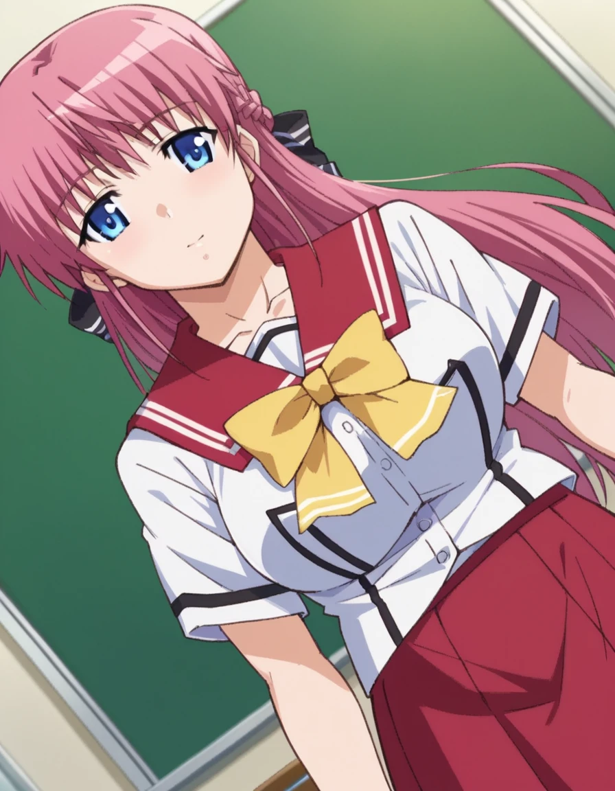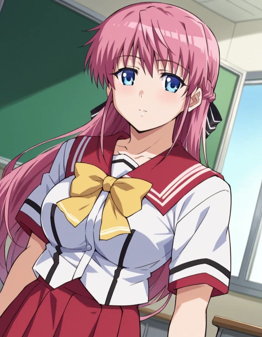akina orifushi, long hair, pink hair, blue eyes, hair braid, braid, hair bow, bow,