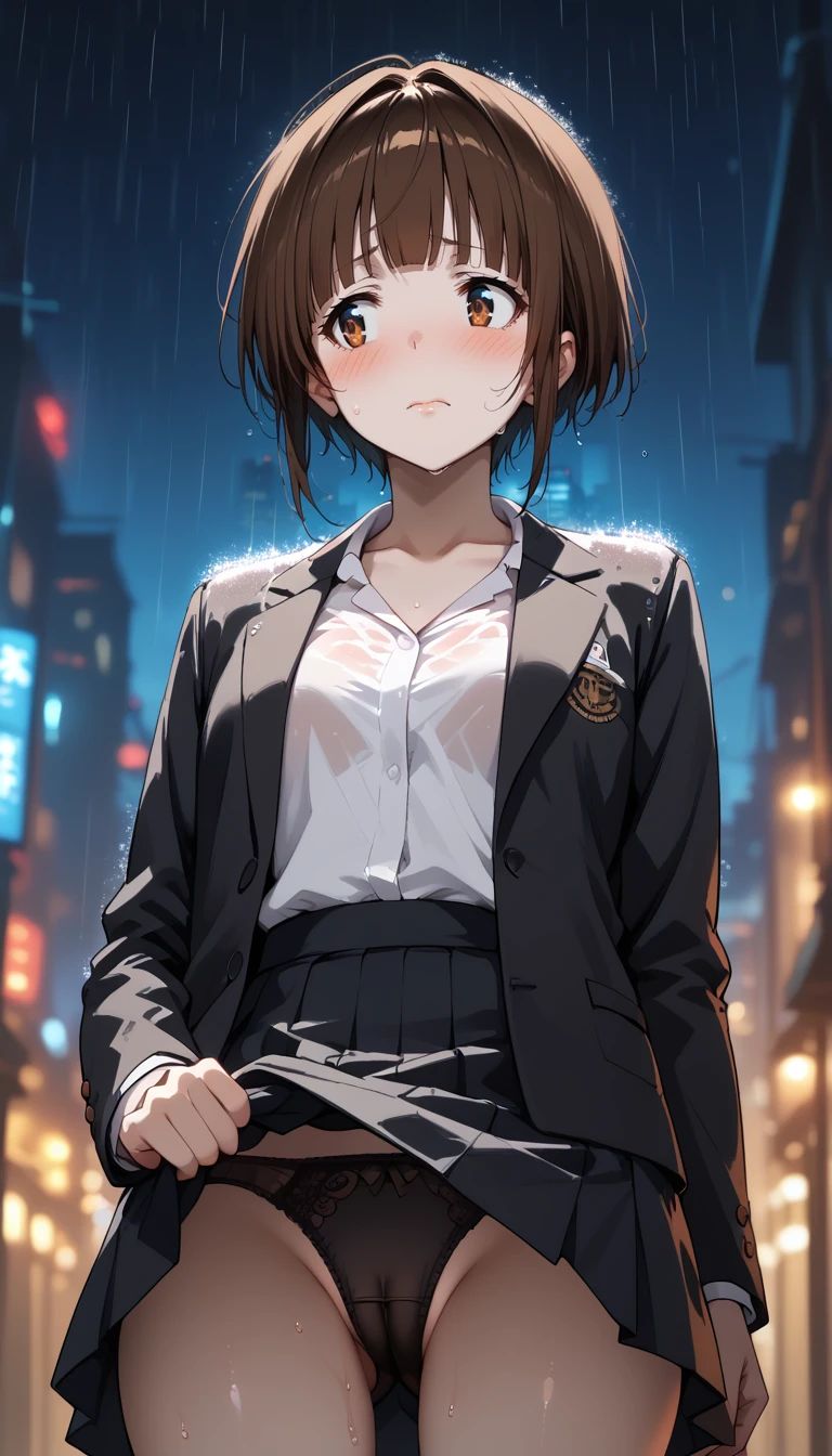 short hair, brown hair, brown eyes, blunt bangs