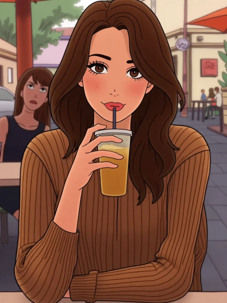 For example: CalArts, A woman sitting outdoors,sipping a drink from a transparent cup with a straw,wearing a brown striped sweater. She gazes directly at the camera with a playful smile,her hair slightly tousled. The background is a casual outdoor cafe or street setting,