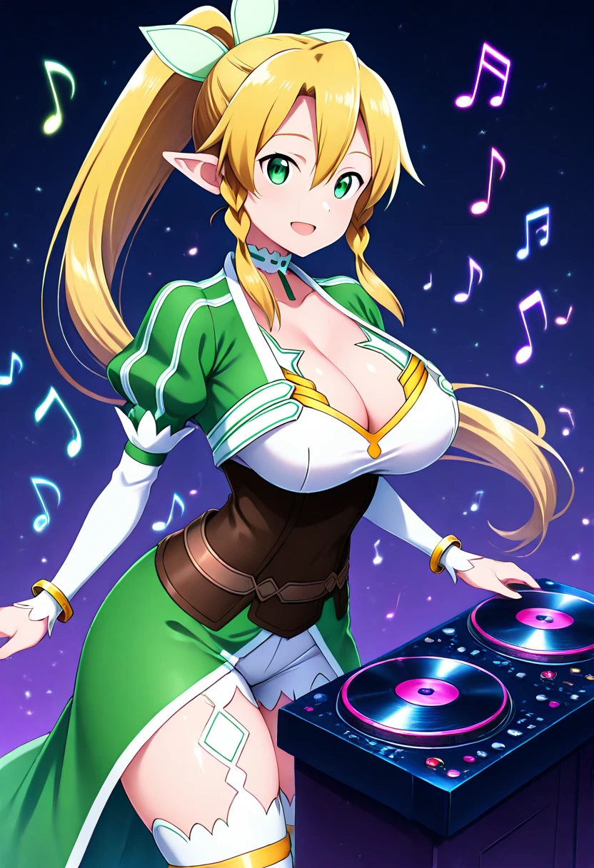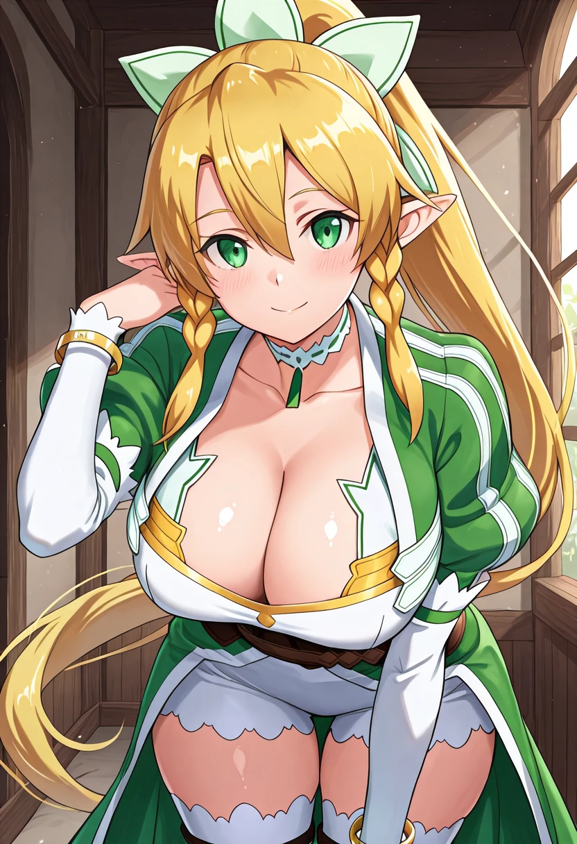 zzLeafa, green eyes, hair between eyes, twin braids, high ponytail, long hair, blonde hair, pointy ears,