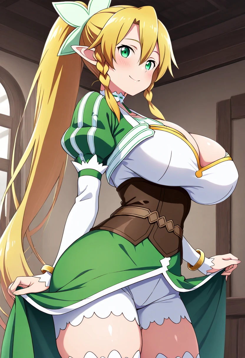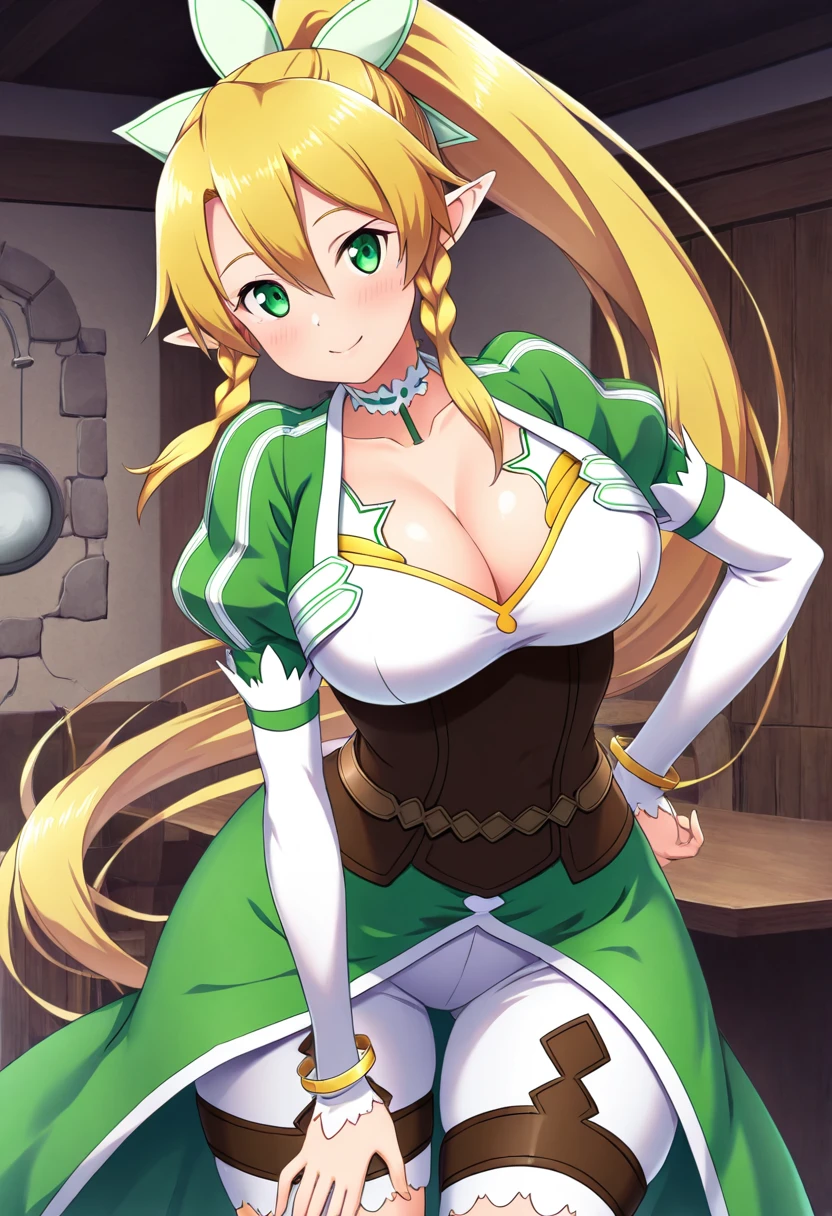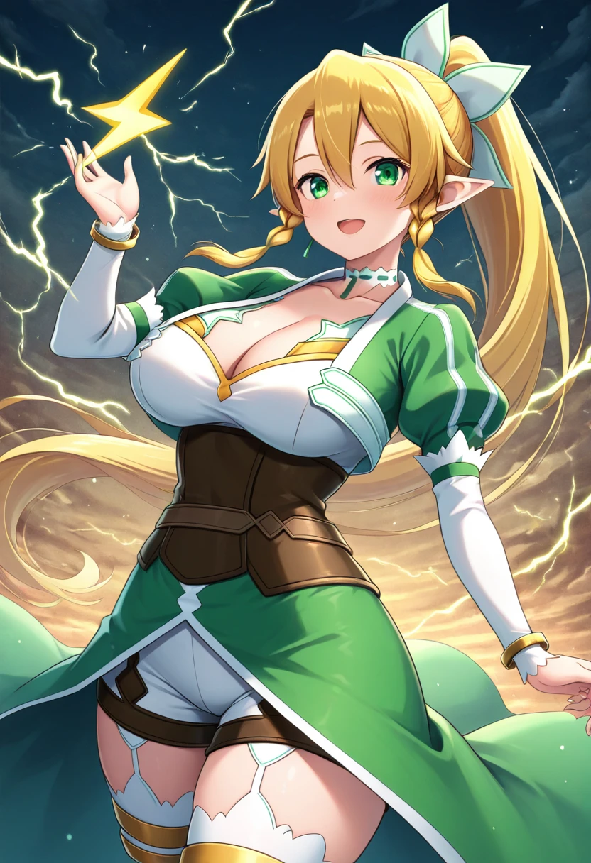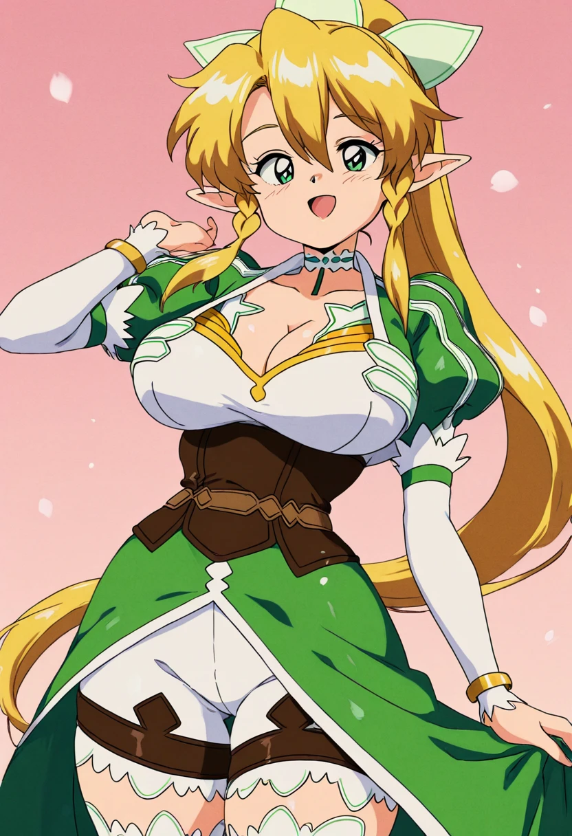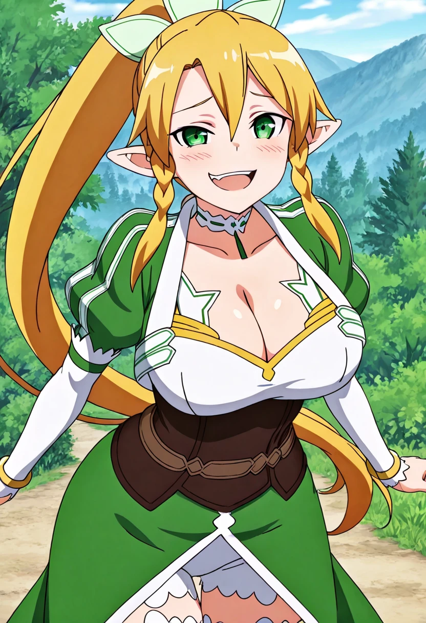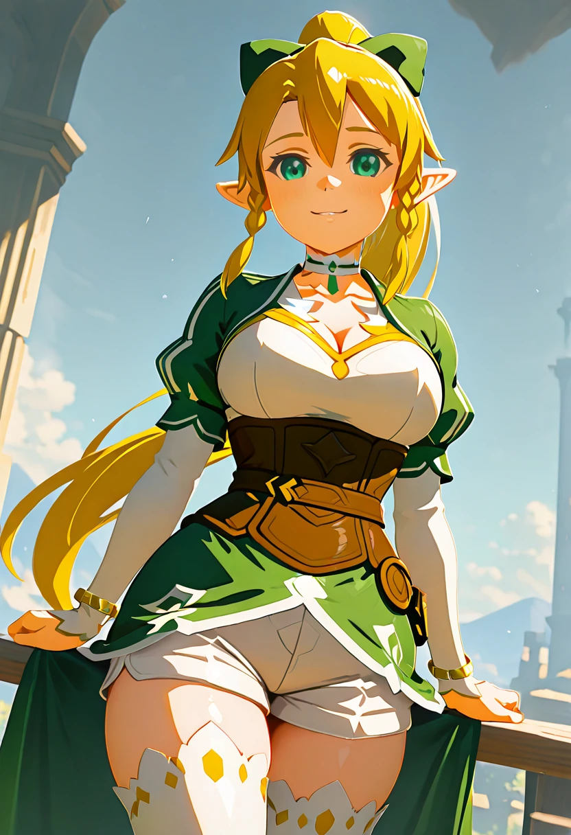 zzLeafa, green eyes, hair between eyes, twin braids, high ponytail, long hair, blonde hair, pointy ears, hair bow, white choker, multicolored dress, green dress, white dress, puffy long sleeves, white sleeves, bracelet, brown corset, brown belt, waist cape, green cape, white shorts, white thighhighs,