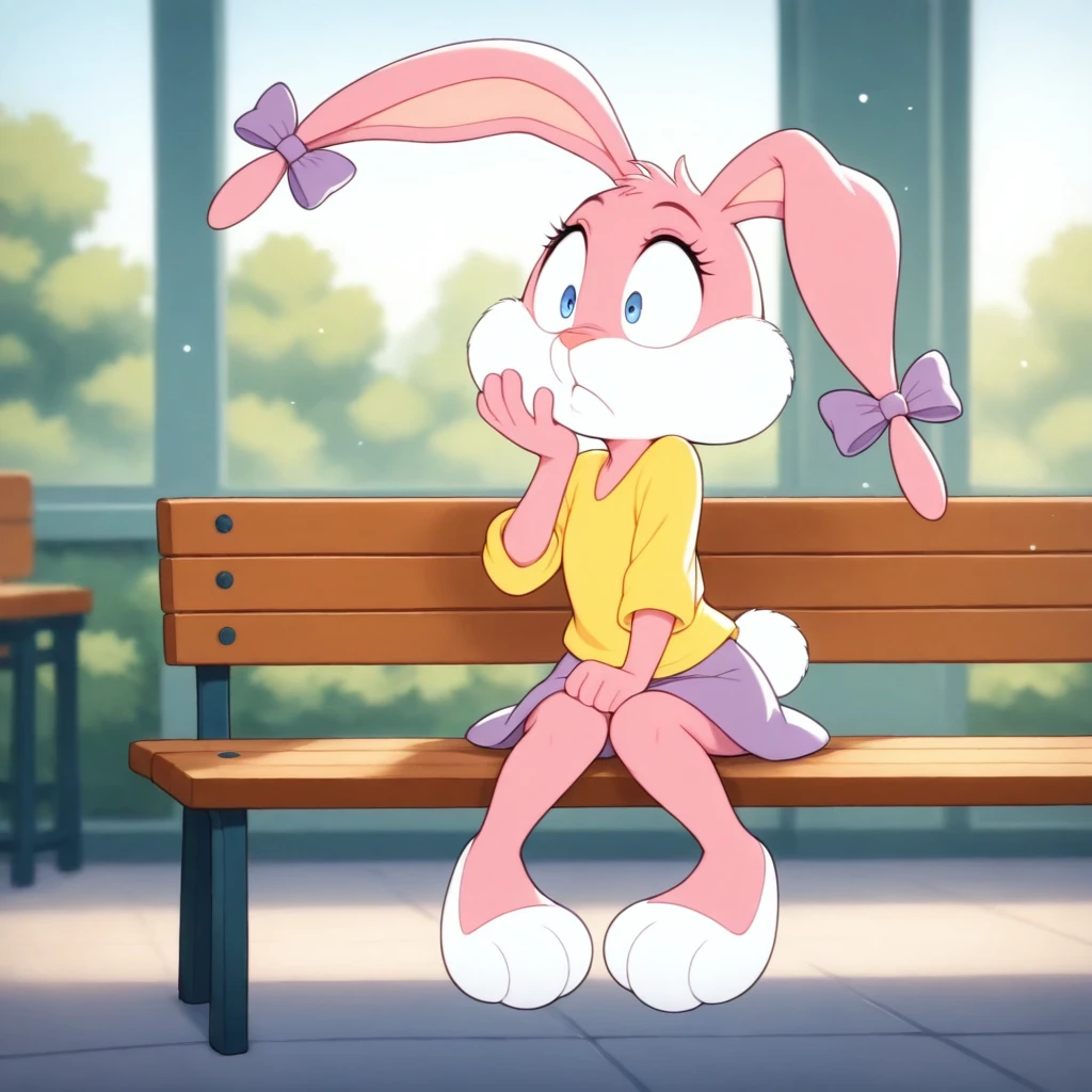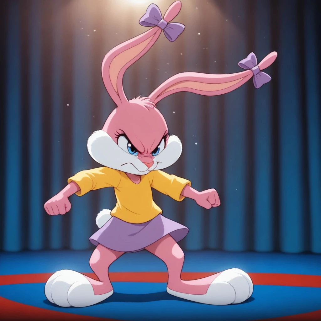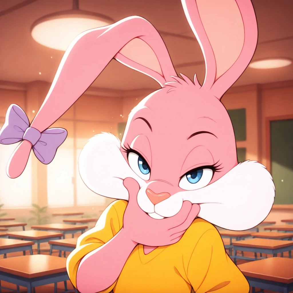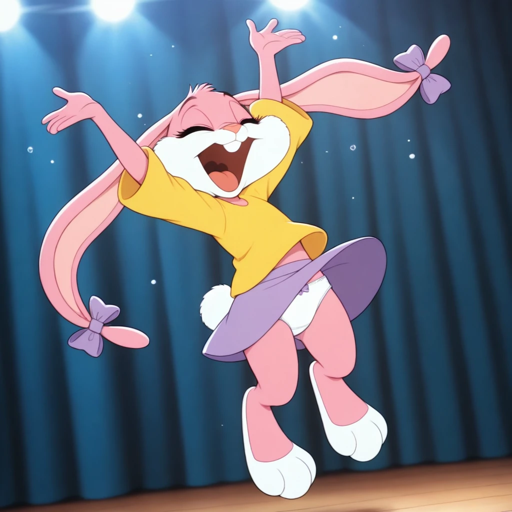 Standard Tag: Babs, bunny, girl, blue eyes, mouth open, Pink eyelids, rabbit teeth, pink nose, pink body, pink head, pink ears, pink legs, white cheeks, white feet, white tail, ????? ears, yellow T-shirt, purple skirt, purple bows on the ears