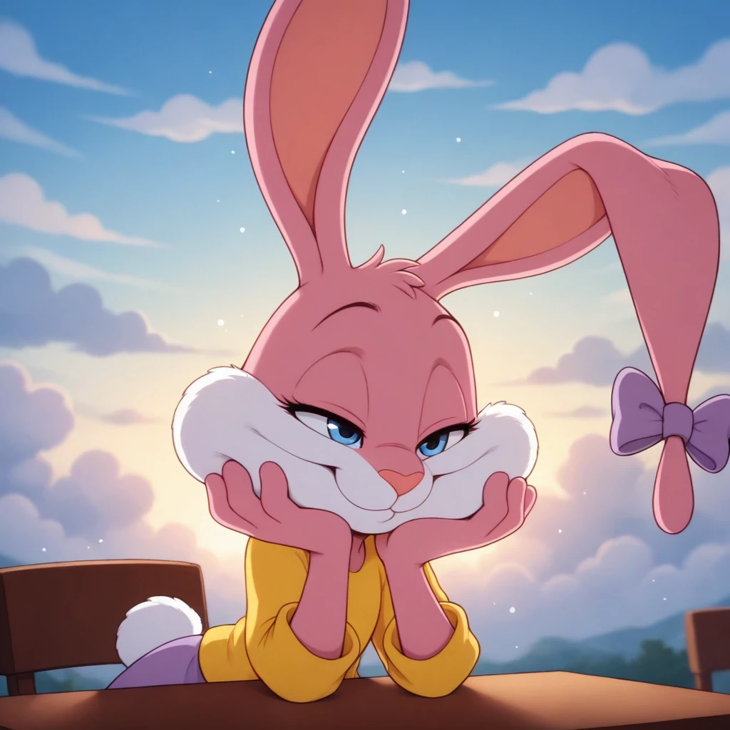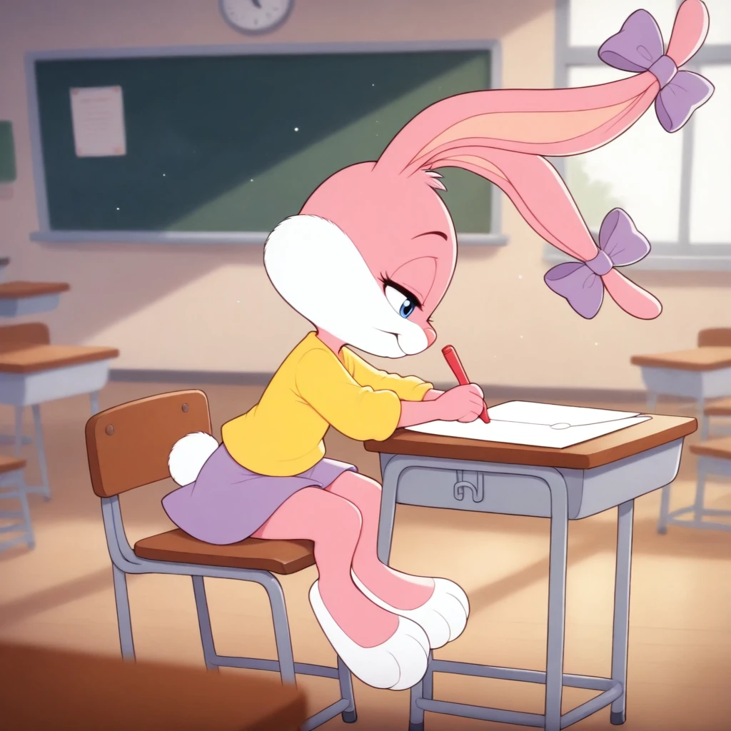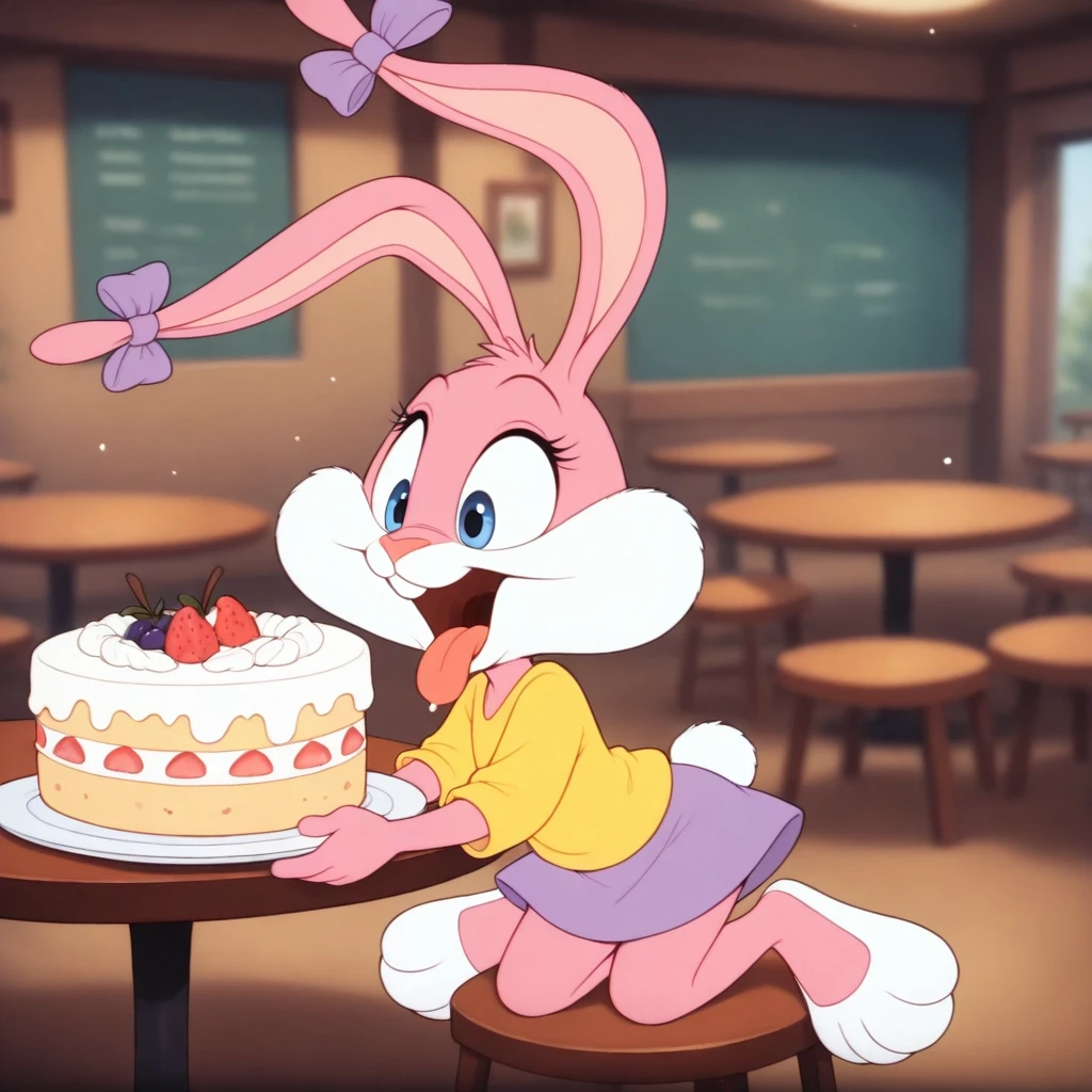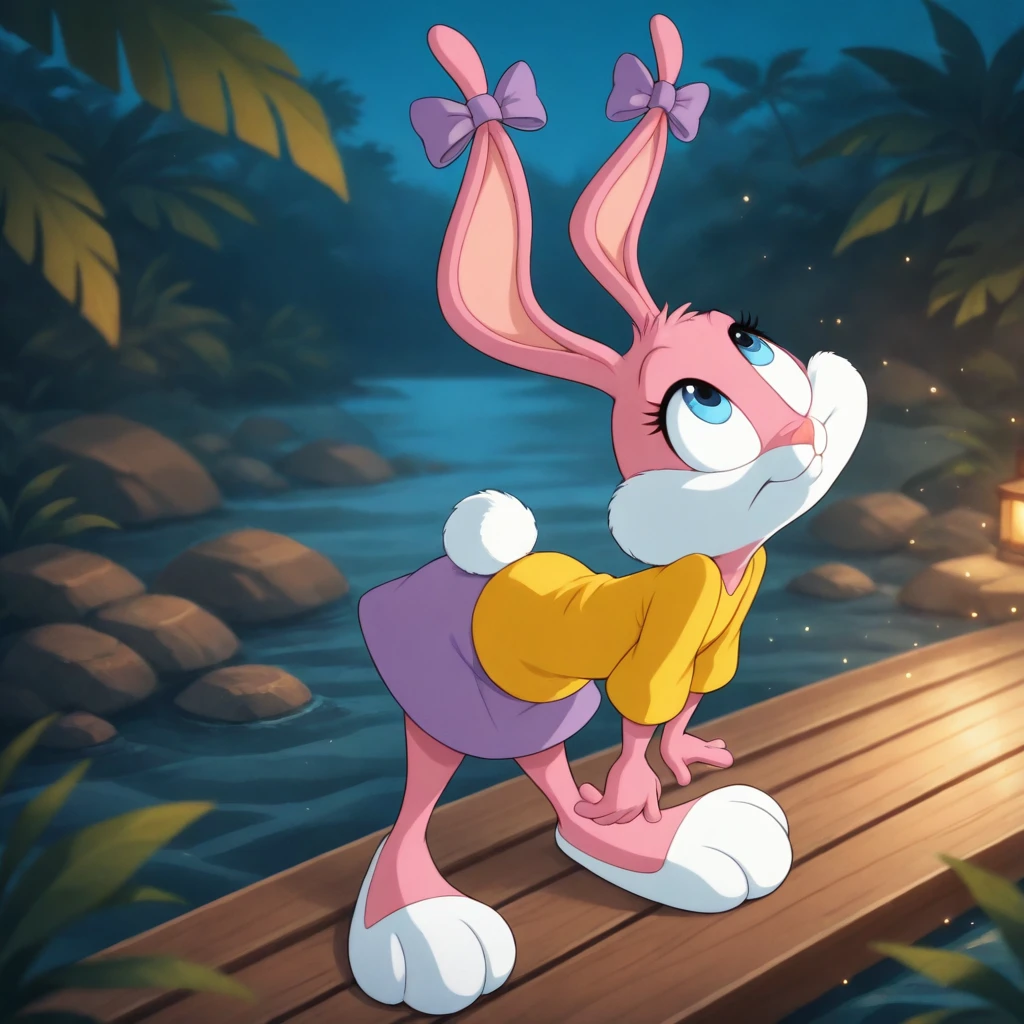 Standard Tag: Babs, bunny, girl, blue eyes, mouth open, Pink eyelids, rabbit teeth, pink nose, pink body, pink head, pink ears, pink legs, white cheeks, white feet, white tail, ????? ears, yellow T-shirt, purple skirt, purple bows on the ears