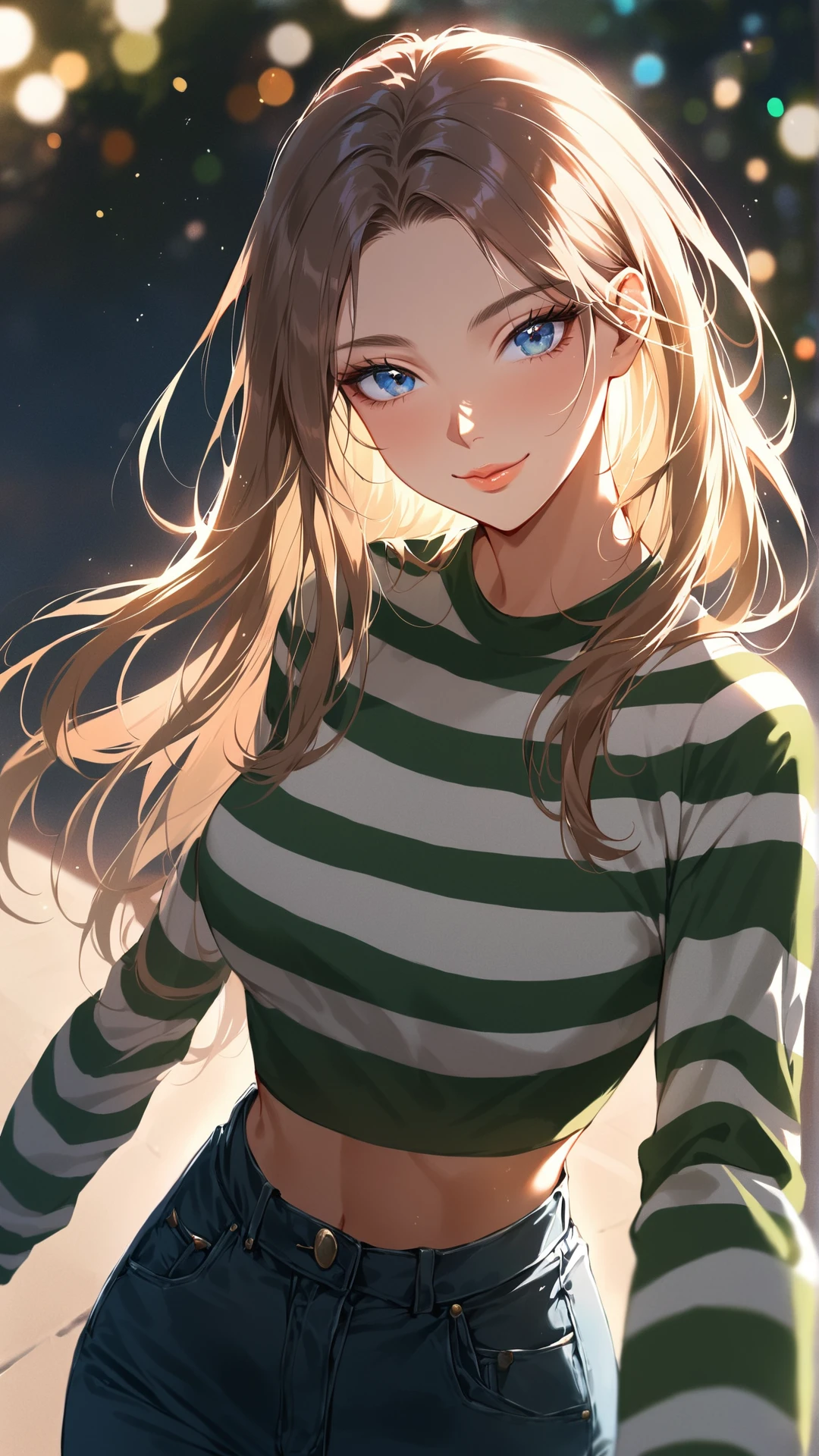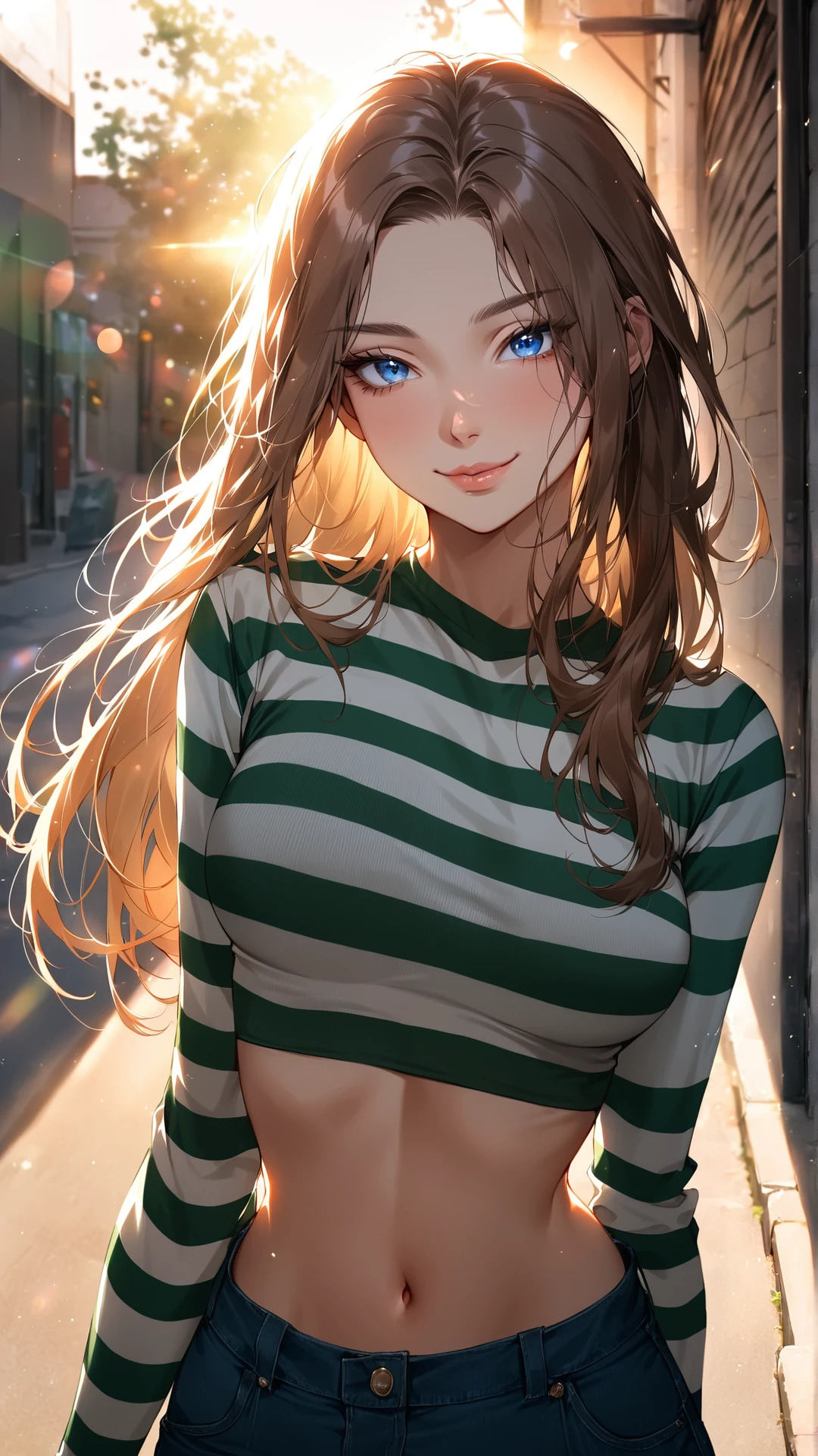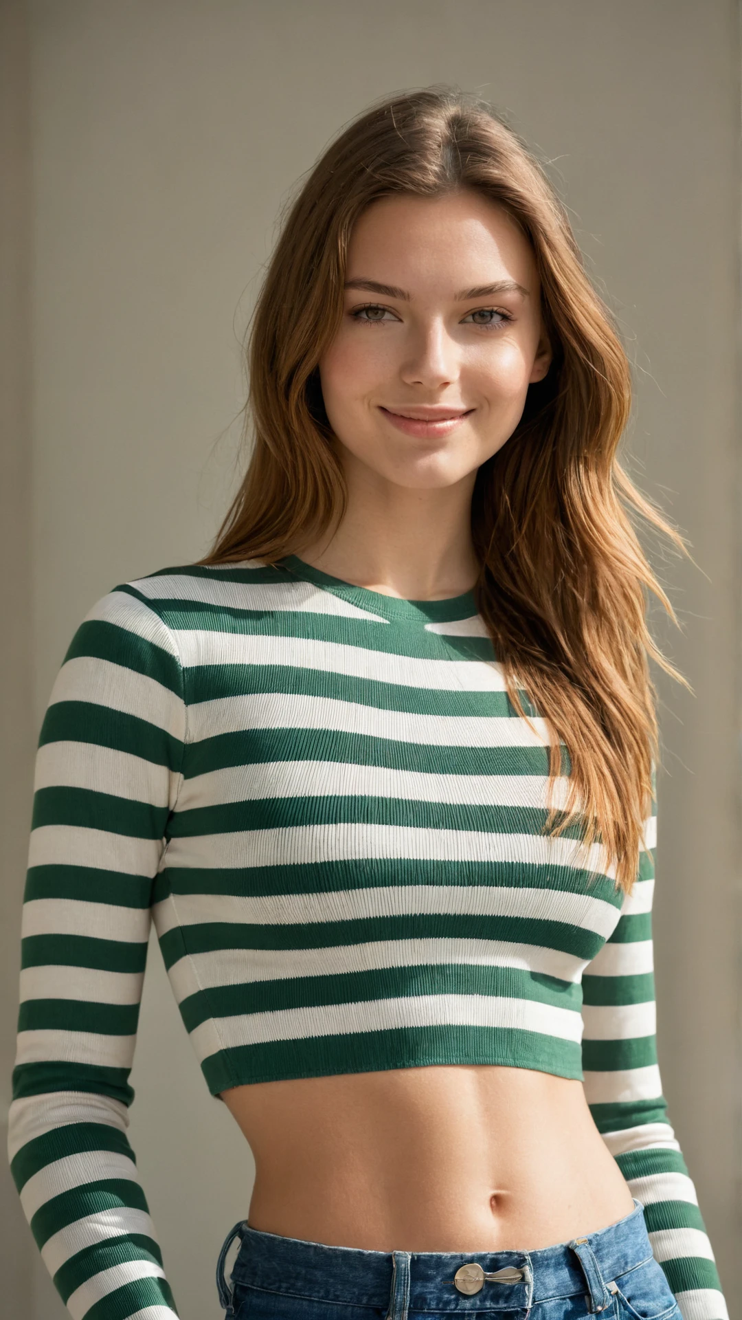 <lora:zaraXL-v2:1>, long sleeves, midriff, striped, shirt, striped shirt, crop top, green, white, green-white