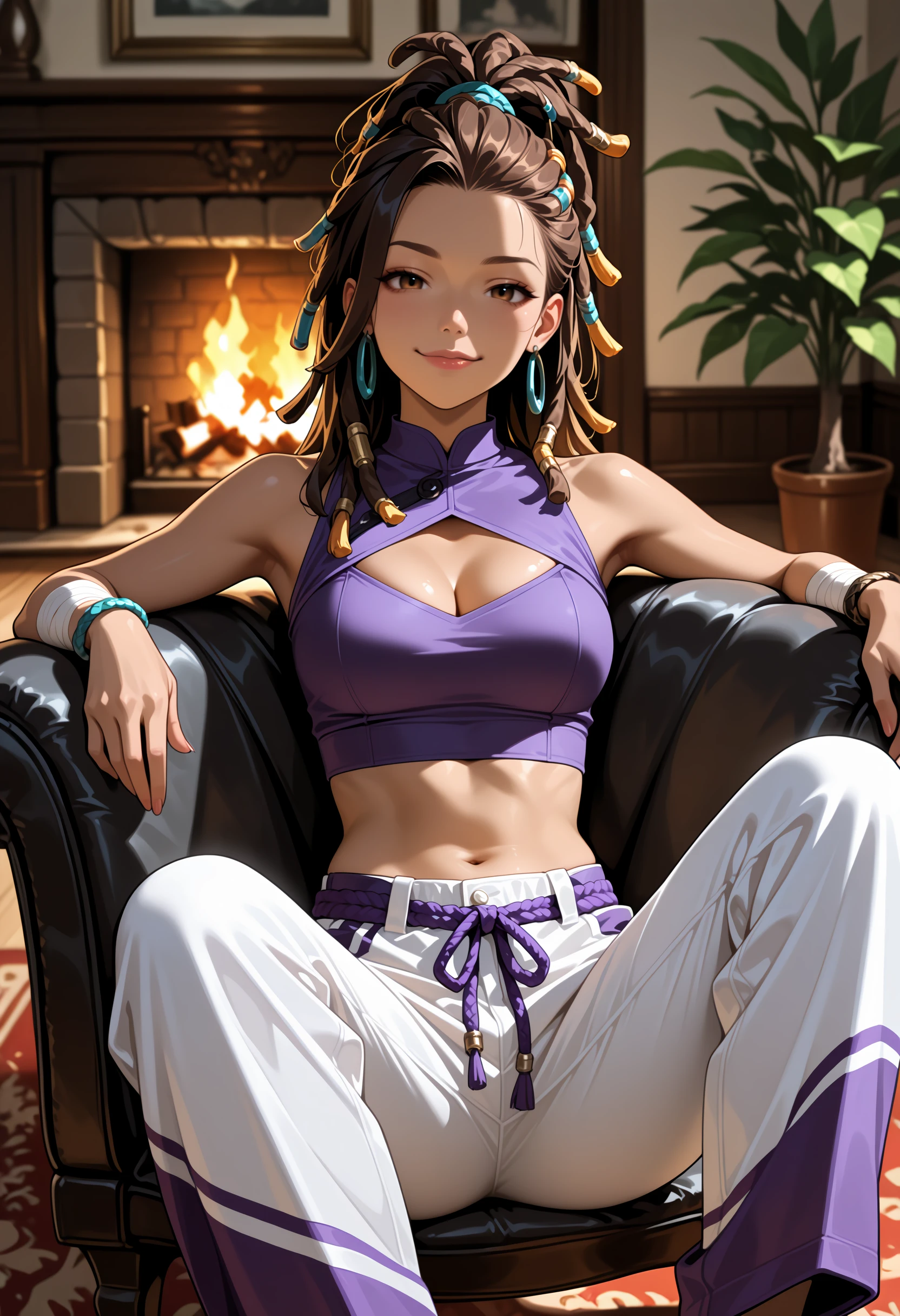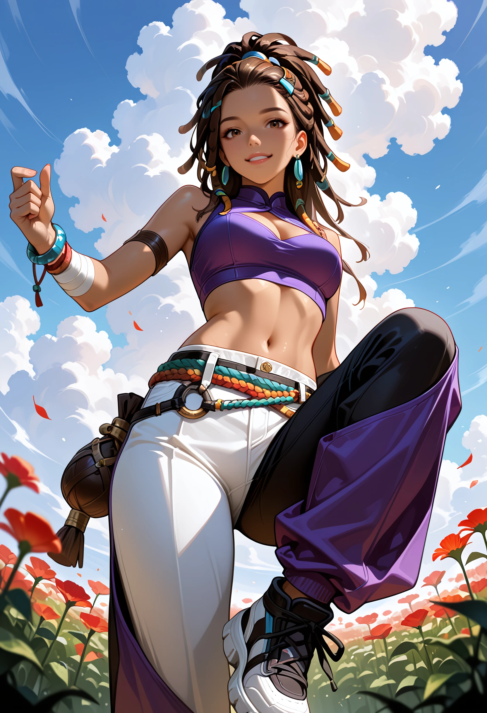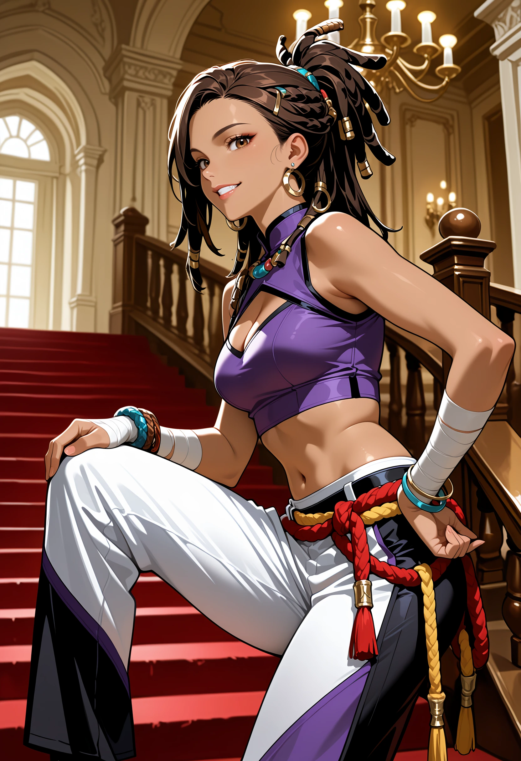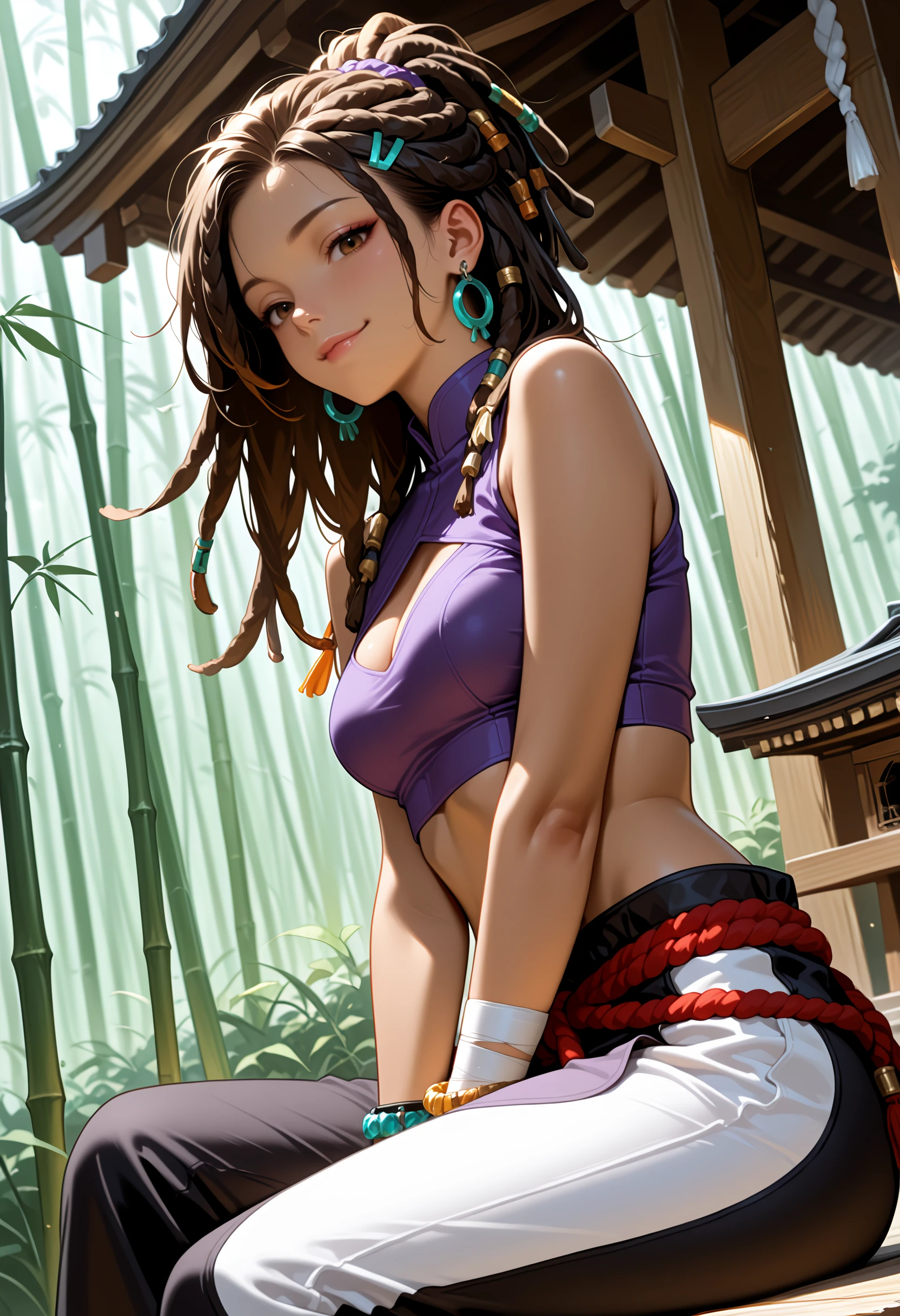 hair ornament, arm wrap, navel, jewelry, multicolored pants, purple pants, black pants, midriff, crop top, bracelet, cleavage cutout, rope, white pants, dreadlocks, purple shirt, hair tie, earrings,