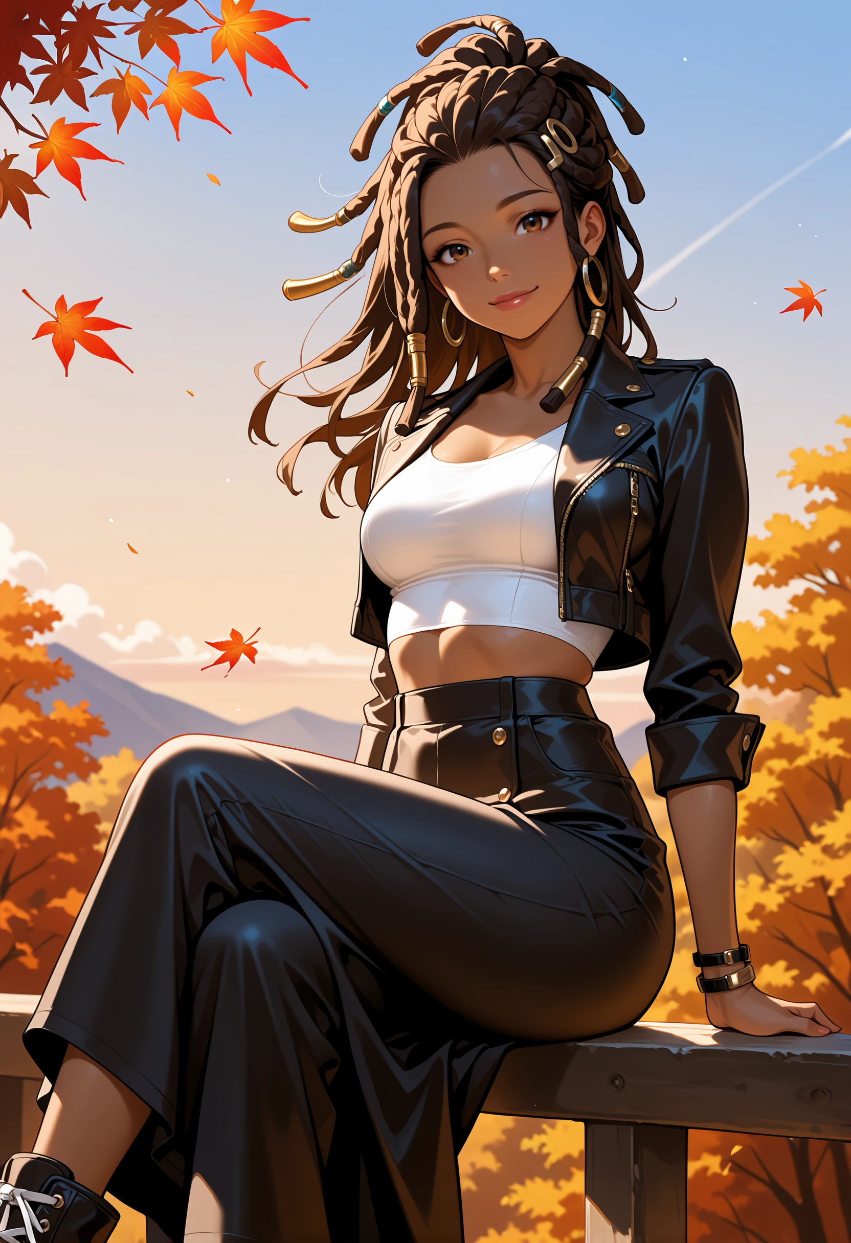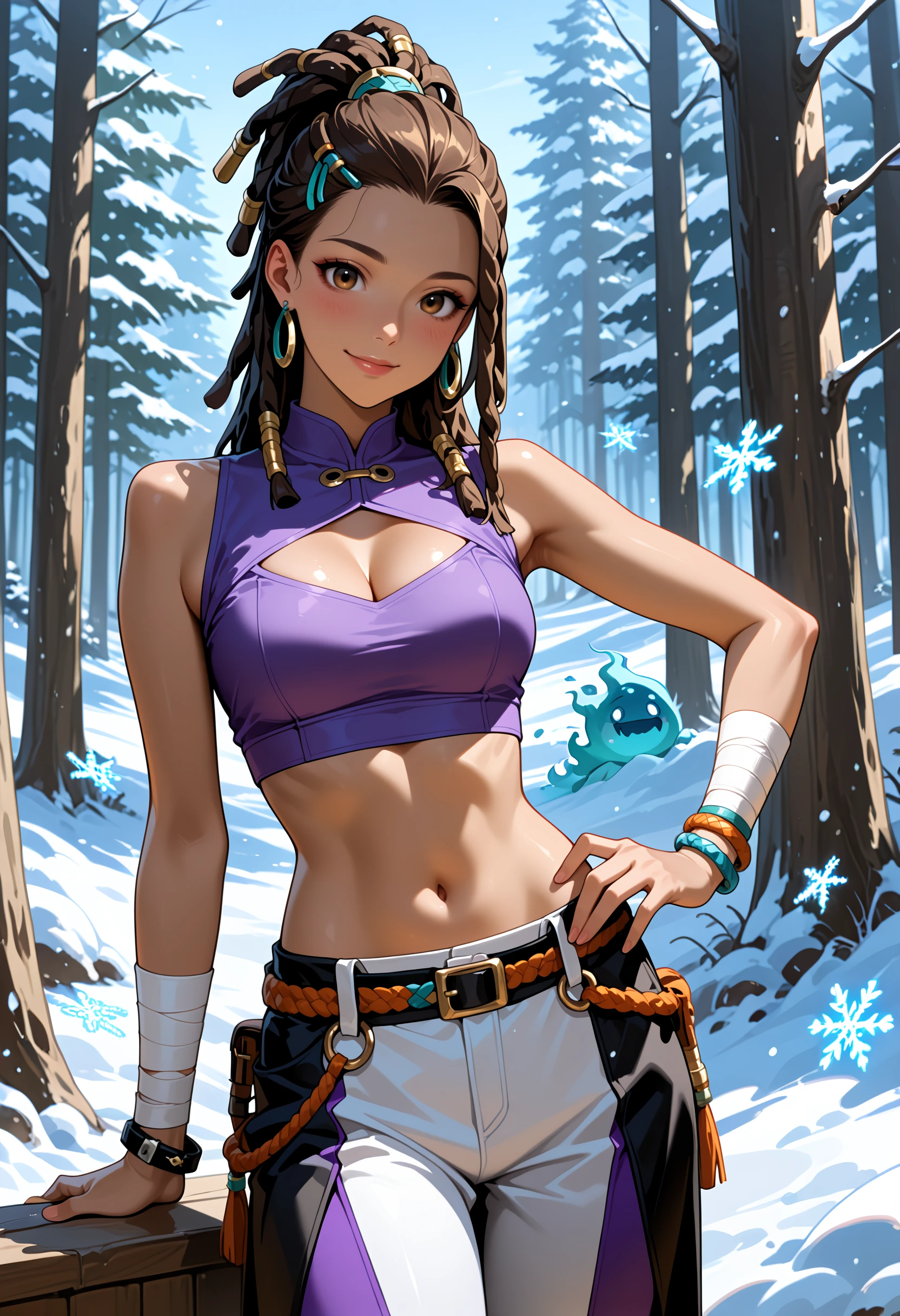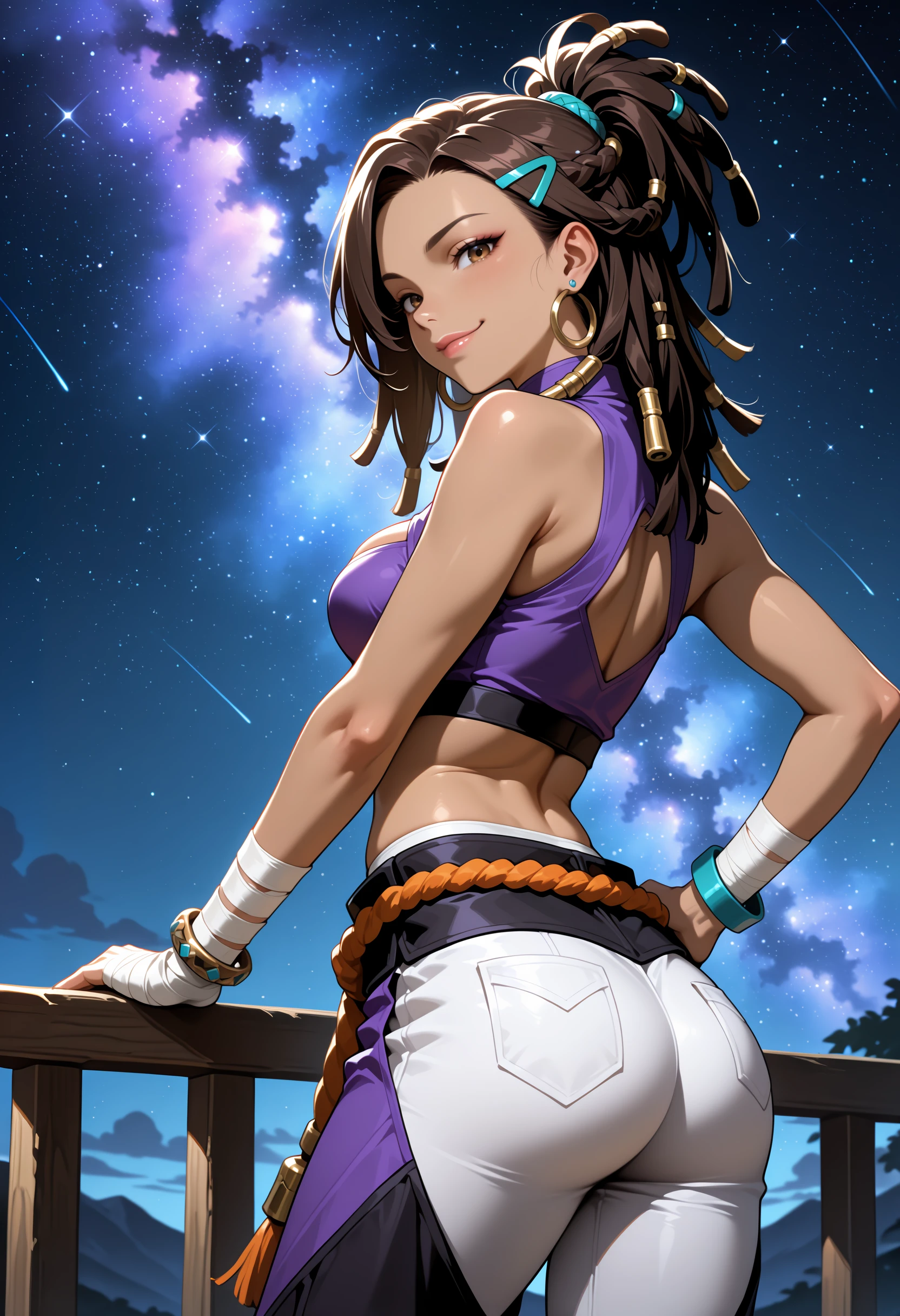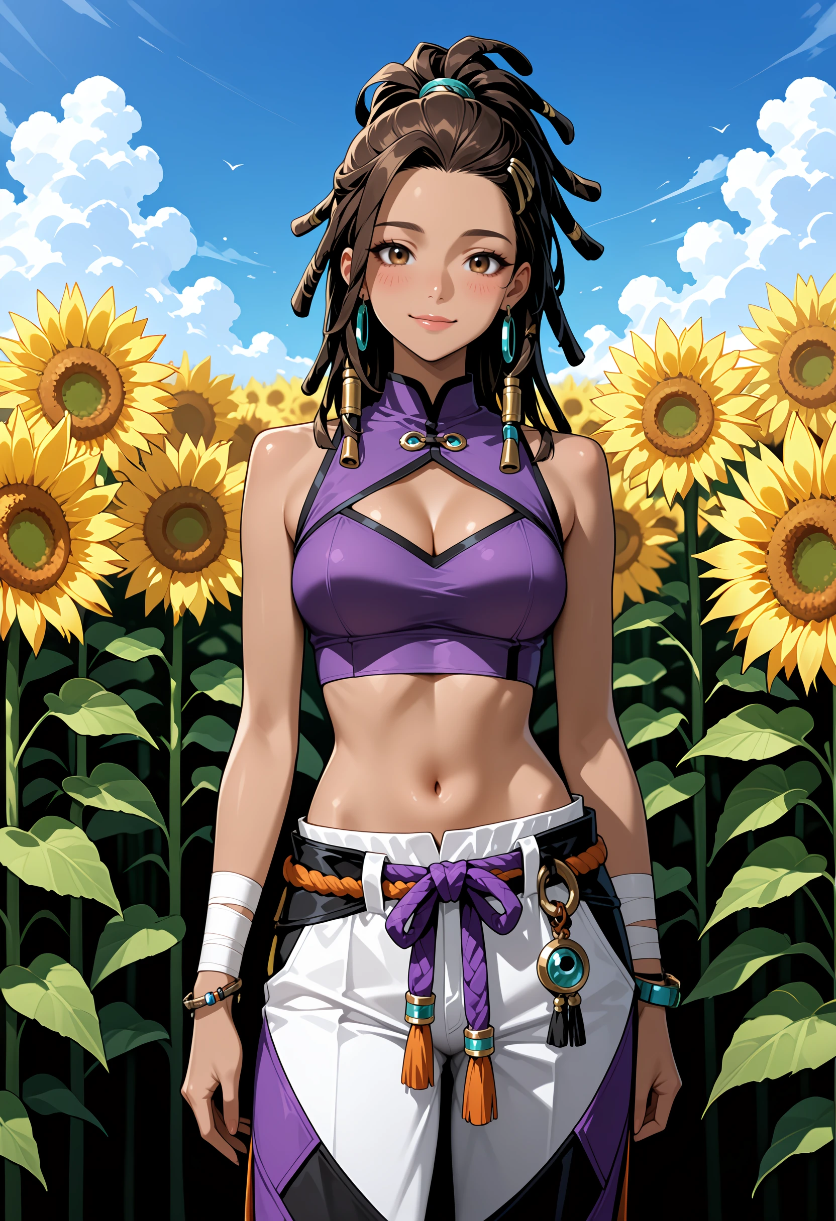 hair ornament, arm wrap, navel, jewelry, multicolored pants, purple pants, black pants, midriff, crop top, bracelet, cleavage cutout, rope, white pants, dreadlocks, purple shirt, hair tie, earrings,